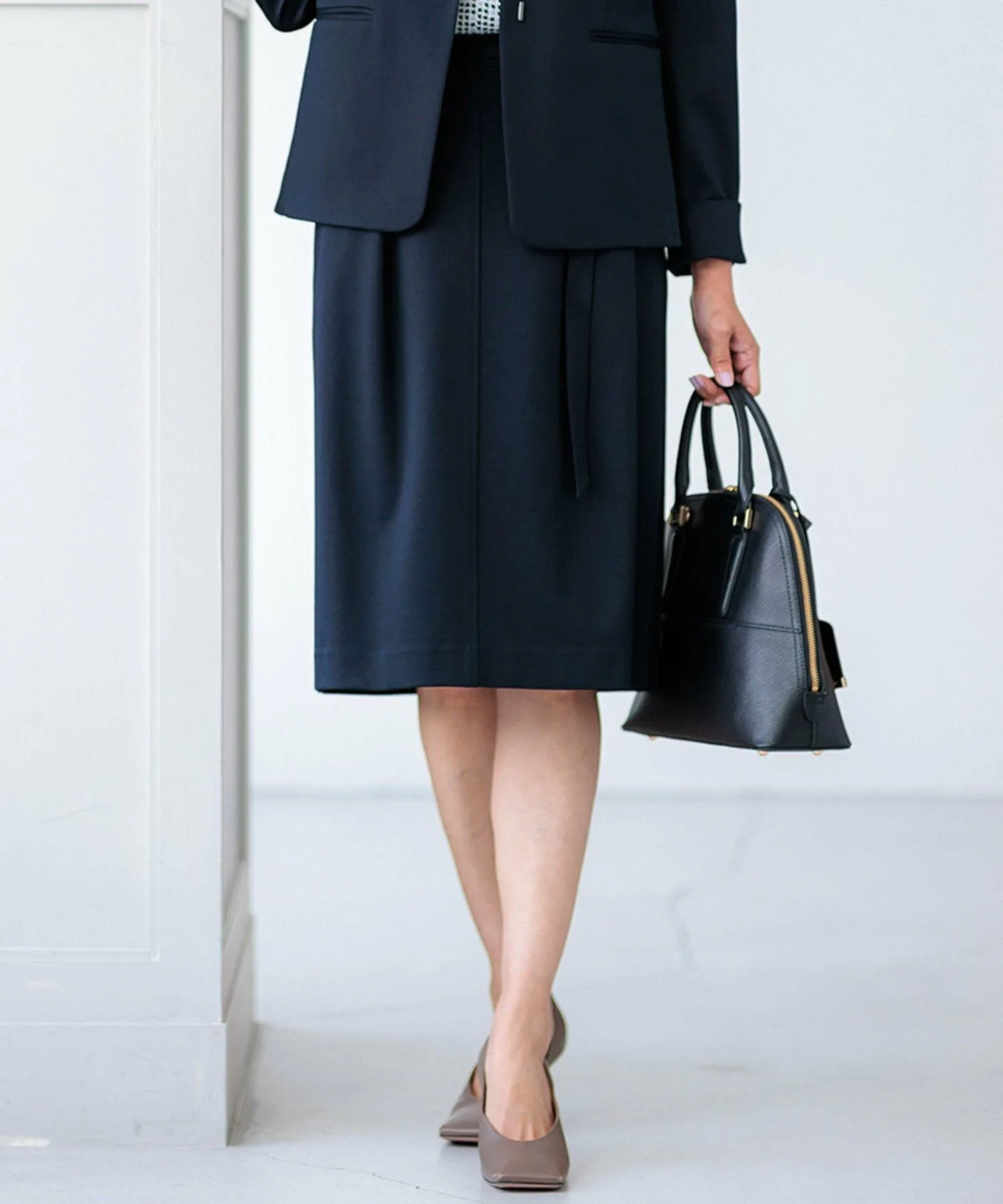 Эта юбка прямого кроя идеально подходит для поездок на работу или официальных мероприятий. Пояс с металлической фурнитурой подчеркивает талию, создавая простой, но уникальный образ. Эластичный материал позволяет сочетать ее с подходящим жакетом. Доступна в универсальном темно-синем цвете (#075).