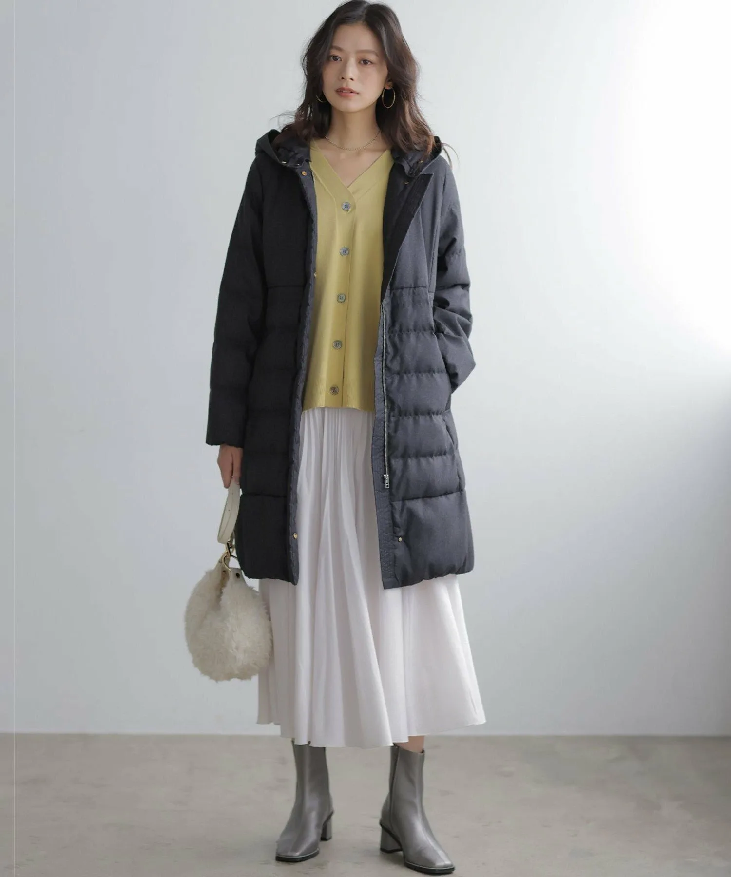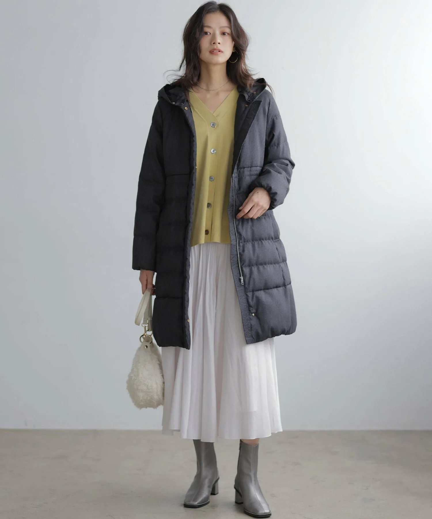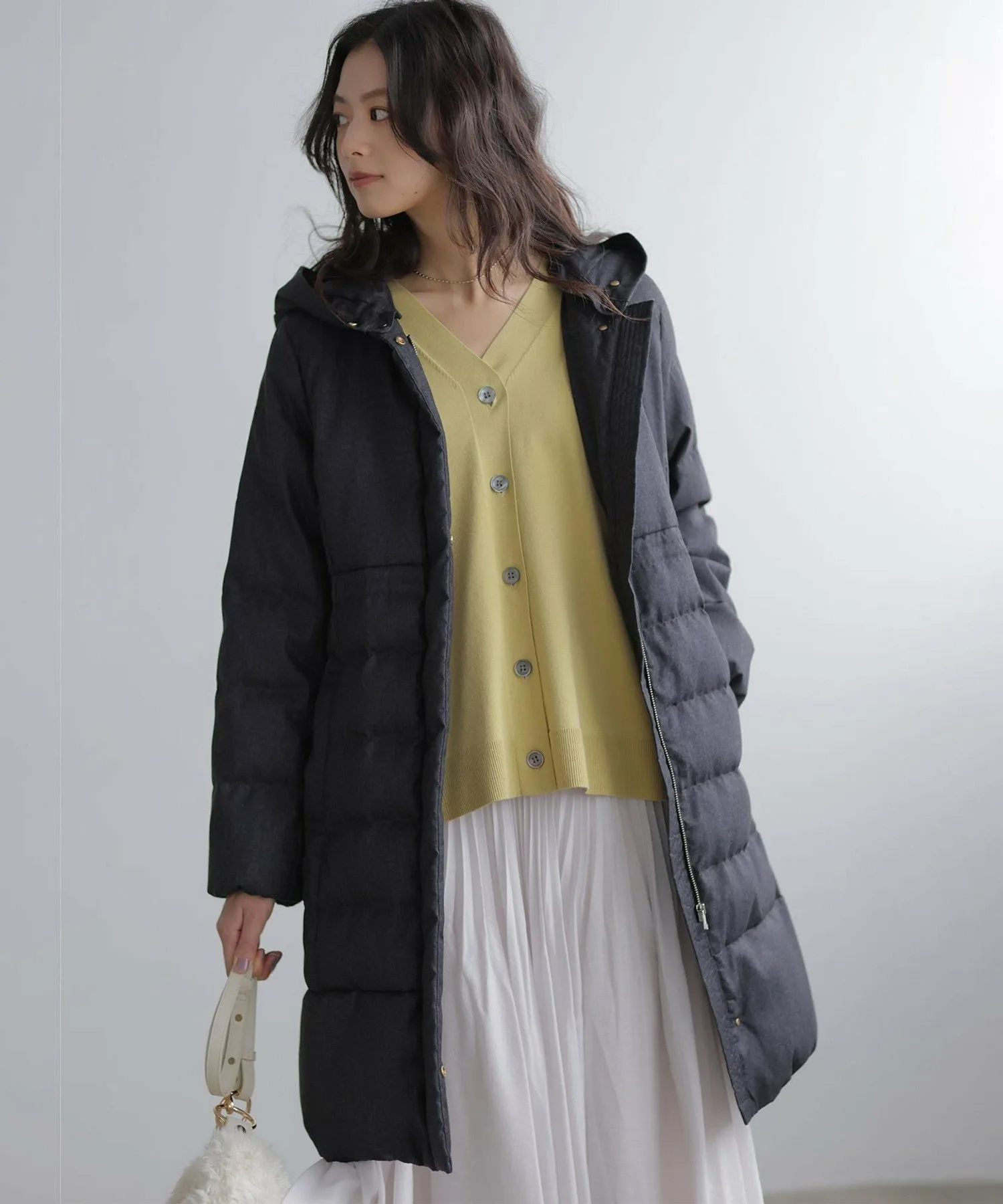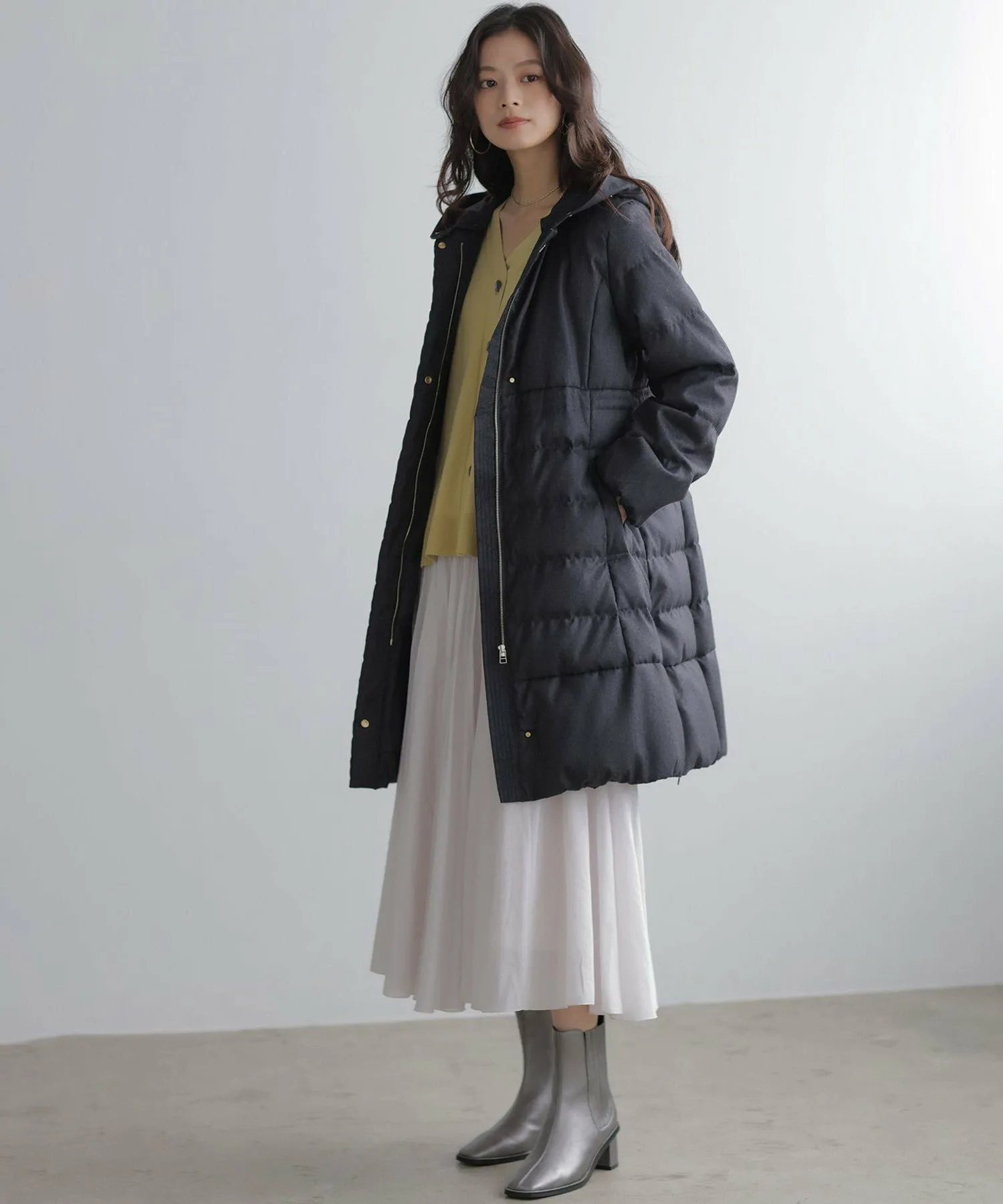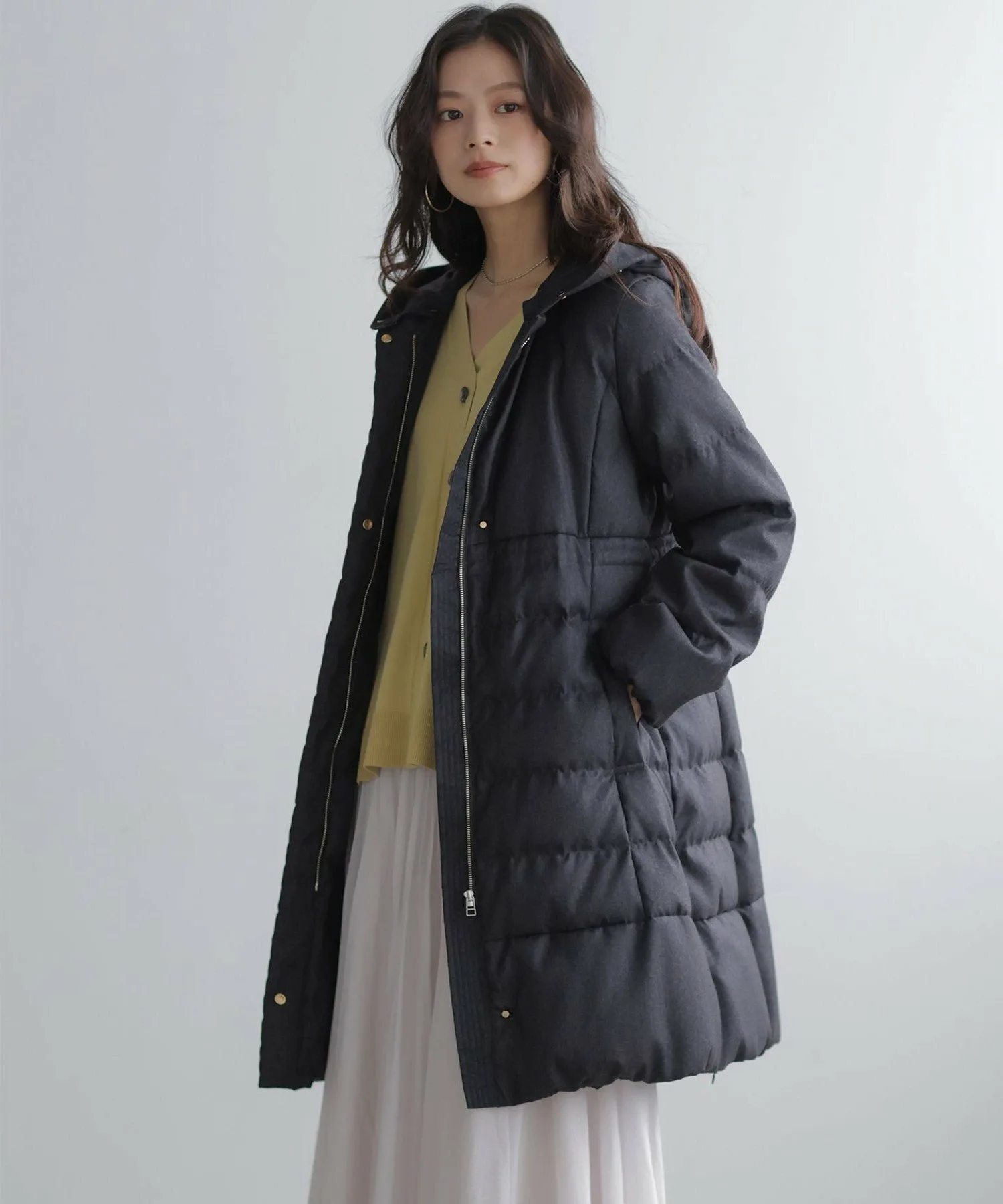 Дизайн・Легкая и теплая, эта длинная пуховая куртка — популярный товар каждый год, отличающийся тщательно продуманным силуэтом, плавно изгибающимся к талии. ・Верхняя часть плоская и не имеет швов, что создает не слишком повседневный образ. ・Горизонтальная строчка идет от чуть выше талии до низа, сужаясь к талии для создания стройного, привлекательного силуэта. ・Длина комфортно закрывает бедра, обеспечивая отличное тепло. ・Расстегните боковую молнию как разрез, чтобы легко носить мягкую расклешенную юбку и максимально свободно двигать ногами. ・Трехмерный, обволакивающий капюшон создает аккуратный, элегантный вид вокруг лица. ・Капюшон съемный, поэтому вы можете носить куртку как пальто без воротника. • Открытый вырез горловины идеально дополняет мех и палантины. Материал: • Цвета 003, 005, 030 (однотонная тафта): Плотная тканая тафта с гладкой поверхностью и глянцевым блеском. Благодаря объему нитей она легкая и мягкая на ощупь. • Цвета 575, 504 (твидовая): Ткань в елочку, сотканная из серых и белых нитей, с принтом, напоминающим твид, который добавляет глубины. Поверхность слегка обработана щеткой для создания теплого, похожего на шерсть ощущения и изысканной, трехмерной мягкости, при этом сохраняя легкость, которую трудно достичь с шерстью.