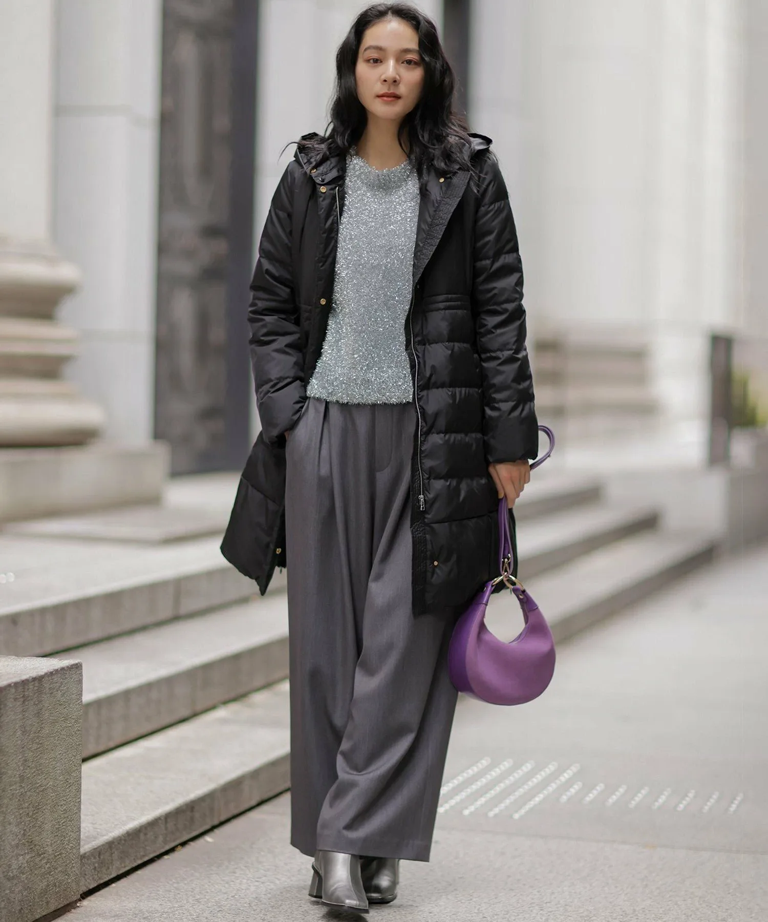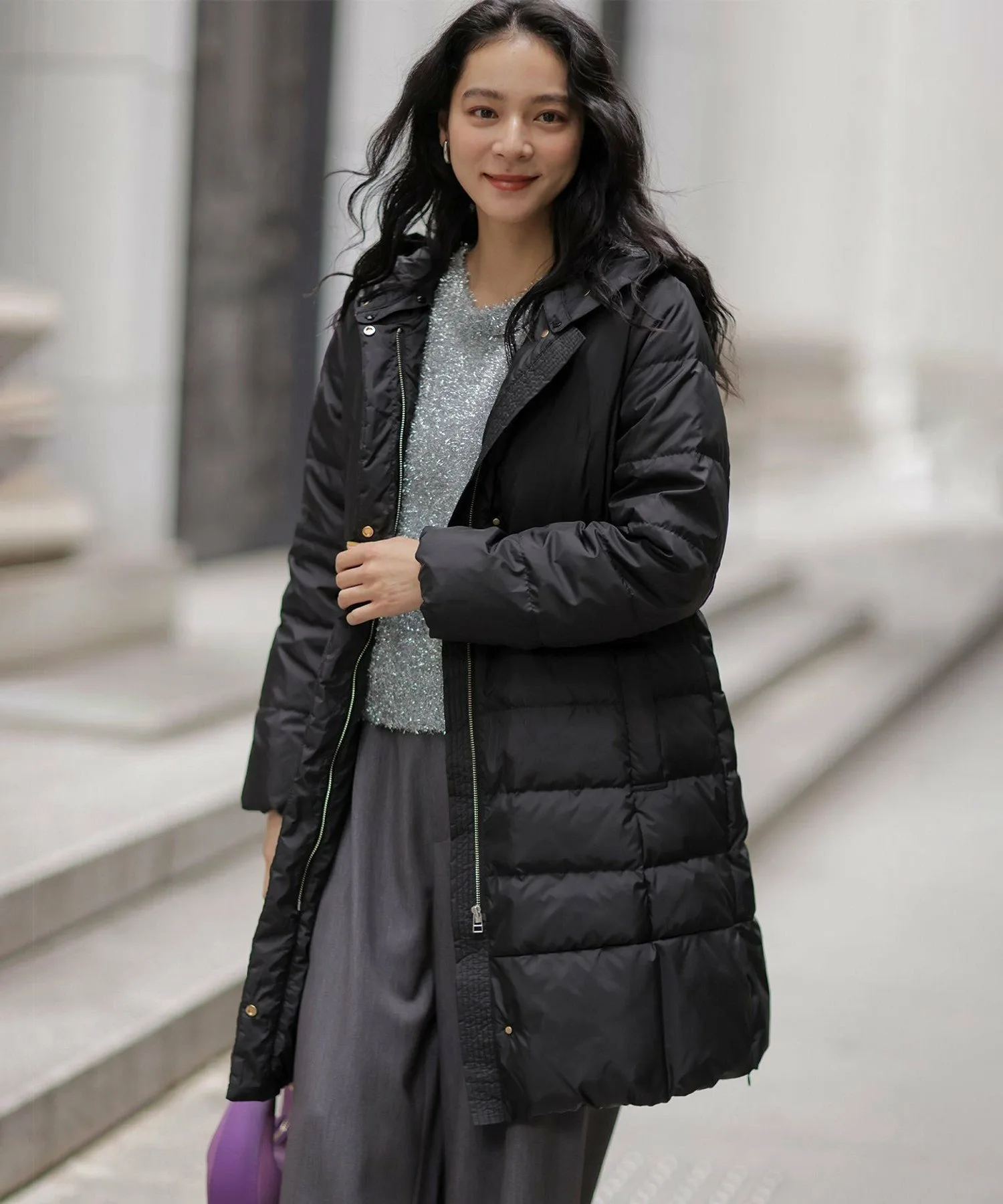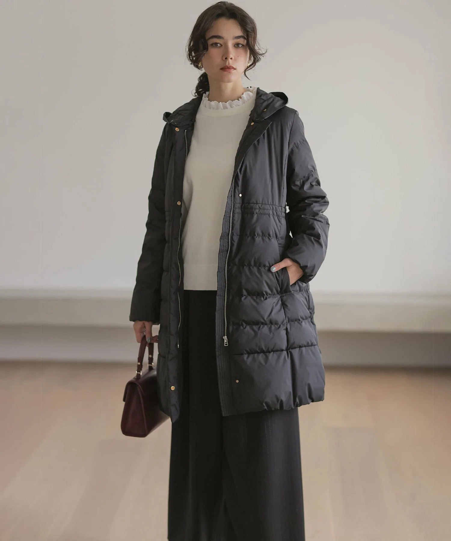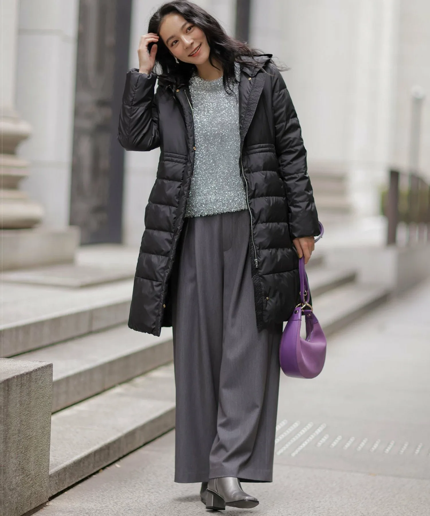 Дизайн・Легкая и теплая, эта длинная пуховая куртка — популярный товар каждый год, отличающийся тщательно продуманным силуэтом, плавно изгибающимся к талии. ・Верхняя часть плоская и не имеет швов, что создает не слишком повседневный образ. ・Горизонтальная строчка идет от чуть выше талии до низа, сужаясь к талии для создания стройного, привлекательного силуэта. ・Длина комфортно закрывает бедра, обеспечивая отличное тепло. ・Расстегните боковую молнию как разрез, чтобы легко носить мягкую расклешенную юбку и максимально свободно двигать ногами. ・Трехмерный, обволакивающий капюшон создает аккуратный, элегантный вид вокруг лица. ・Капюшон съемный, поэтому вы можете носить куртку как пальто без воротника. • Открытый вырез горловины идеально дополняет мех и палантины. Материал: • Цвета 003, 005, 030 (однотонная тафта): Плотная тканая тафта с гладкой поверхностью и глянцевым блеском. Благодаря объему нитей она легкая и мягкая на ощупь. • Цвета 575, 504 (твидовая): Ткань в елочку, сотканная из серых и белых нитей, с принтом, напоминающим твид, который добавляет глубины. Поверхность слегка обработана щеткой для создания теплого, похожего на шерсть ощущения и изысканной, трехмерной мягкости, при этом сохраняя легкость, которую трудно достичь с шерстью.