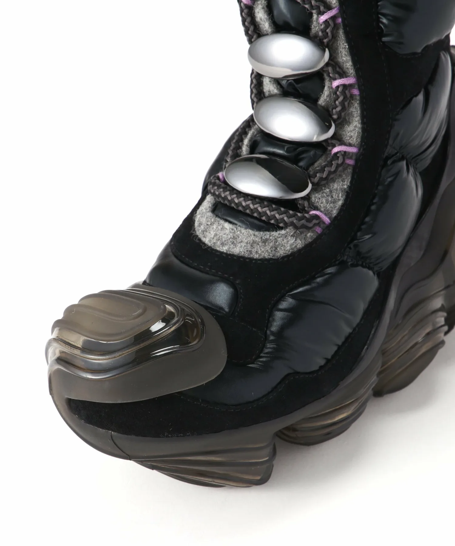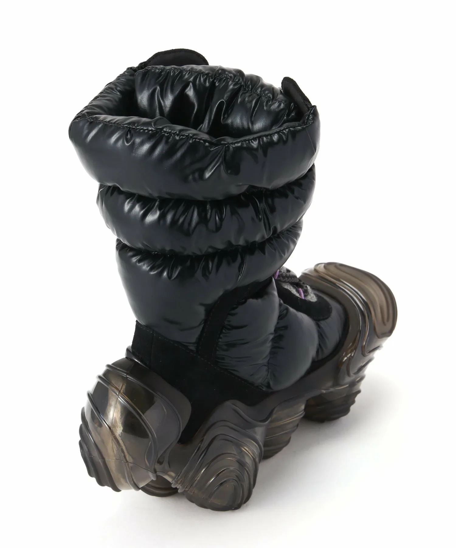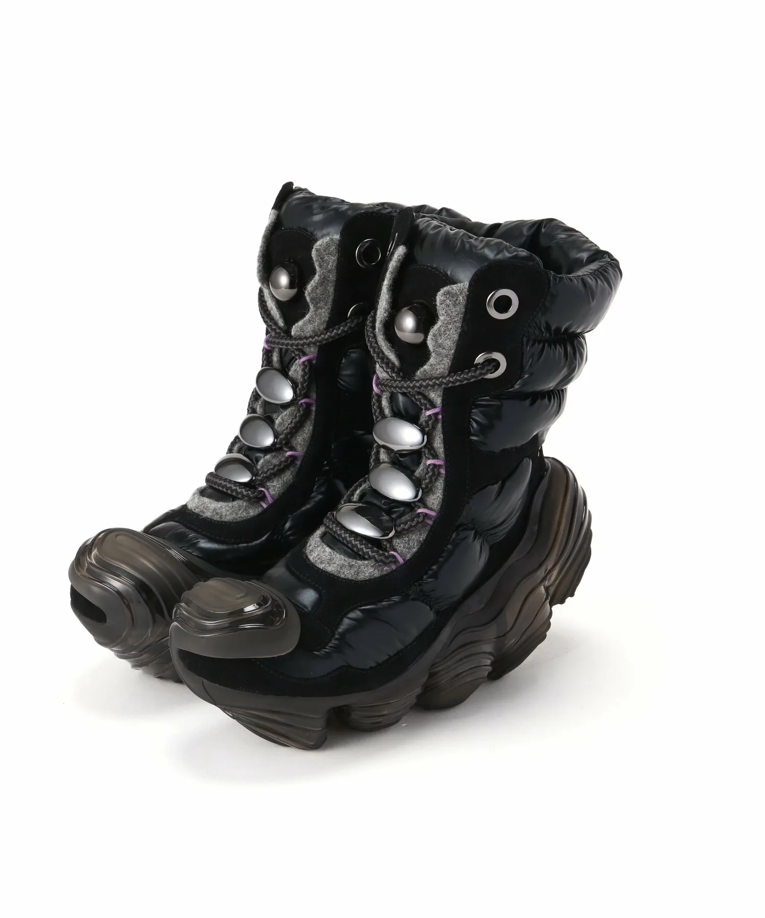 Верх сохраняет вид высоких функциональных ботинок, используемых на тропах в холодных регионах, и изготовлен из элегантных материалов, что создает общее впечатление изысканности и стиля.