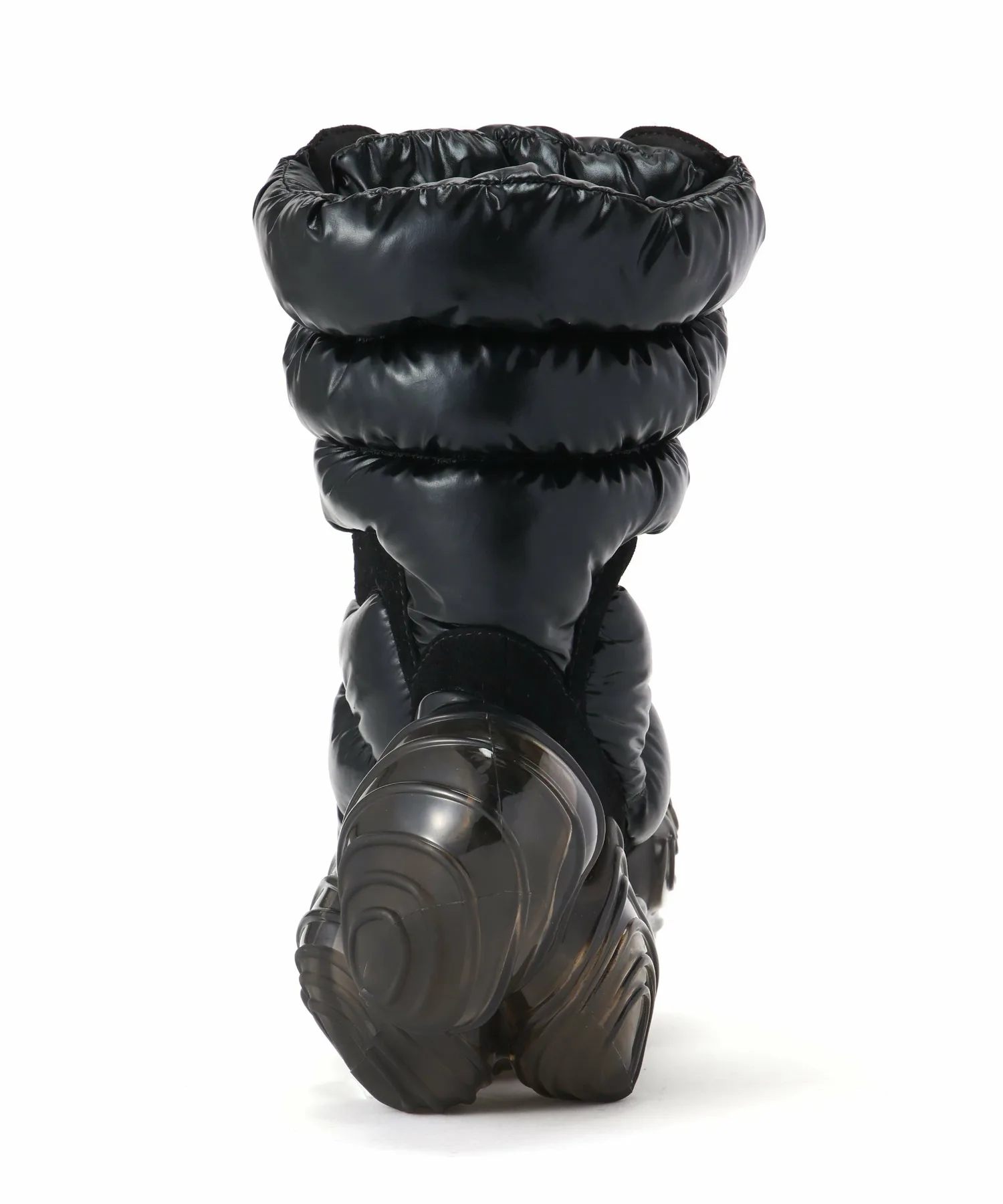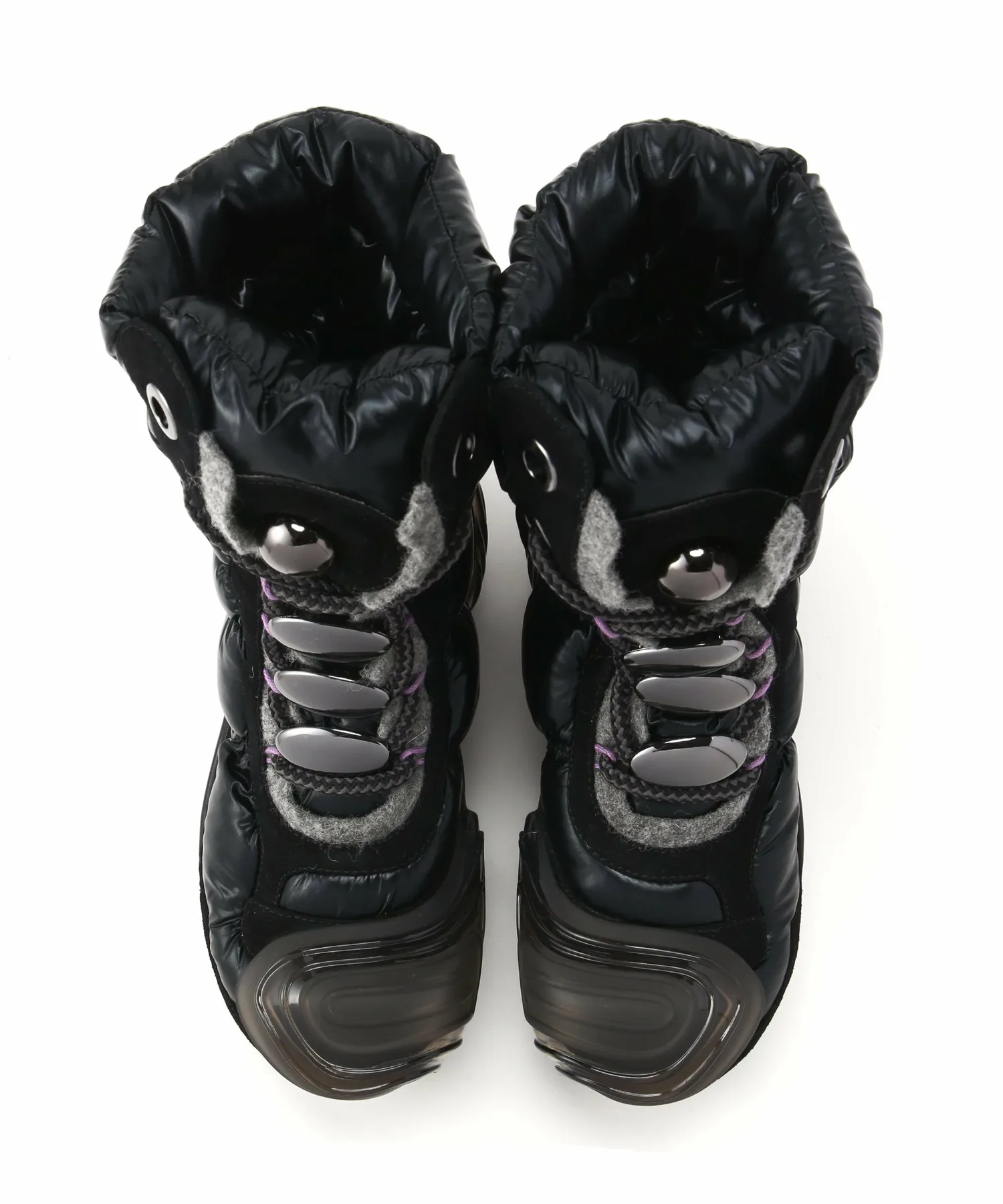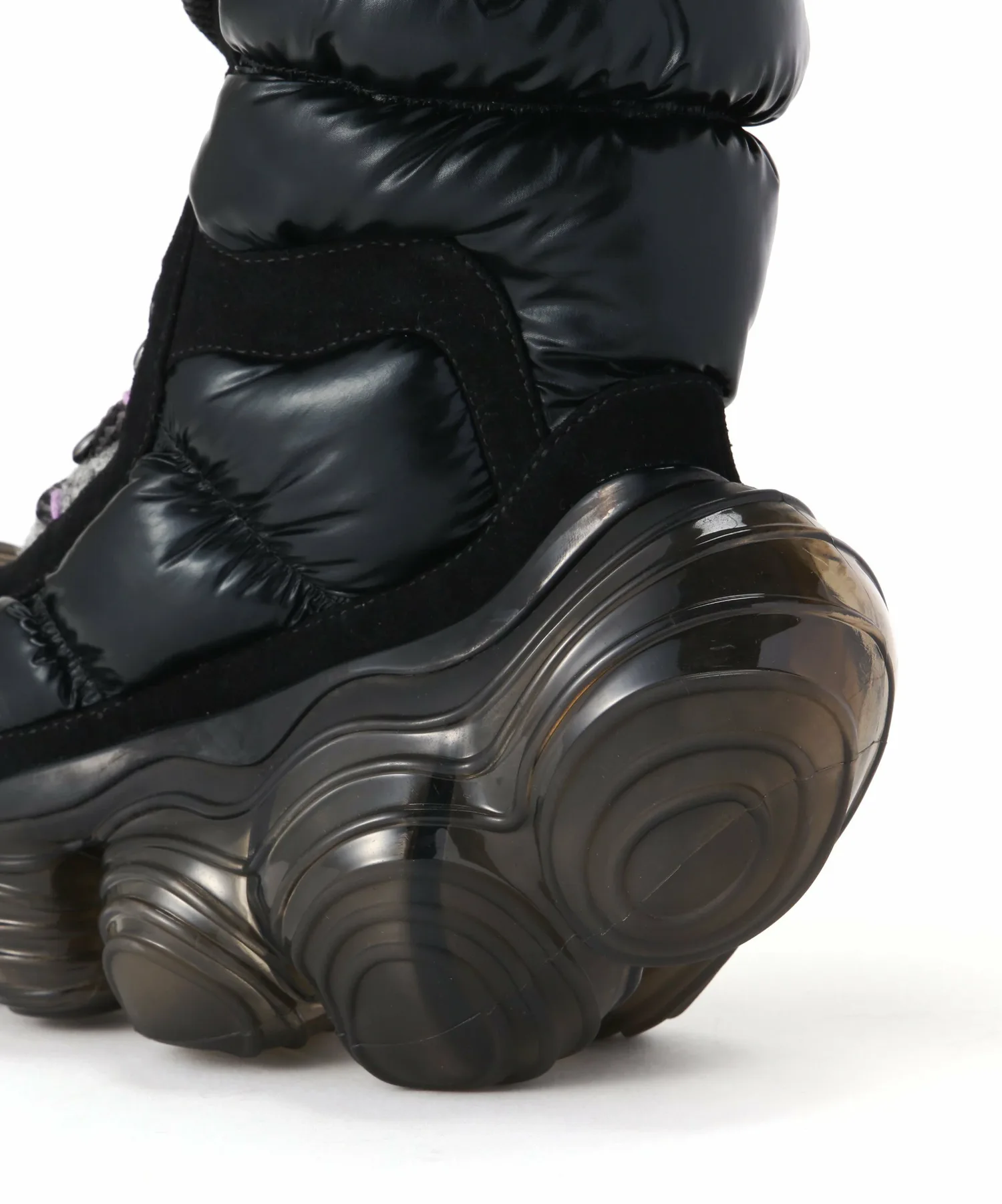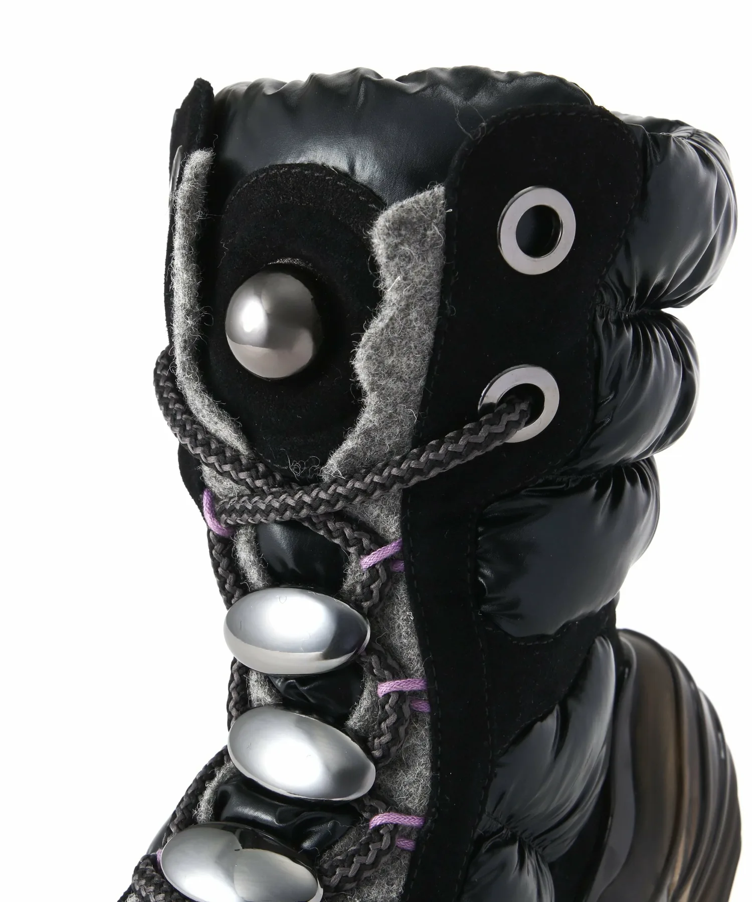 Верх сохраняет вид высоких функциональных ботинок, используемых на тропах в холодных регионах, и изготовлен из элегантных материалов, что создает общее впечатление изысканности и стиля.