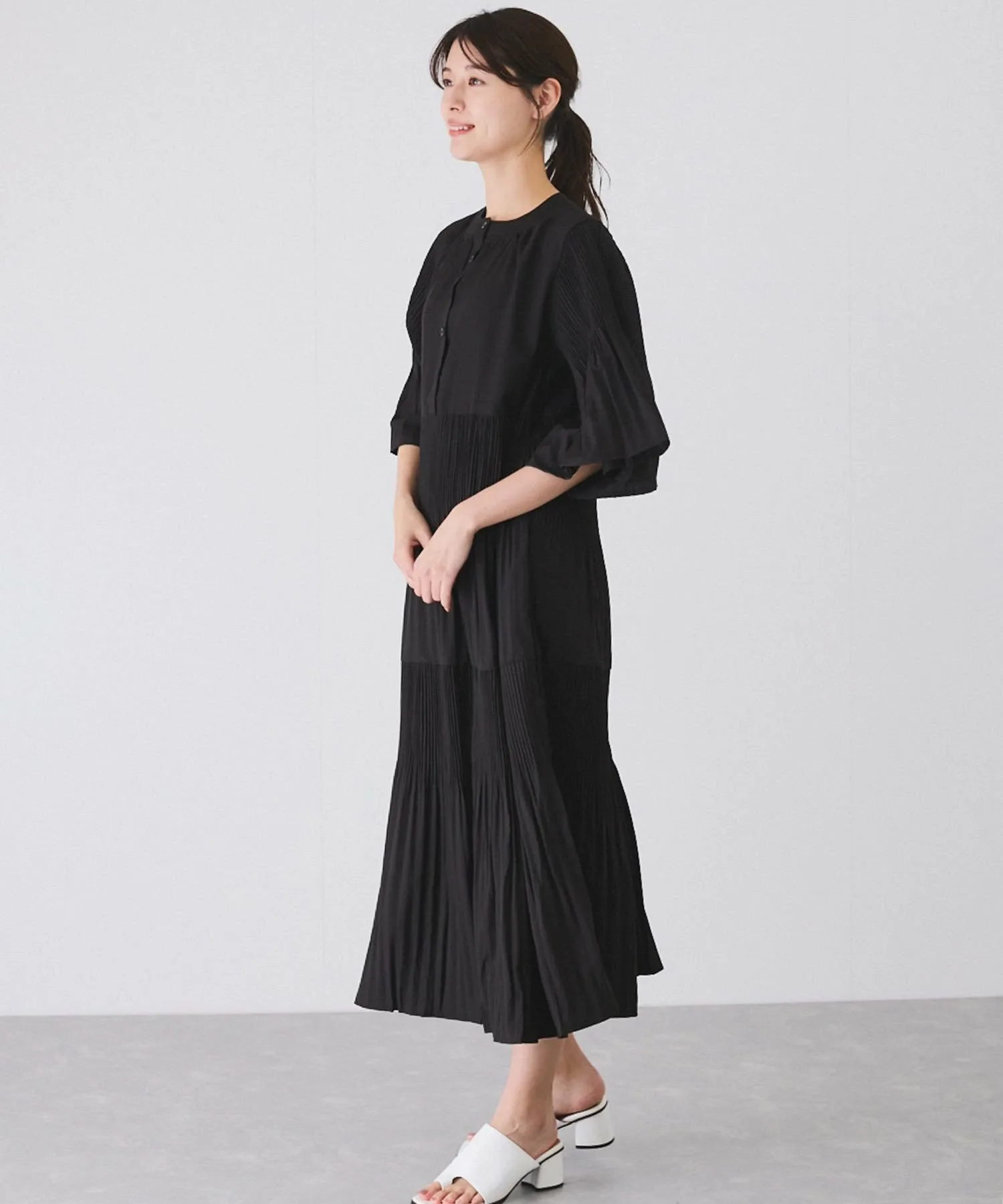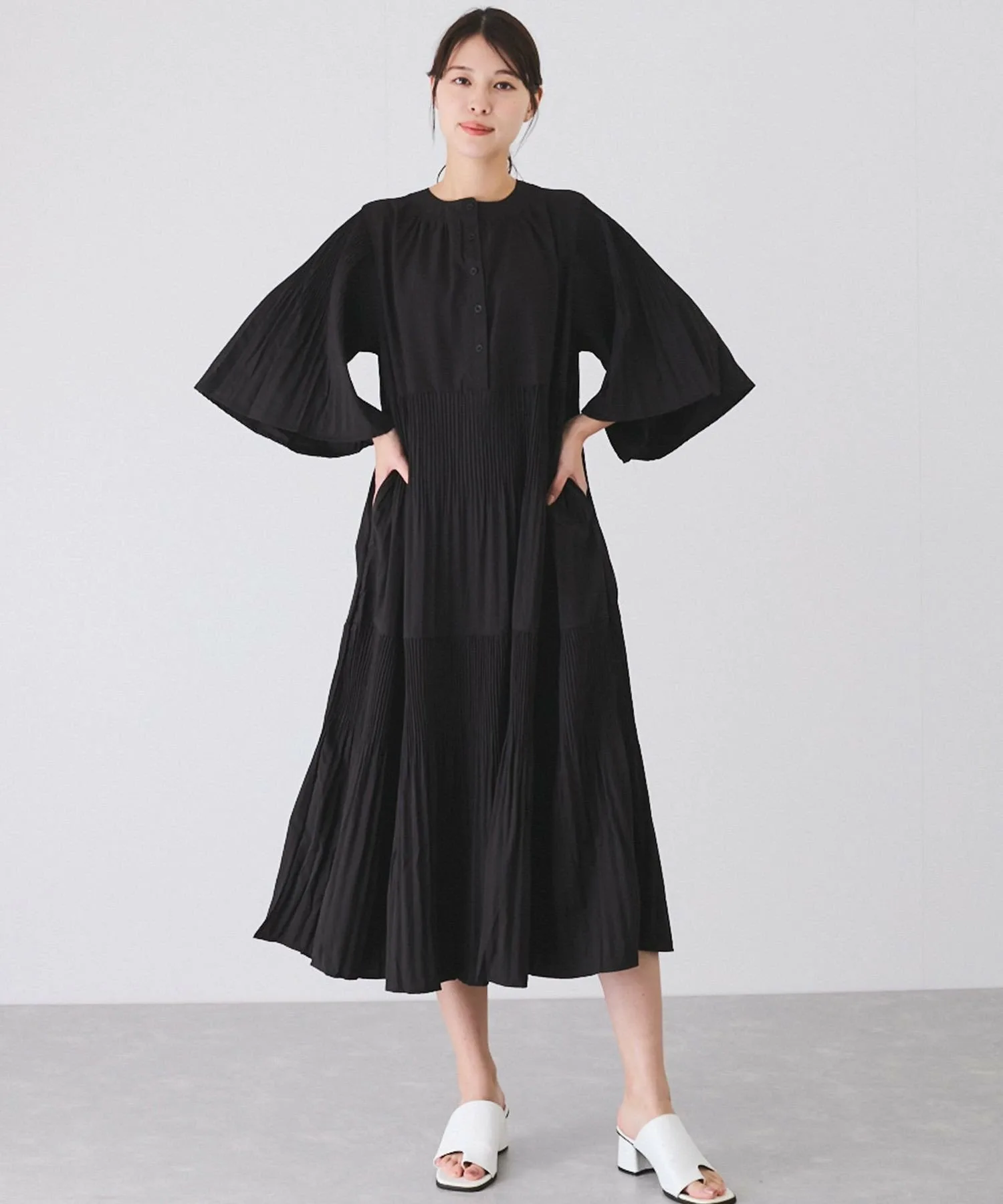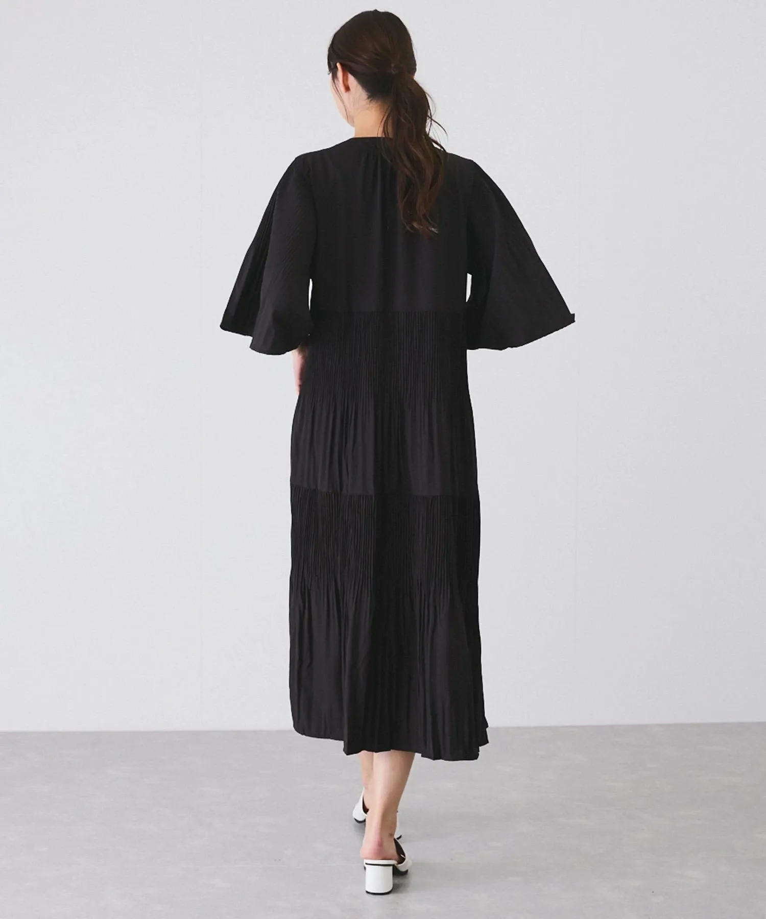 Платье с плиссированными рукавами и юбкой.