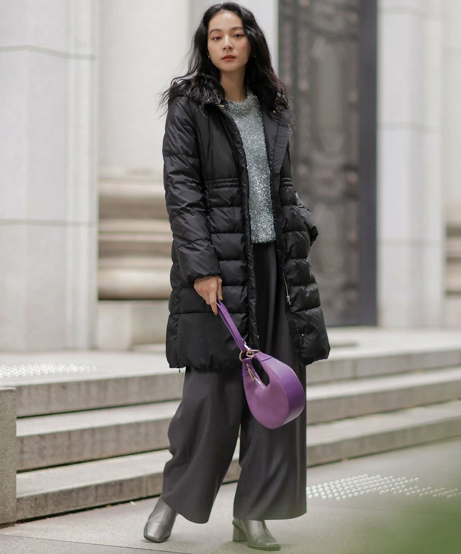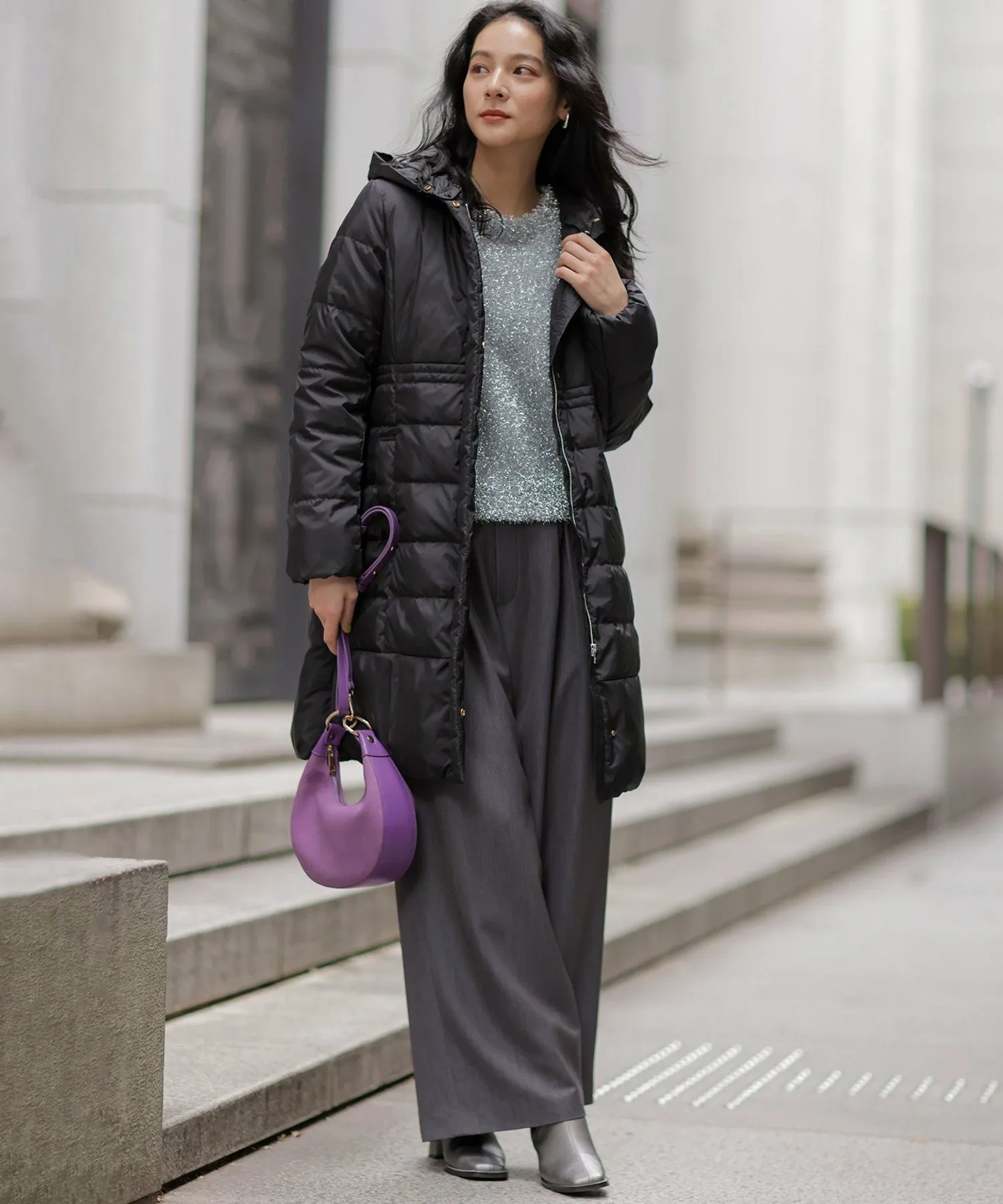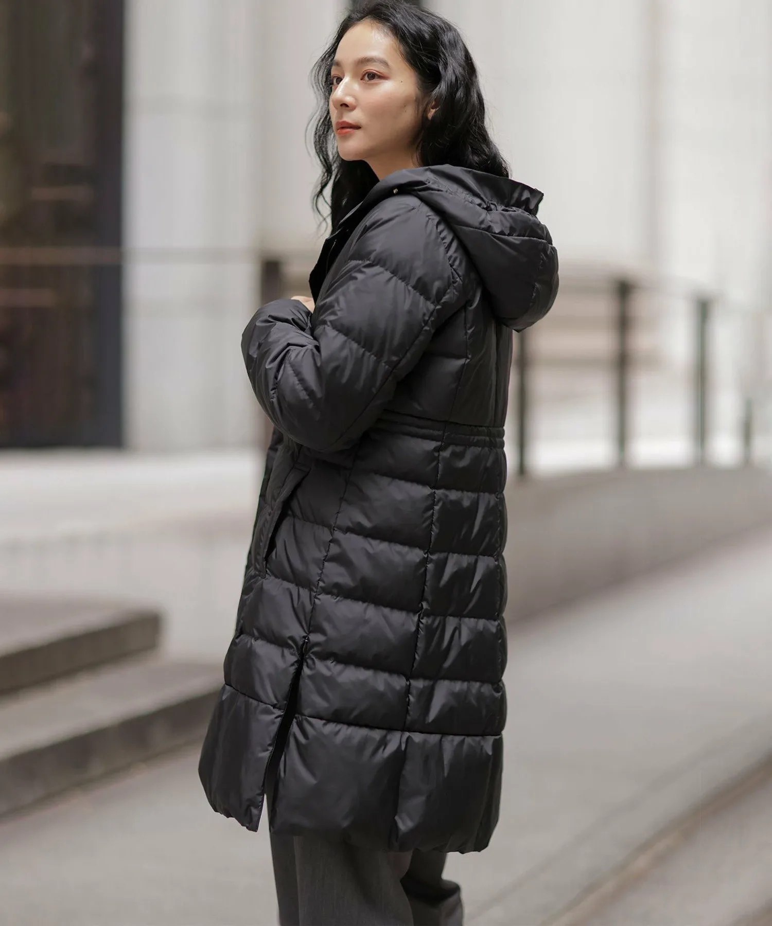 Дизайн・Легкая и теплая, эта длинная пуховая куртка — популярный товар каждый год, отличающийся тщательно продуманным силуэтом, плавно изгибающимся к талии. ・Верхняя часть плоская и не имеет швов, что создает не слишком повседневный образ. ・Горизонтальная строчка идет от чуть выше талии до низа, сужаясь к талии для создания стройного, привлекательного силуэта. ・Длина комфортно закрывает бедра, обеспечивая отличное тепло. ・Расстегните боковую молнию как разрез, чтобы легко носить мягкую расклешенную юбку и максимально свободно двигать ногами. ・Трехмерный, обволакивающий капюшон создает аккуратный, элегантный вид вокруг лица. ・Капюшон съемный, поэтому вы можете носить куртку как пальто без воротника. • Открытый вырез горловины идеально дополняет мех и палантины. Материал: • Цвета 003, 005, 030 (однотонная тафта): Плотная тканая тафта с гладкой поверхностью и глянцевым блеском. Благодаря объему нитей она легкая и мягкая на ощупь. • Цвета 575, 504 (твидовая): Ткань в елочку, сотканная из серых и белых нитей, с принтом, напоминающим твид, который добавляет глубины. Поверхность слегка обработана щеткой для создания теплого, похожего на шерсть ощущения и изысканной, трехмерной мягкости, при этом сохраняя легкость, которую трудно достичь с шерстью.