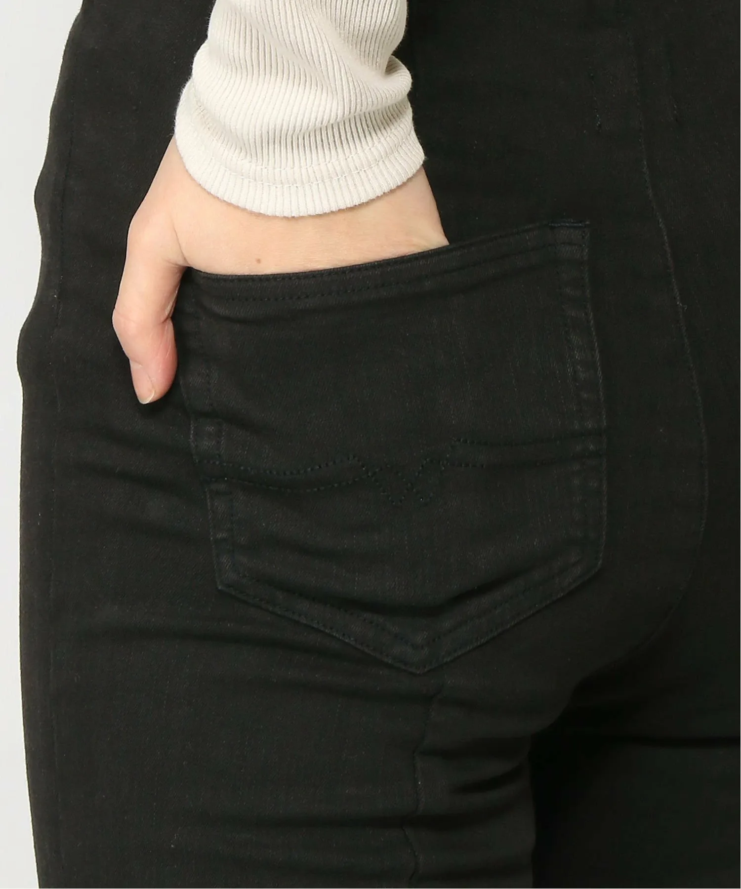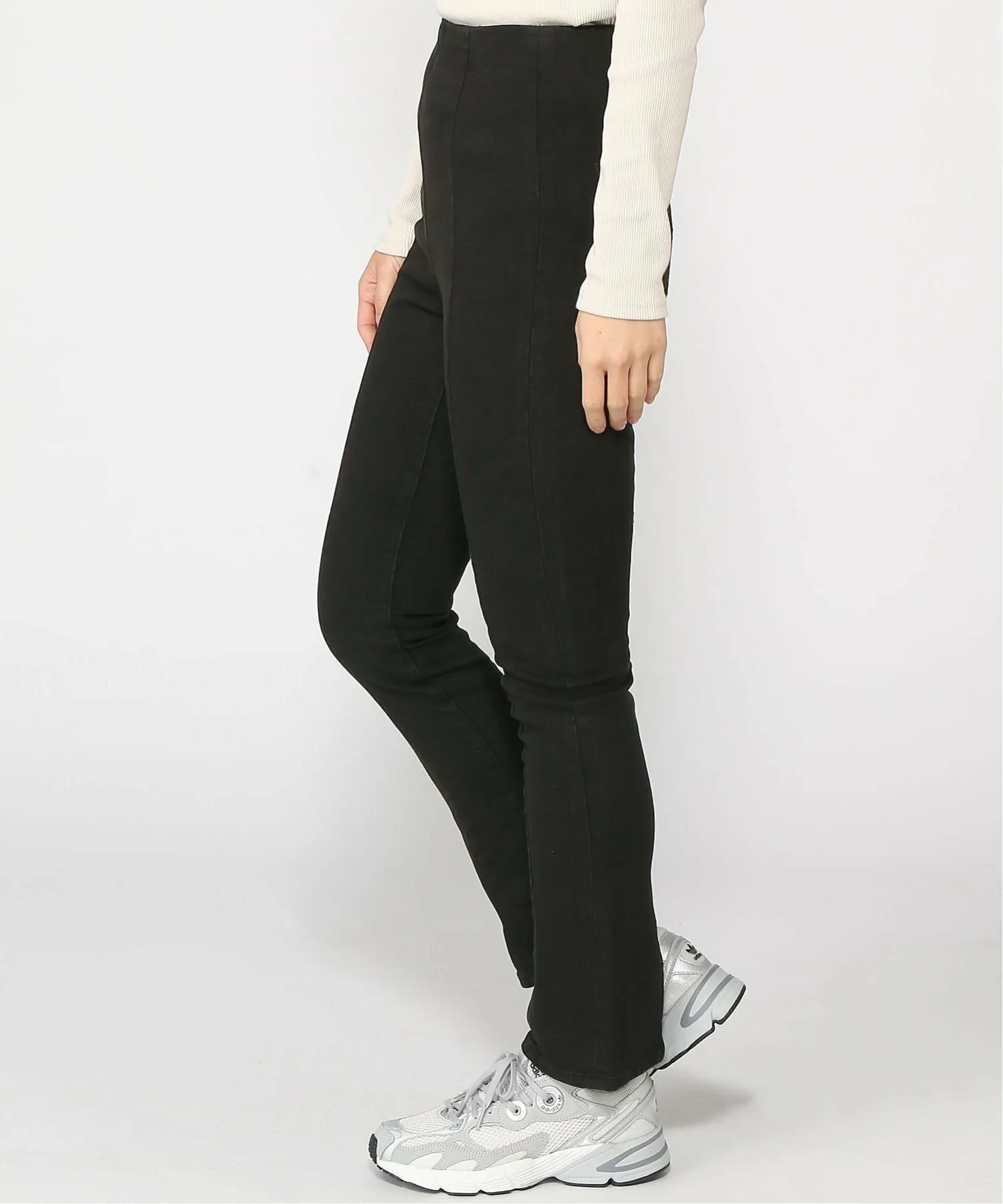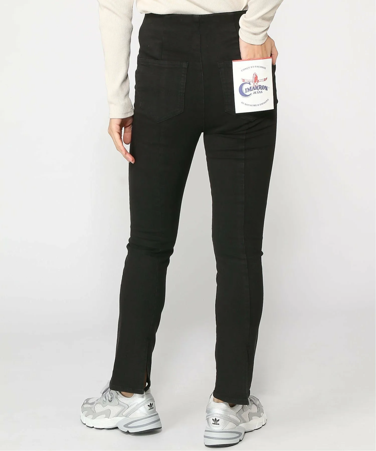 Узкие джинсы с глубокими боковыми разрезами.