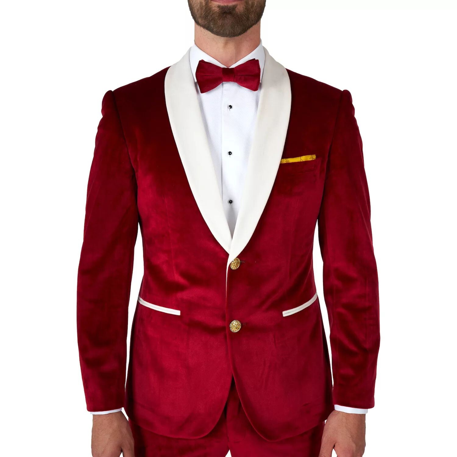 В комплект входят: пиджак, брюки, галстук-бабочка и носовой платок.