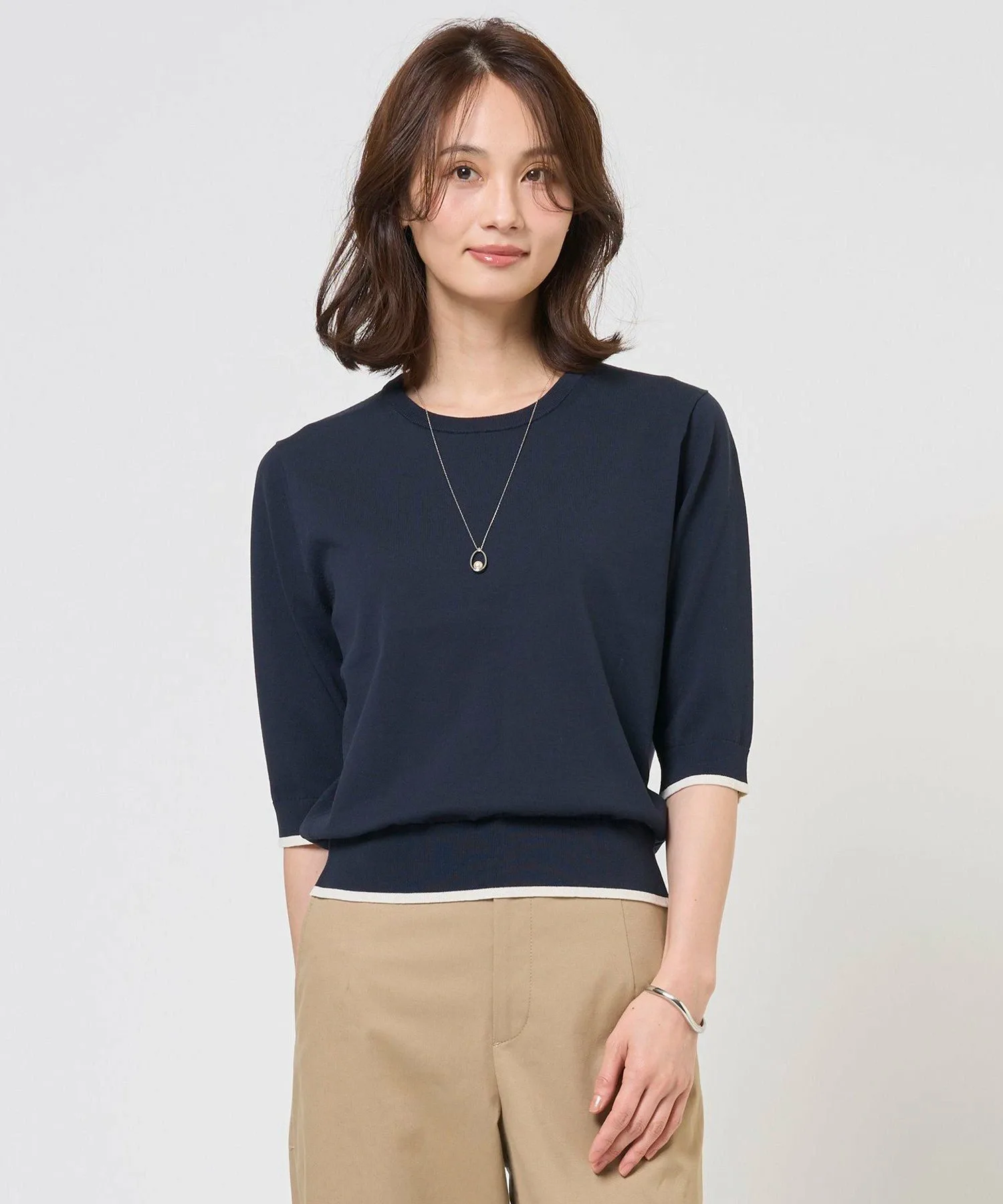 Дизайн: Этот трикотаж с круглым вырезом создает утонченный, солидный образ. Несмотря на простой дизайн, рукава до локтя и общая ширина тщательно сбалансированы, чтобы создать изысканный вид, выгодно подчеркивая верхнюю часть рук. Идеально подходит как самостоятельная вещь, так и в сочетании с кардиганом из того же материала для создания универсального образа. Его универсальность делает его подходящим для широкого круга случаев, от офиса до повседневных прогулок. Доступен в четырех цветах: элегантный и мягкий светло-бежевый (#002), привлекательный розовый (#012), освежающий и интеллектуальный бирюзовый (#072) и шикарный и изысканный темно-синий (#075).