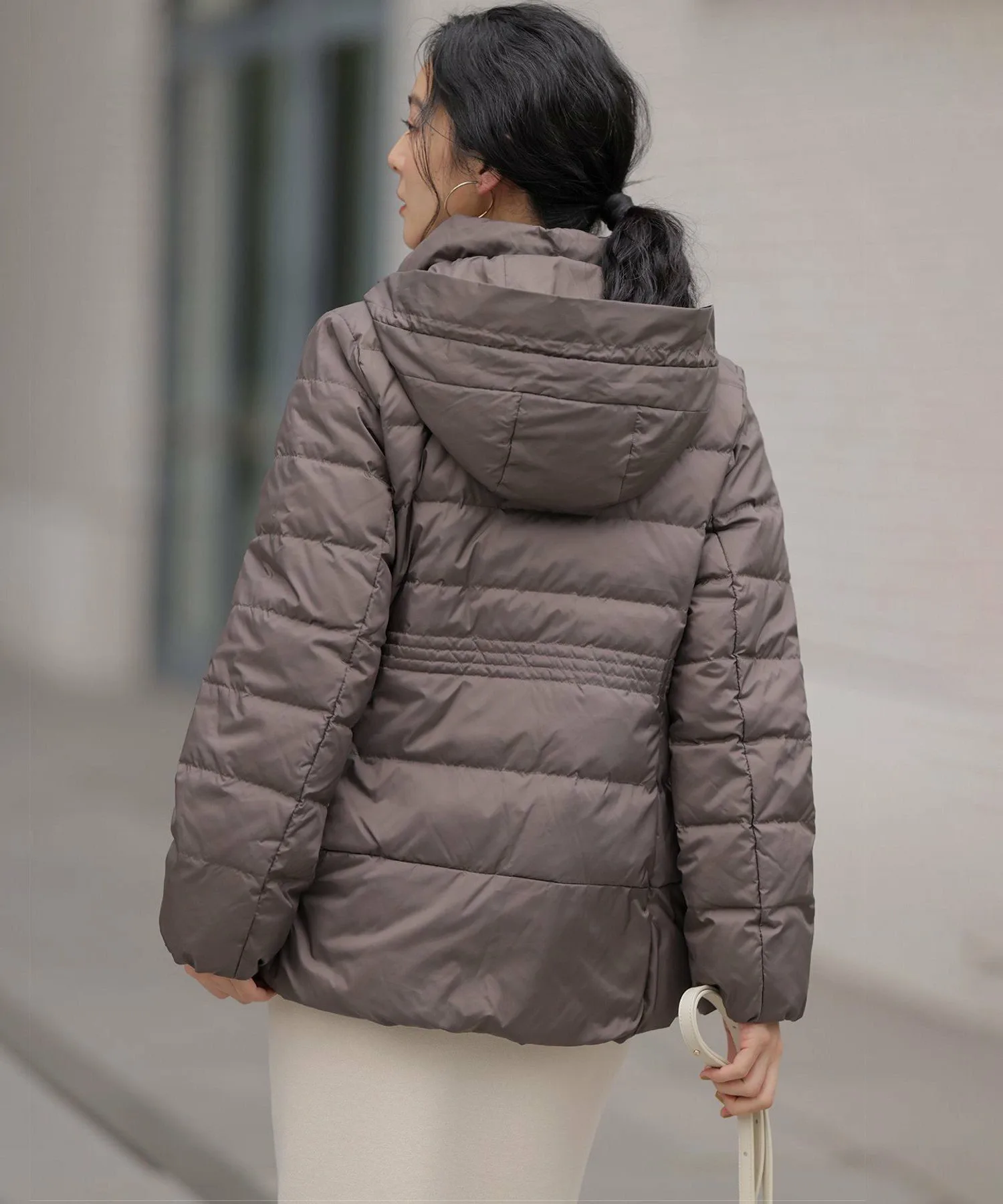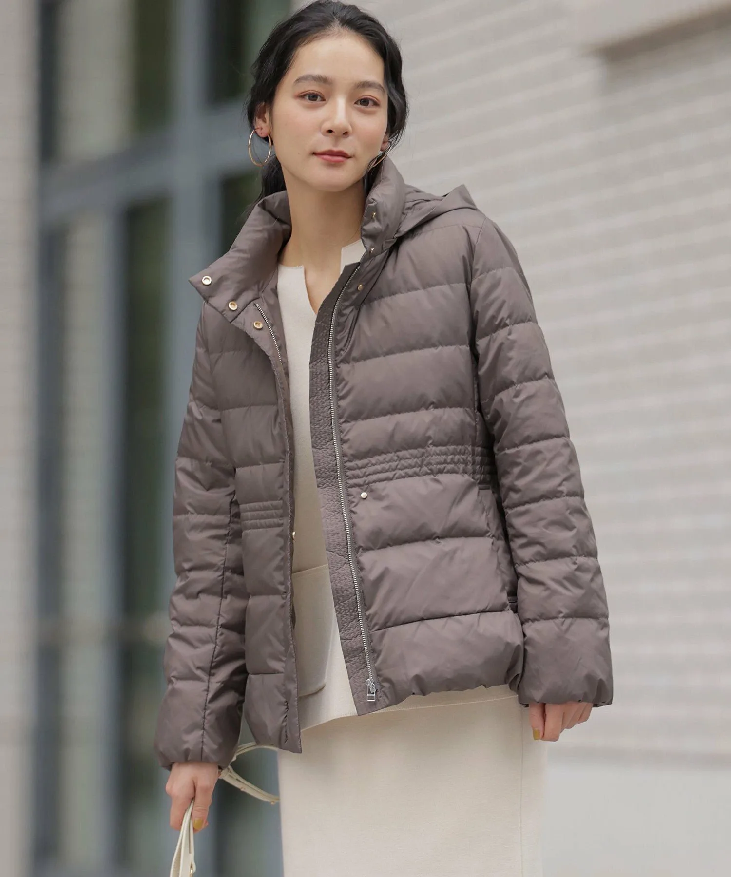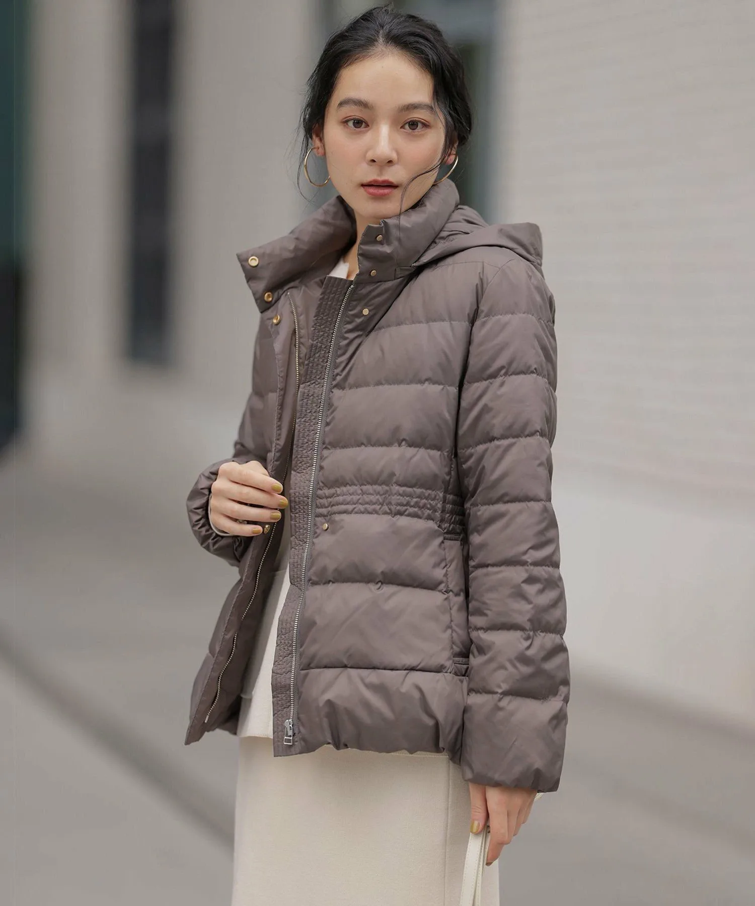 Фирменная пуховая куртка Kumikyoku! Теперь снова в новых цветах! Она настолько легкая, что вы не захотите ее снимать, как только примерите! Эта универсальная короткая пуховая куртка отличается простым дизайном, но высокая строчка создает привлекательный силуэт, не создавая при этом ощущения громоздкости. Свободный крой и силуэт, плавно спускающийся к бедрам, обеспечивают отличную защиту от холода. Воротник-стойка и съемный капюшон имеют трехмерный узор, который добавляет объем вокруг лица, создавая элегантный вид. Строчка на основной части куртки сужается чуть выше талии, а затем расширяется к низу, создавая легкий эффект «утягивания» в области талии. Эта вещь легко сочетается с юбками и широкими брюками.