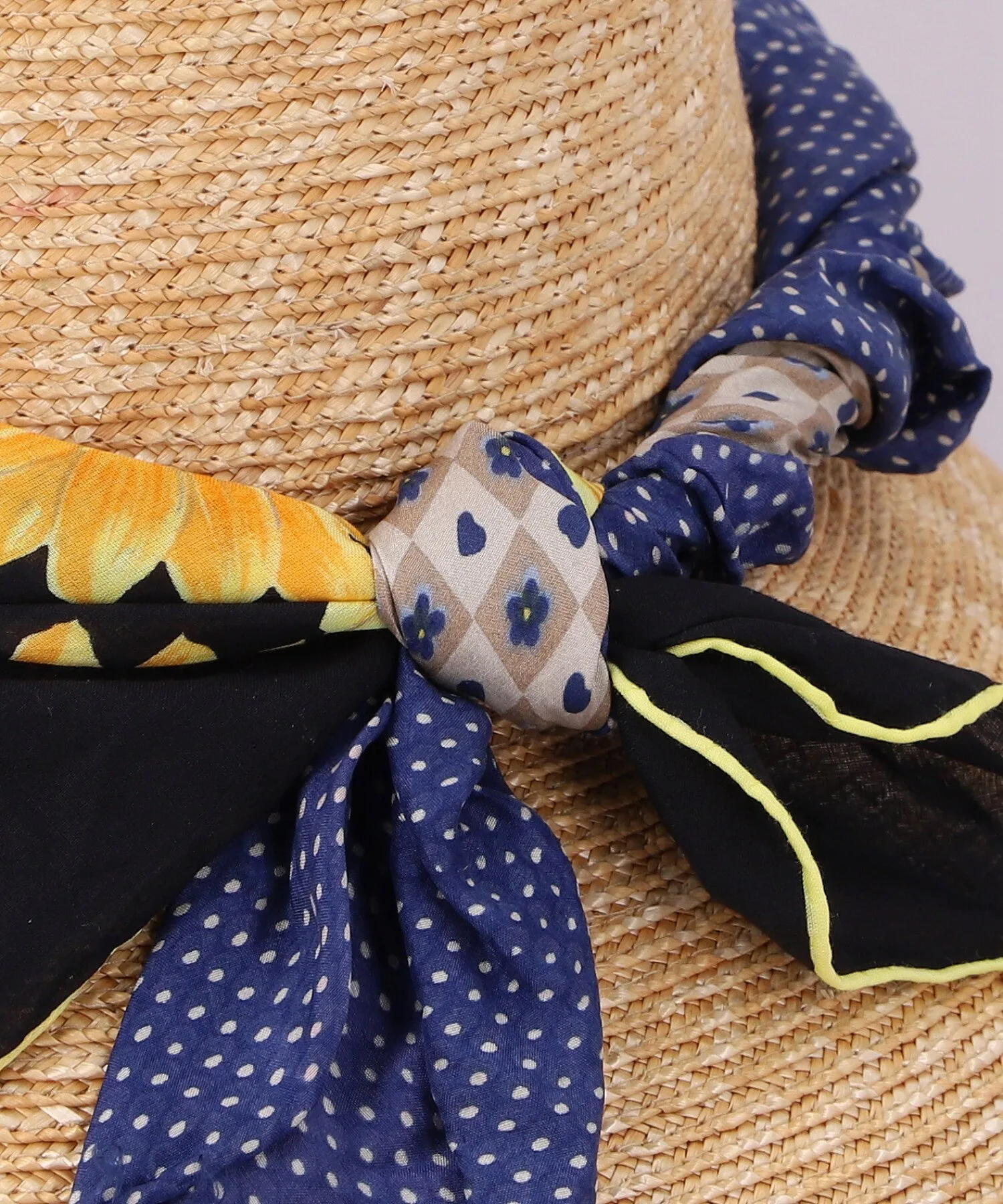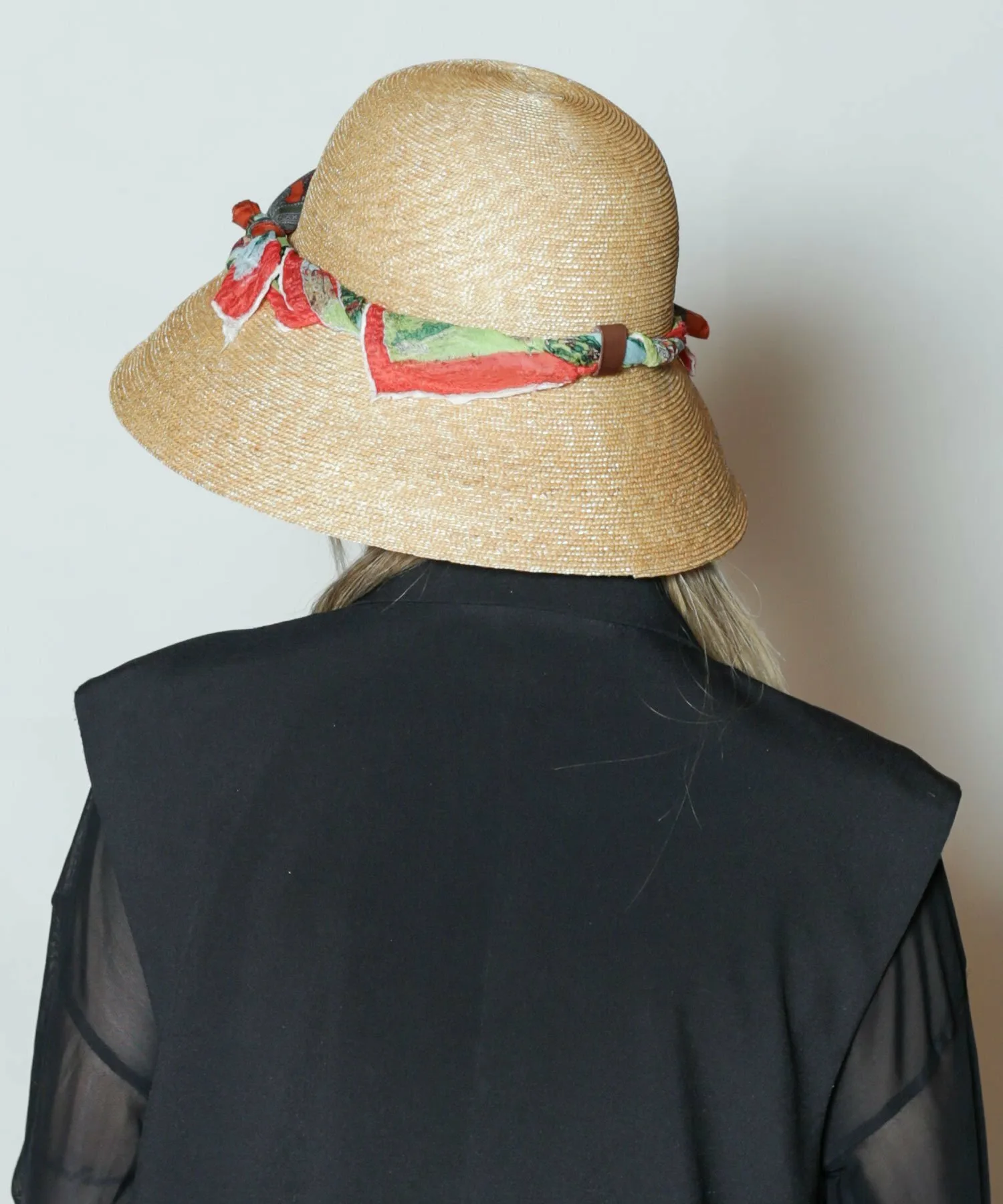 Простая широкополая шляпа, украшенная шарфом. Каждый шарф — уникальное изделие, позволяющее насладиться поистине неповторимым дизайном.
