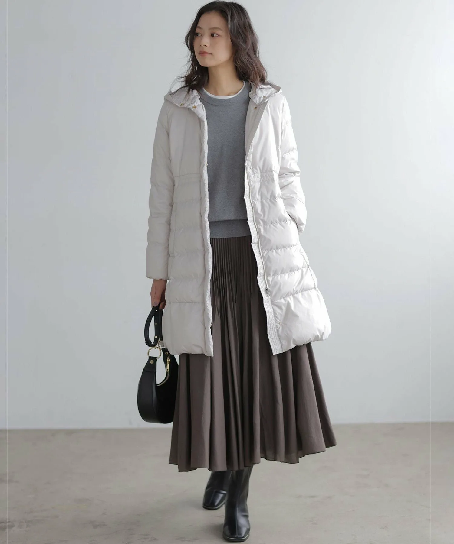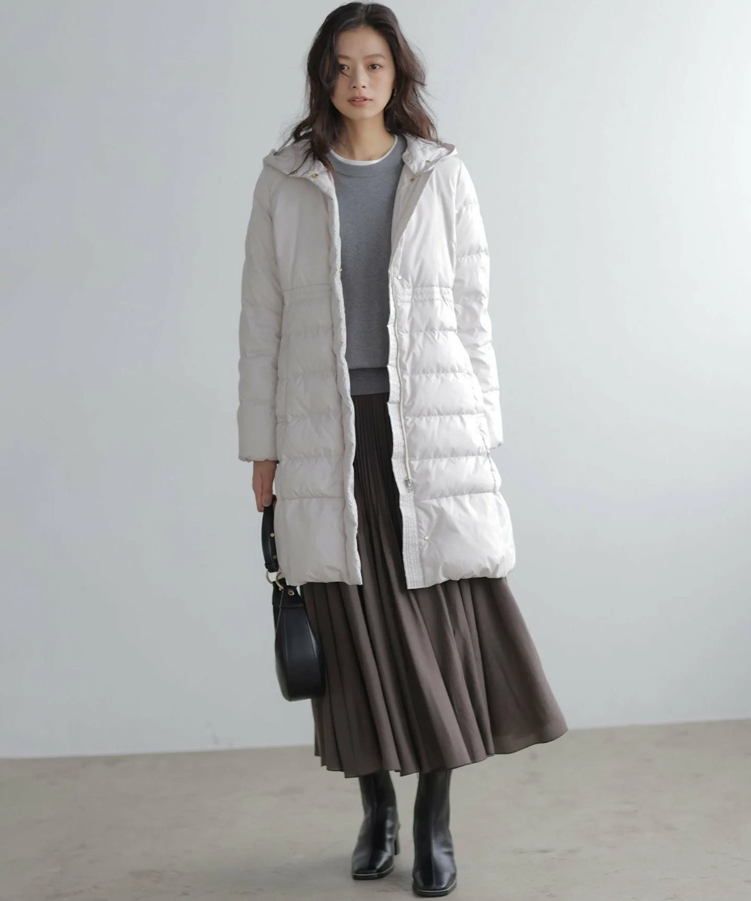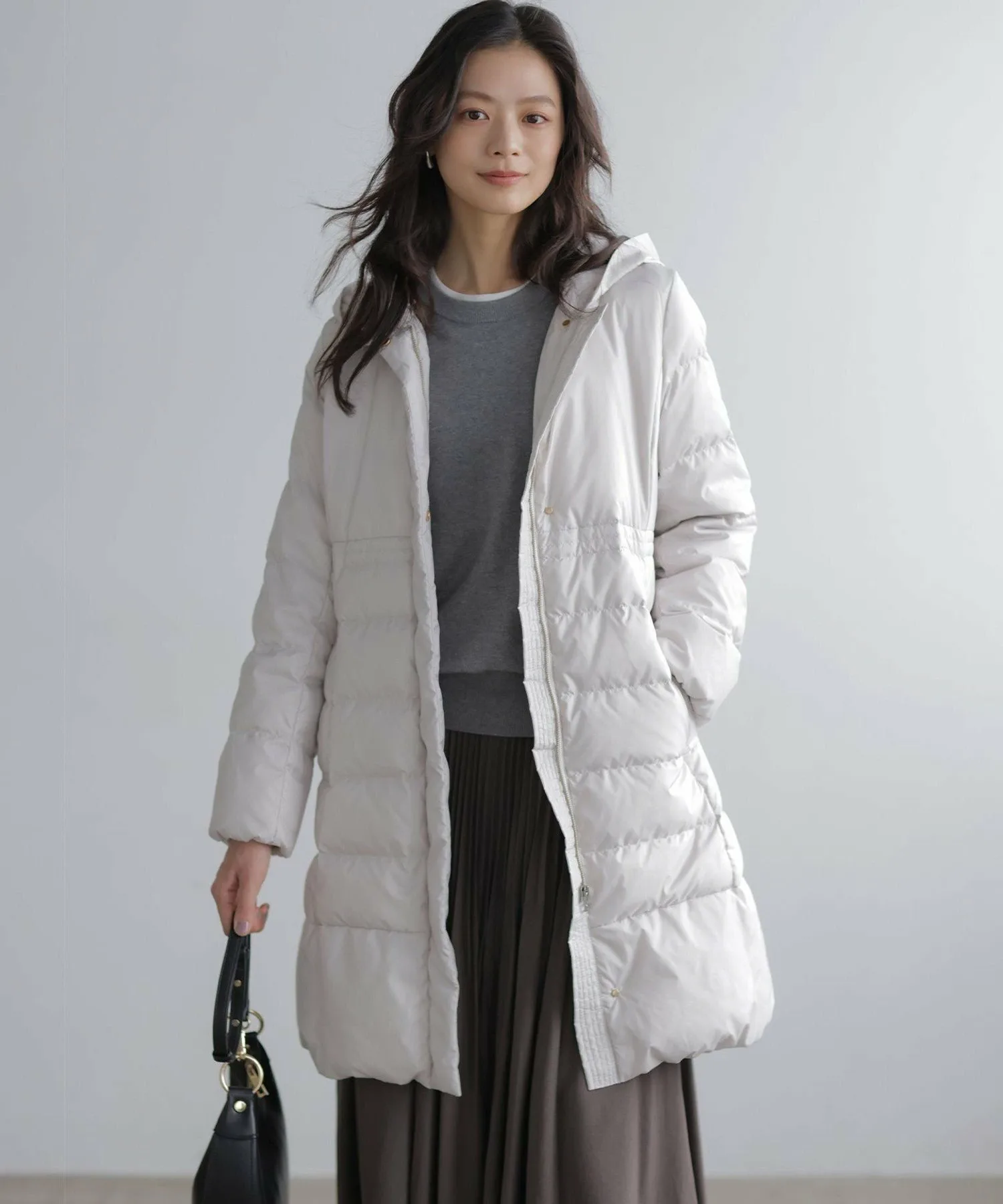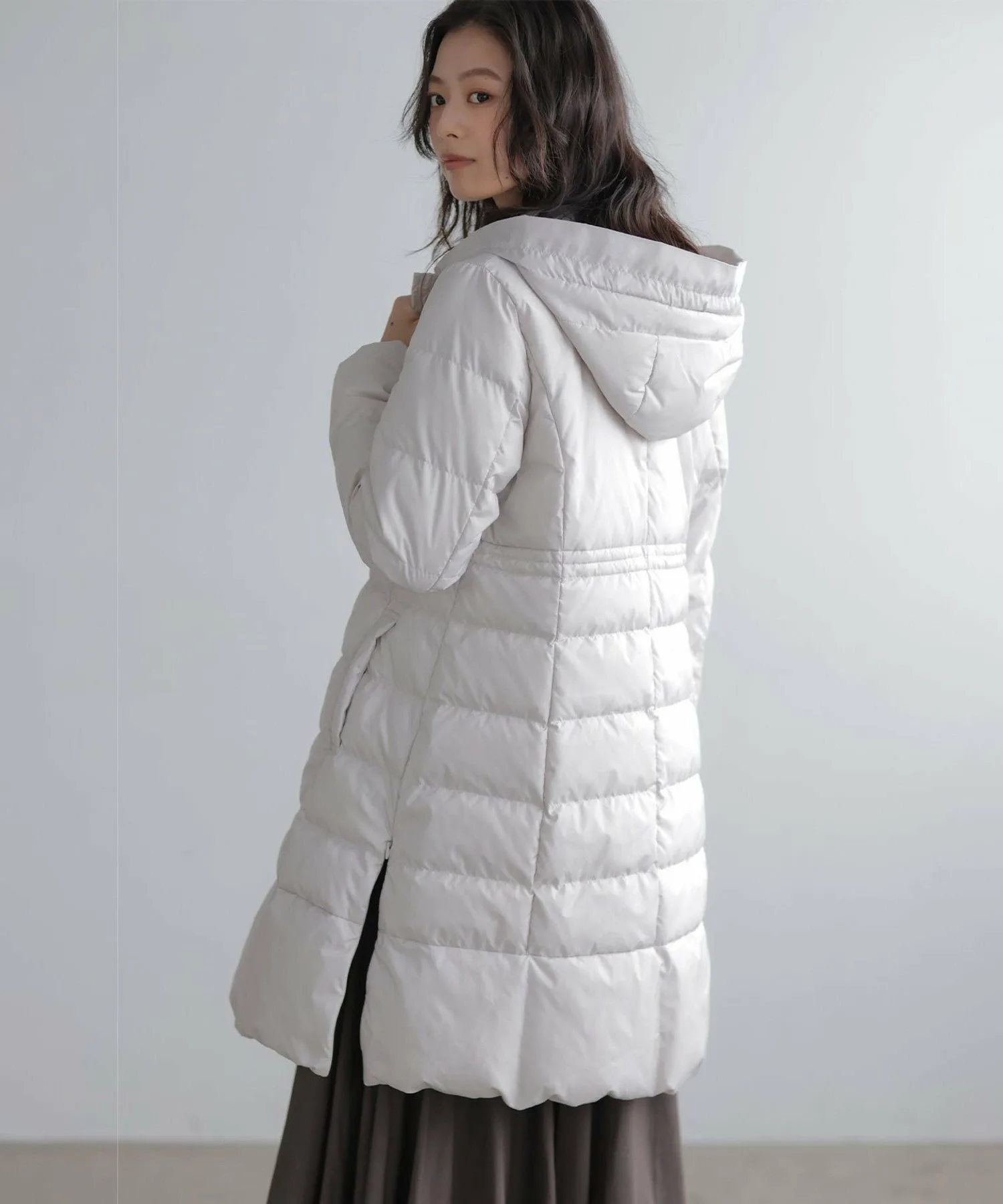 Дизайн・Легкая и теплая, эта длинная пуховая куртка — популярный товар каждый год, отличающийся тщательно продуманным силуэтом, плавно изгибающимся к талии. ・Верхняя часть плоская и не имеет швов, что создает не слишком повседневный образ. ・Горизонтальная строчка идет от чуть выше талии до низа, сужаясь к талии для создания стройного, привлекательного силуэта. ・Длина комфортно закрывает бедра, обеспечивая отличное тепло. ・Расстегните боковую молнию как разрез, чтобы легко носить мягкую расклешенную юбку и максимально свободно двигать ногами. ・Трехмерный, обволакивающий капюшон создает аккуратный, элегантный вид вокруг лица. ・Капюшон съемный, поэтому вы можете носить куртку как пальто без воротника. • Открытый вырез горловины идеально дополняет мех и палантины. Материал: • Цвета 003, 005, 030 (однотонная тафта): Плотная тканая тафта с гладкой поверхностью и глянцевым блеском. Благодаря объему нитей она легкая и мягкая на ощупь. • Цвета 575, 504 (твидовая): Ткань в елочку, сотканная из серых и белых нитей, с принтом, напоминающим твид, который добавляет глубины. Поверхность слегка обработана щеткой для создания теплого, похожего на шерсть ощущения и изысканной, трехмерной мягкости, при этом сохраняя легкость, которую трудно достичь с шерстью.