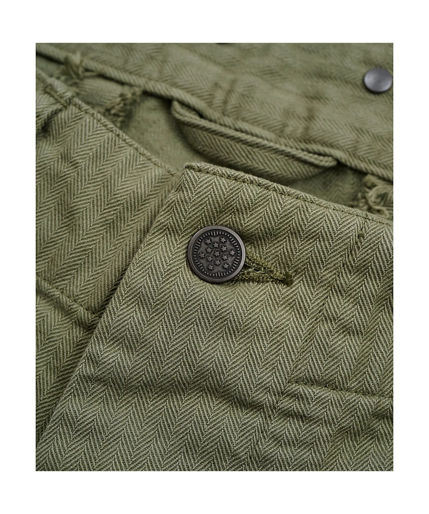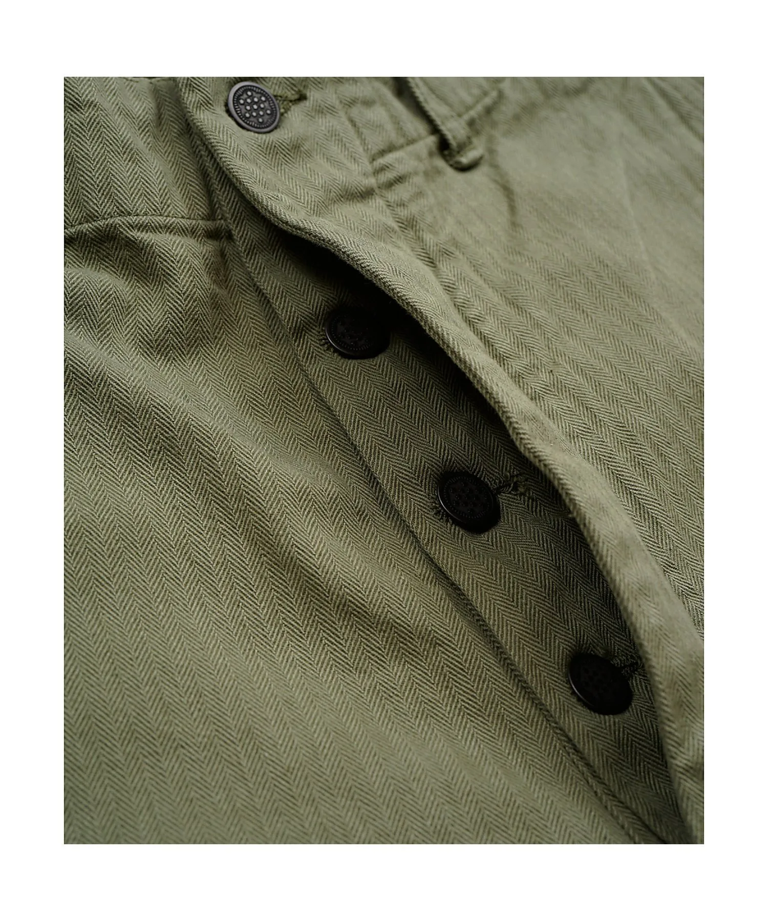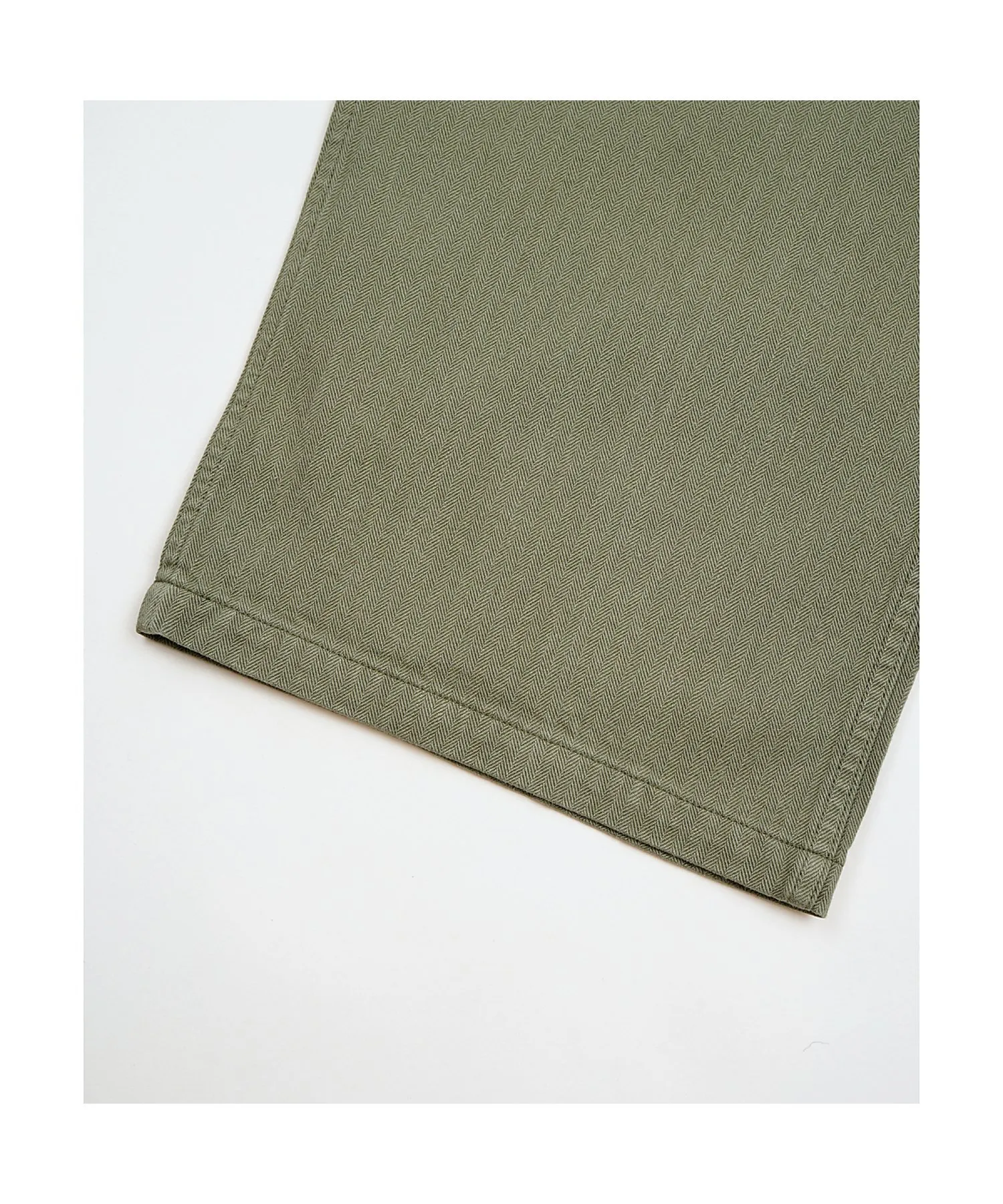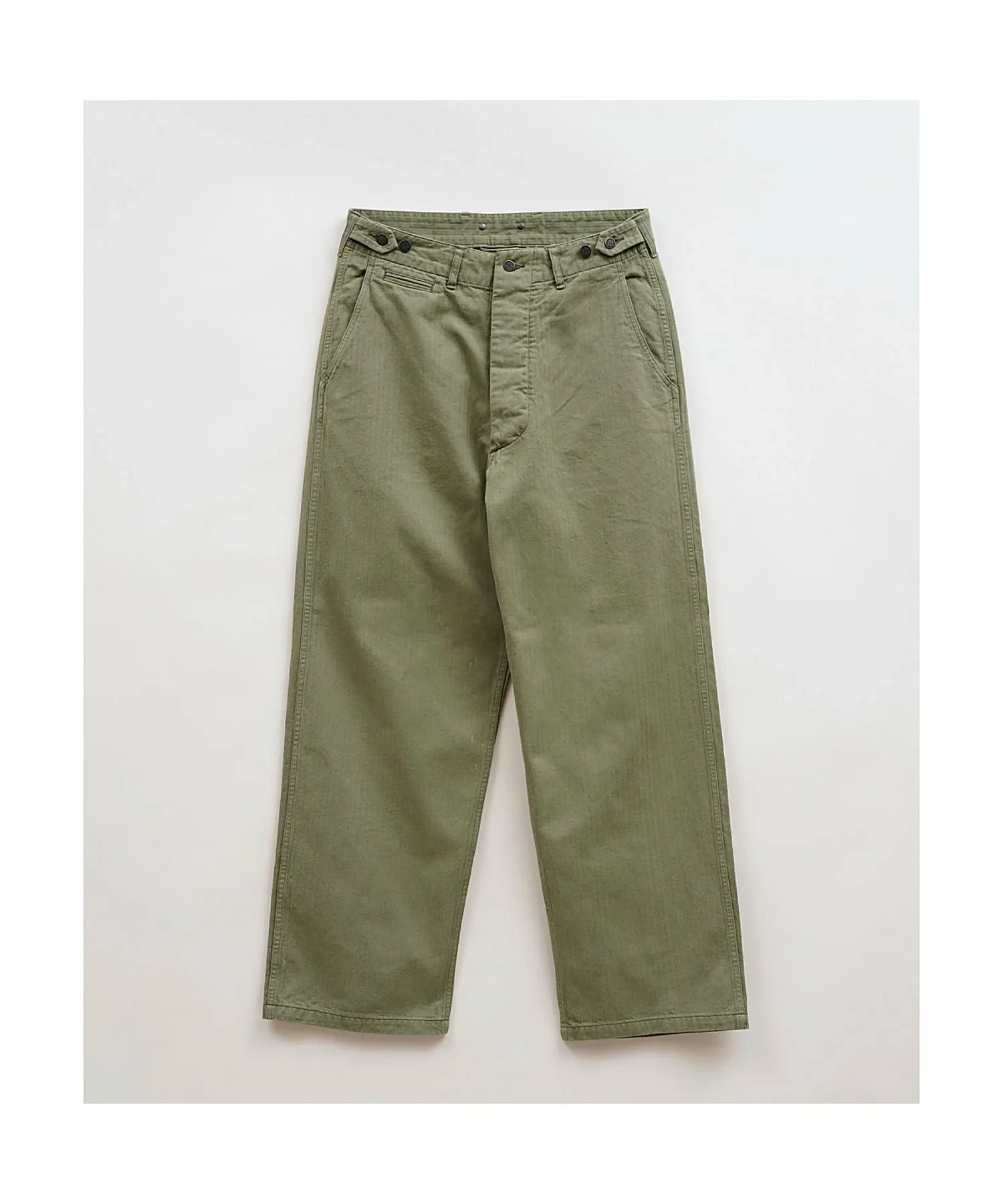 Эта эксклюзивная модель, продающаяся только в магазине в Сендае, создана на основе брюк M43, официально принятых на вооружение армией США в 1943 году, и изготовлена из оригинальной ткани SZ в елочку. Специально сплетенная ткань, обладающая превосходной прочностью, является репродукцией редкой винтажной пары, обнаруженной Найджелом Кабурном. Простой дизайн исключает накладные карманы, а регулируемая затяжка и фиксация сзади обеспечивают удобную посадку. Более того, эта особая пара отличается редким трафаретным принтом на заднем кармане.