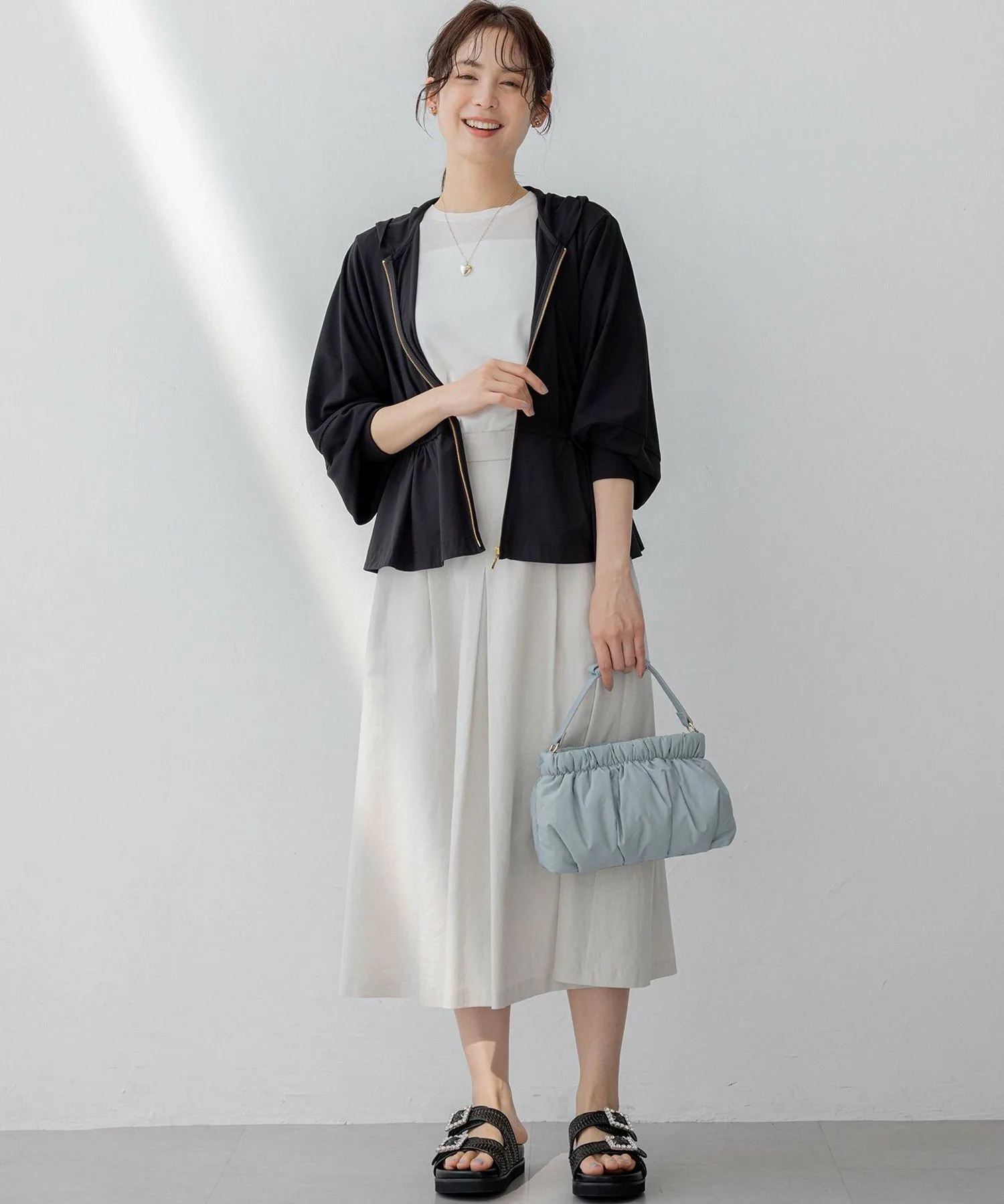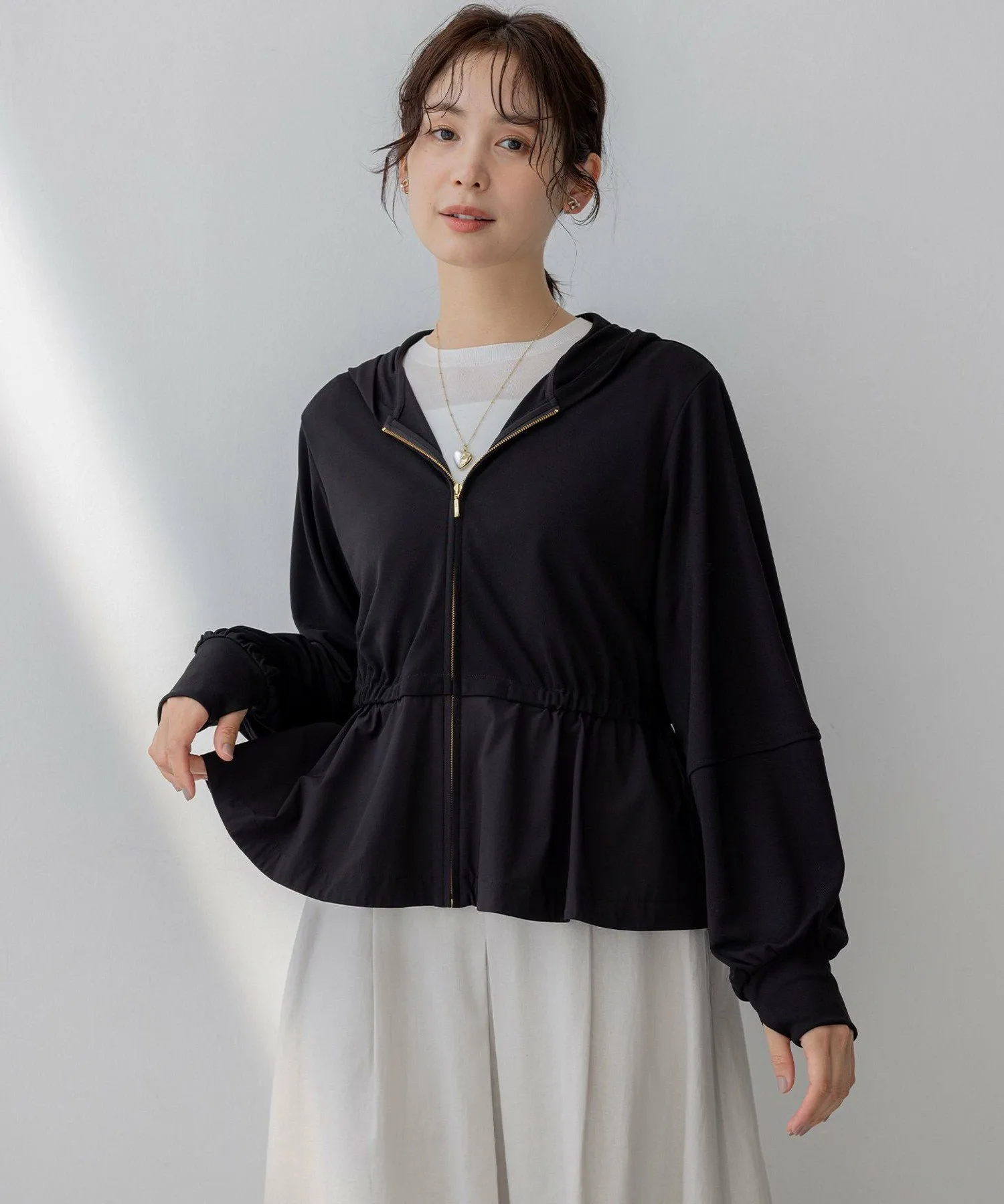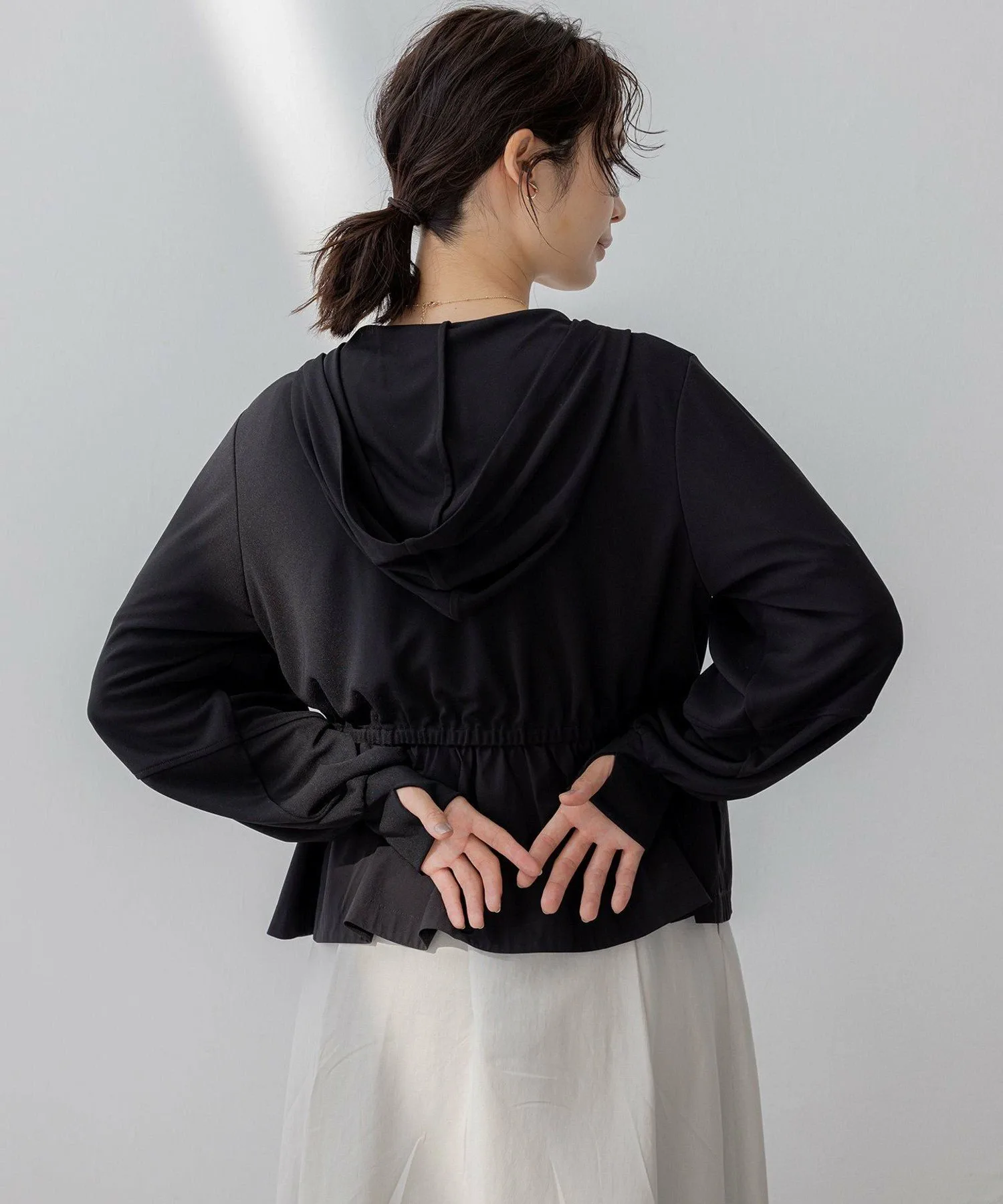Дизайн・Этот стильный рашгард сочетает в себе трикотажную ткань и легкую тканую баску. ・Эластичная сборка на талии позволяет регулировать посадку. ・Большой капюшон подчеркивает лицо и обеспечивает защиту от УФ-излучения. ・Рукава-фонарики добавляют объем, придавая повседневному образу женственный вид. ・Длинные разрезы на манжетах обеспечивают дополнительную защиту до тыльной стороны ладони.
