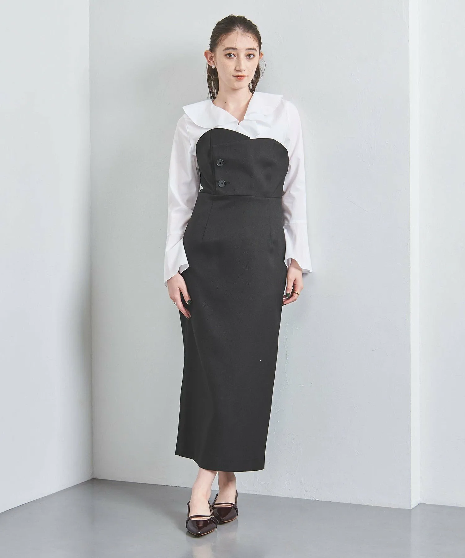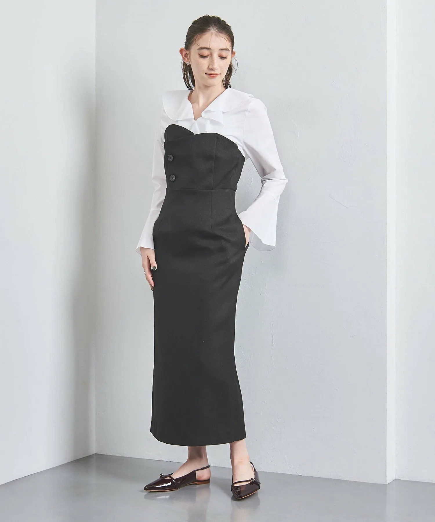 Платье с асимметричной перекрывающейся линией на груди и силуэтом бюстье.