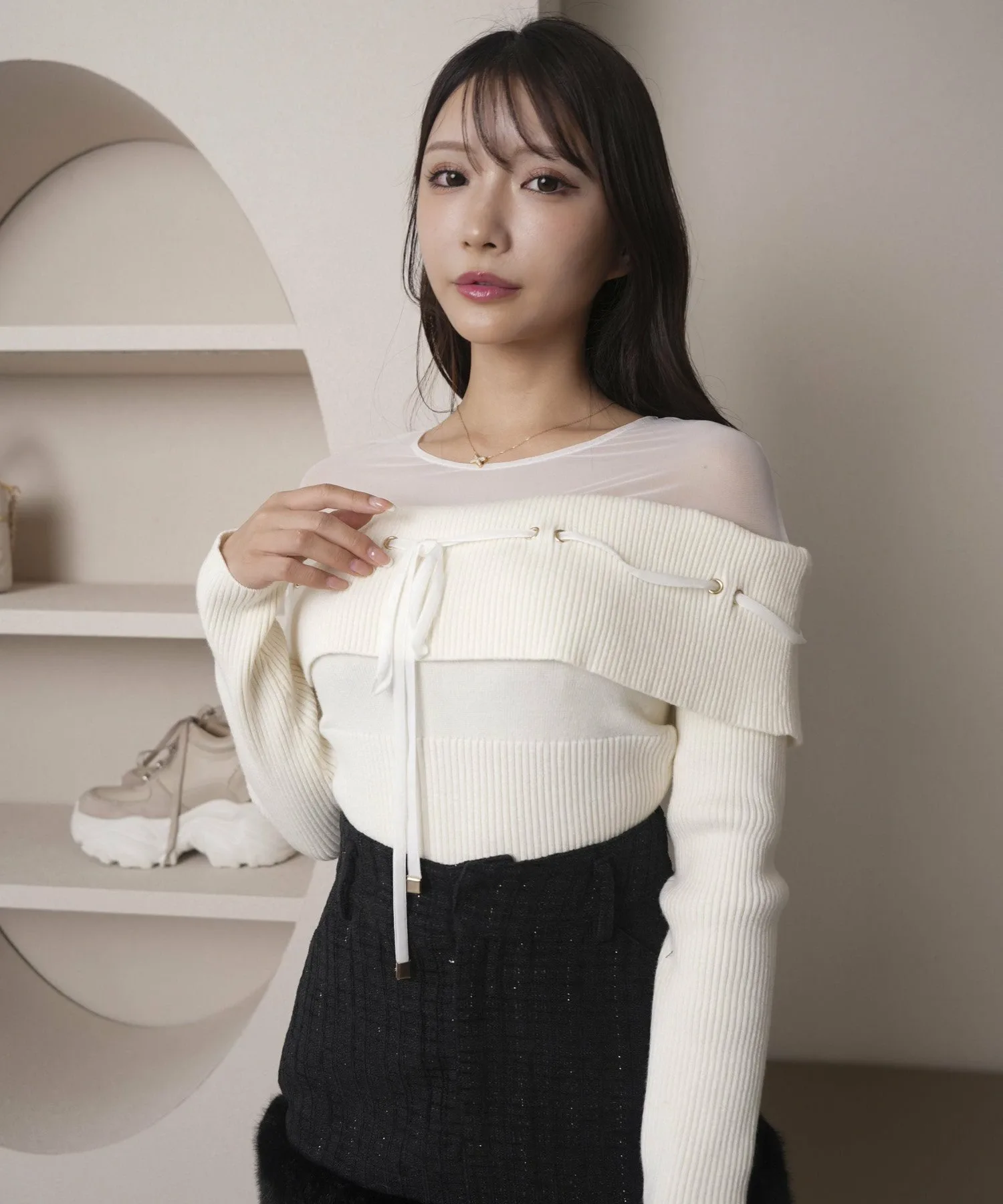 ・Модель с открытыми плечами имеет полупрозрачную ткань, облегающую декольте,