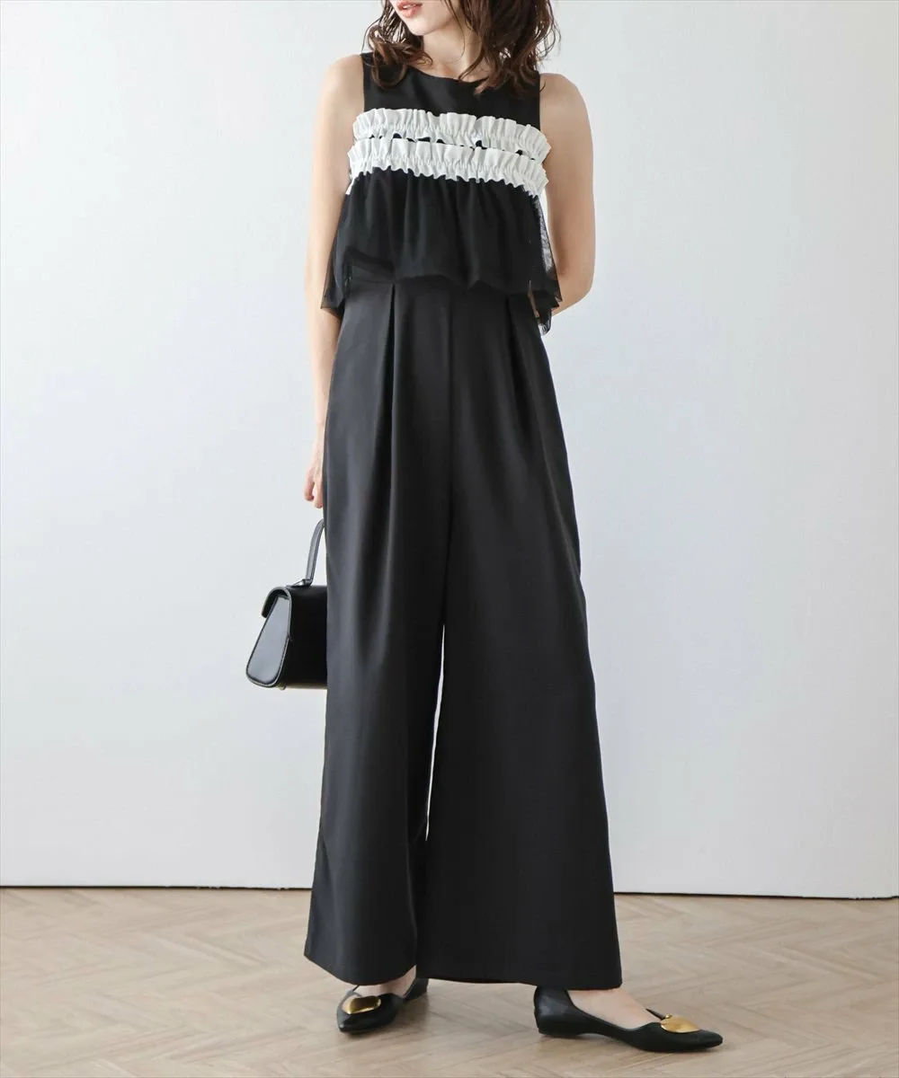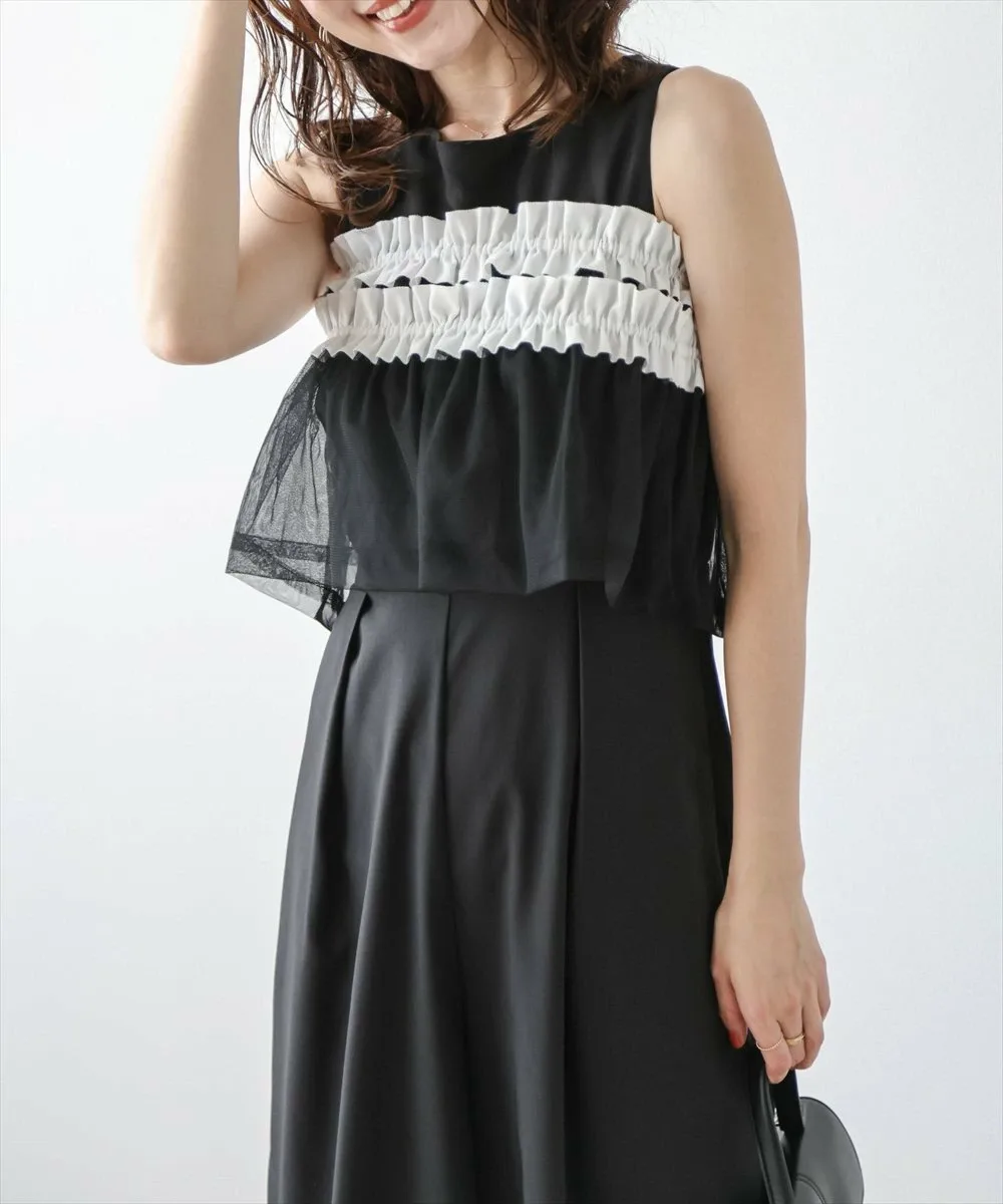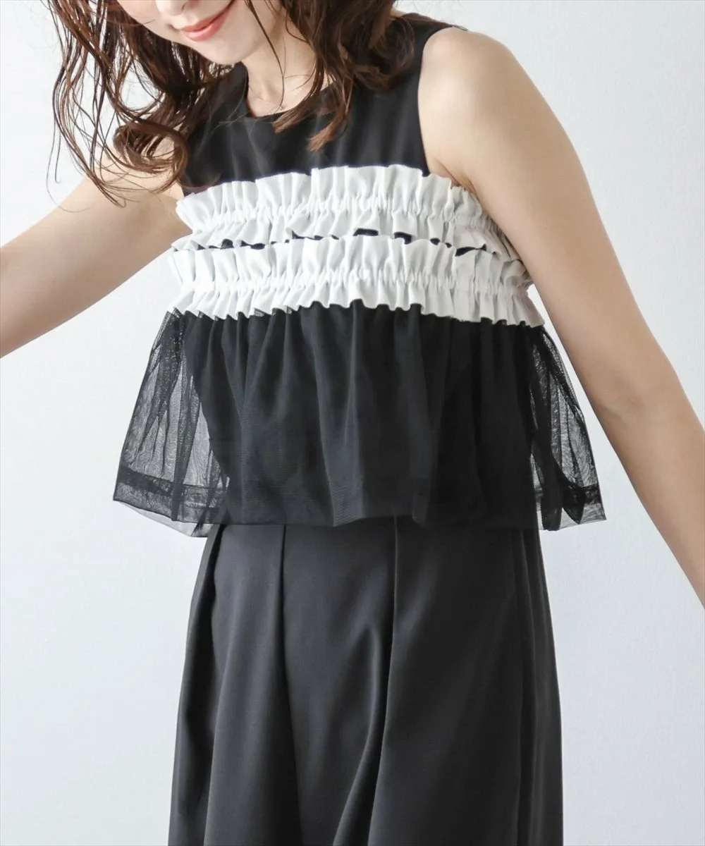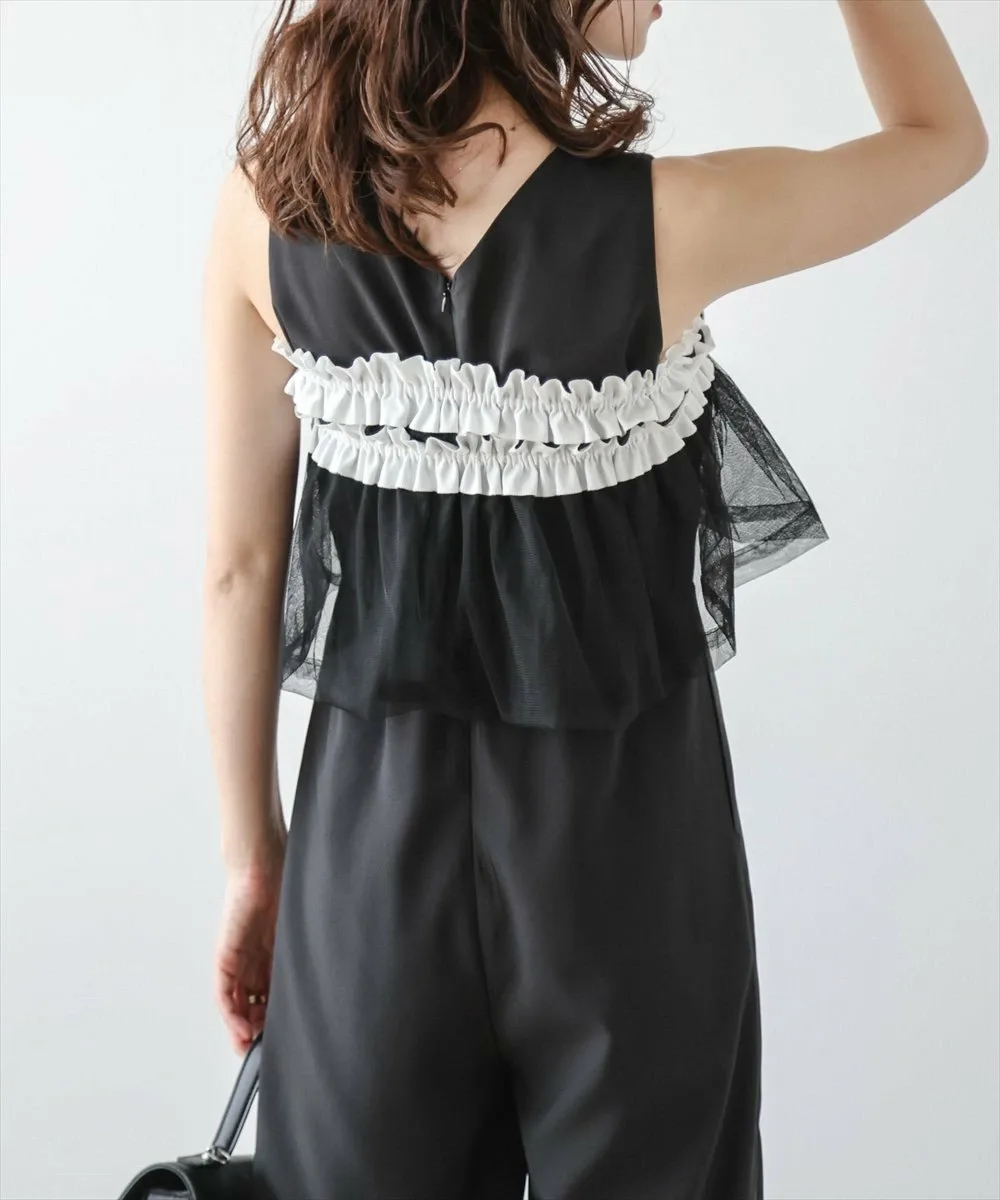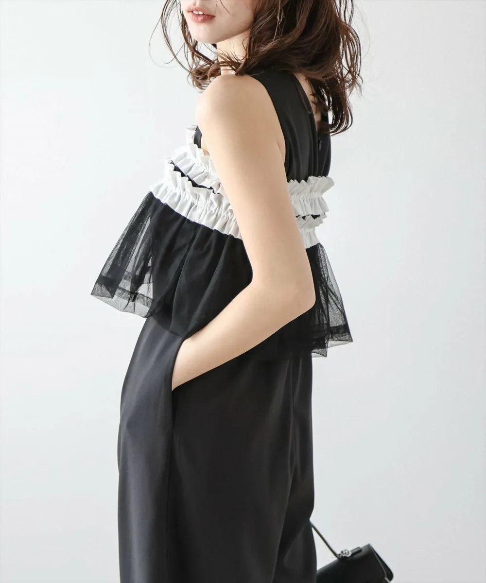 Этот комплект включает в себя модный тюлевый бюстье с оборками и комбинезон без рукавов, создающий женственный, непринужденный образ♪