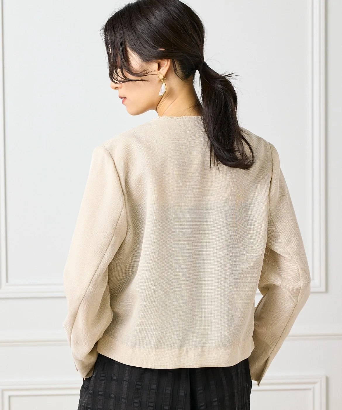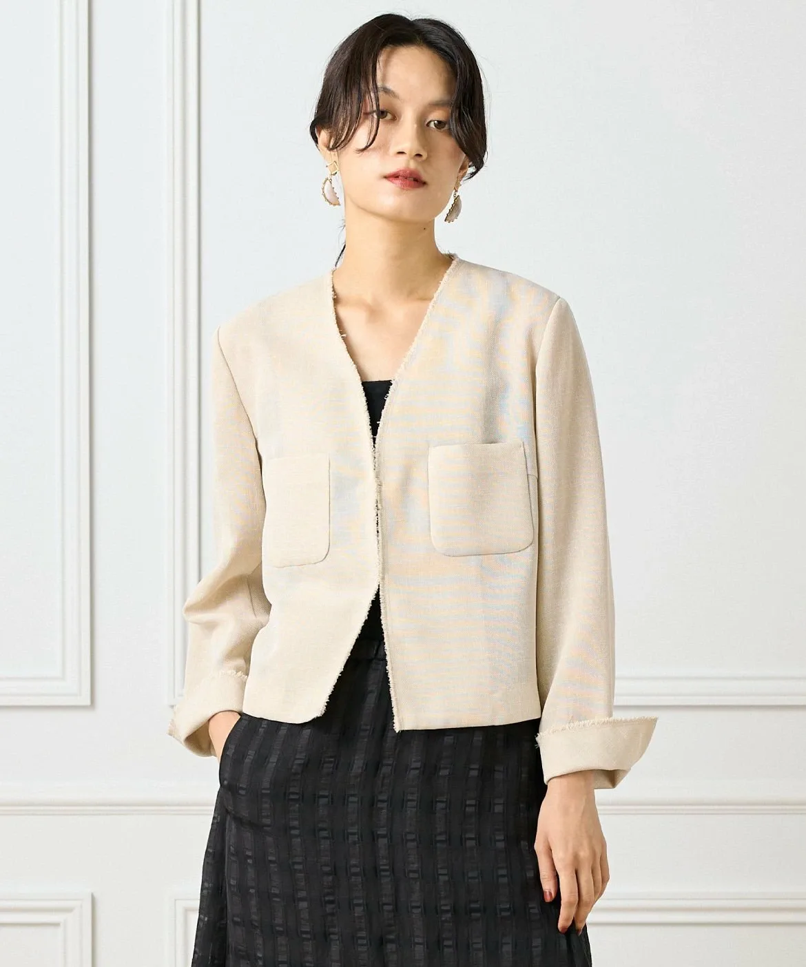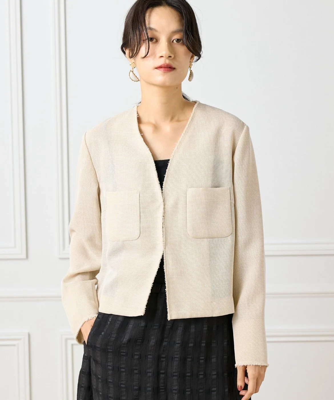 V-образный вырез спереди придает этой вещи четкий вид, а компактная форма создает элегантный образ. Необработанный край горловины добавляет акцент. Отсутствие подкладки делает ее легкой, похожей на кардиган вещью, которую можно носить как с нарядной одеждой, так и с джинсами для повседневного образа.