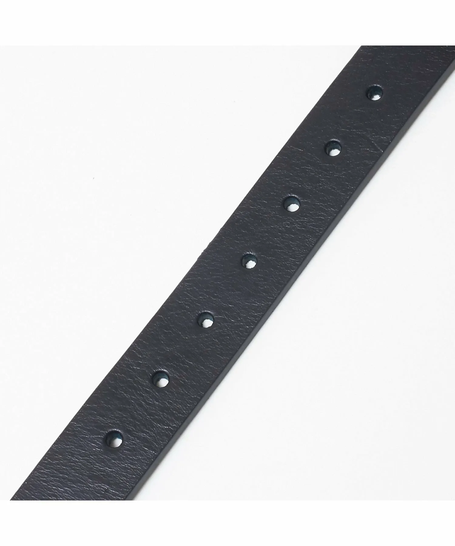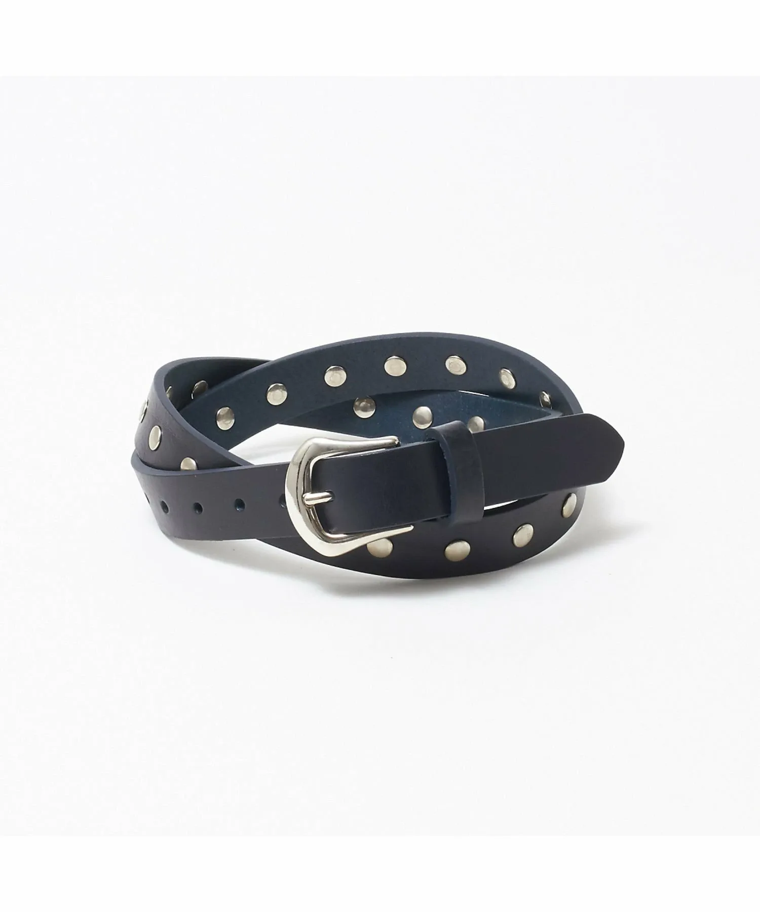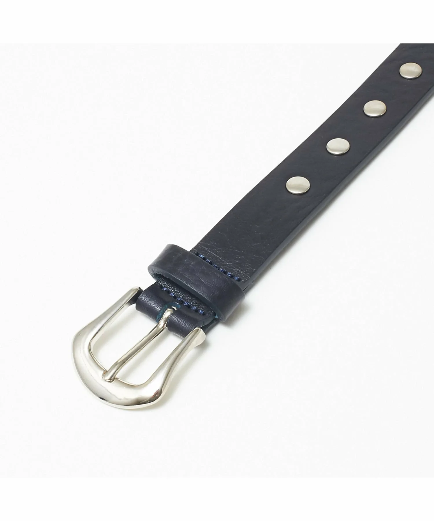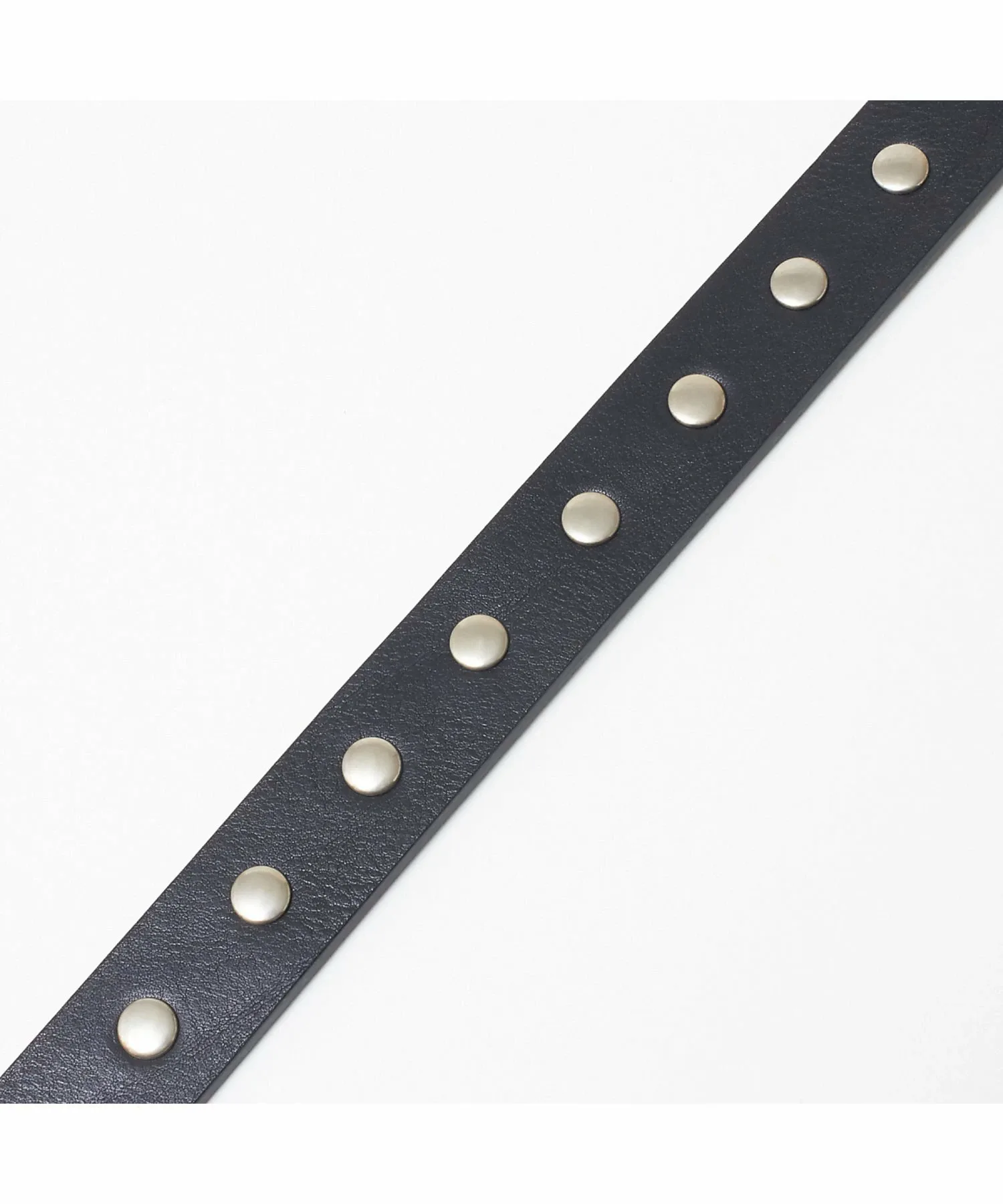 Примерно 30 круглых плоских заклепок равномерно расположены на ремне шириной 2,5 см, изготовленном из цельного куска кожи.