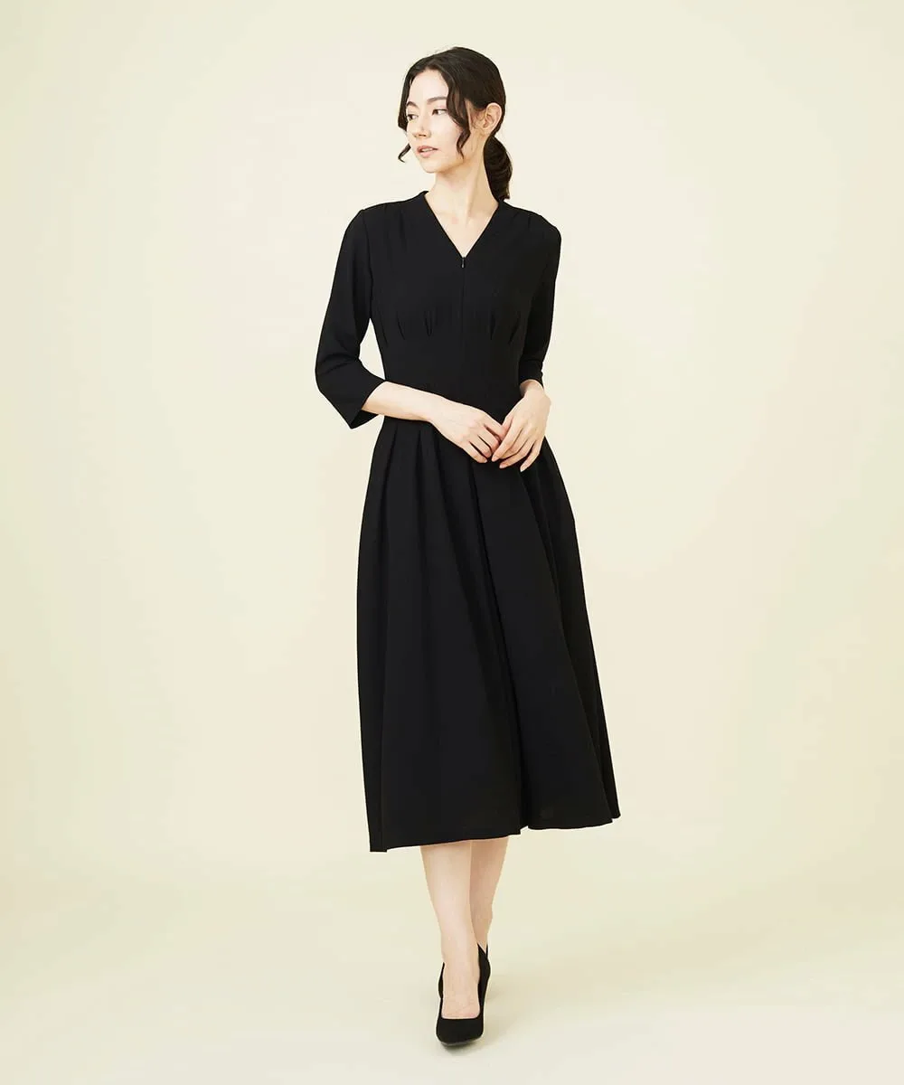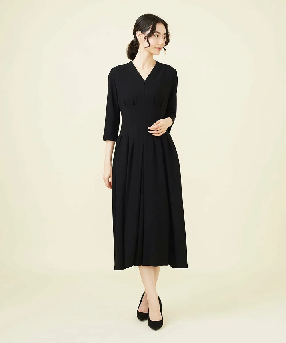 Внимание уделено деталям, таким как V-образный вырез, создающий выразительный силуэт, и рукава три четверти, подчеркивающие изящество рук.