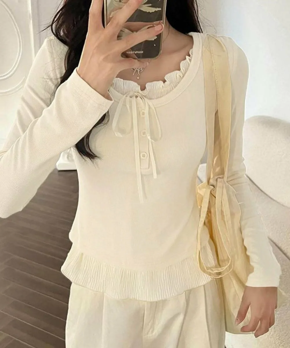 Топ, визуально стройнящий фигуру, женственная футболка, корейская мода