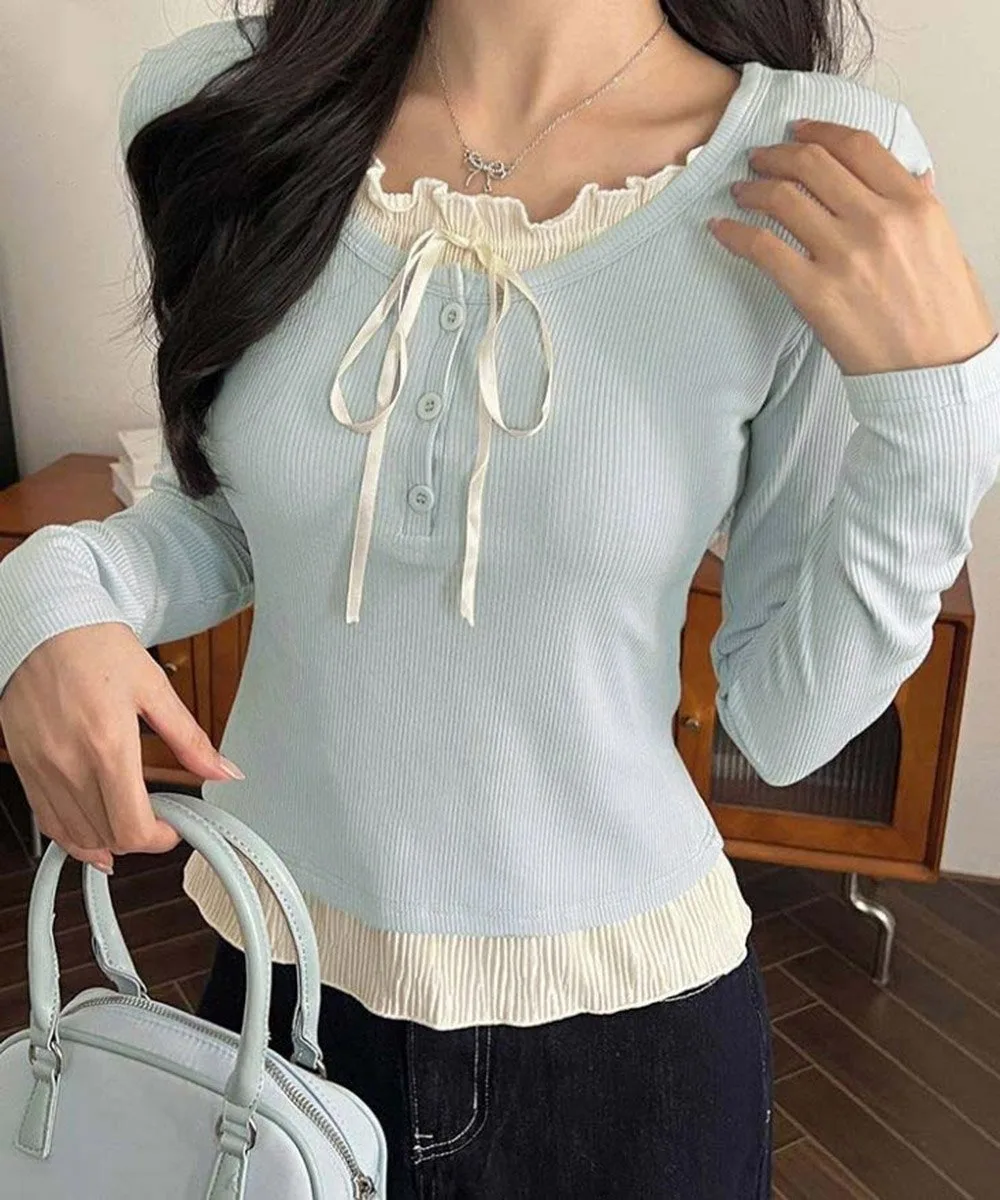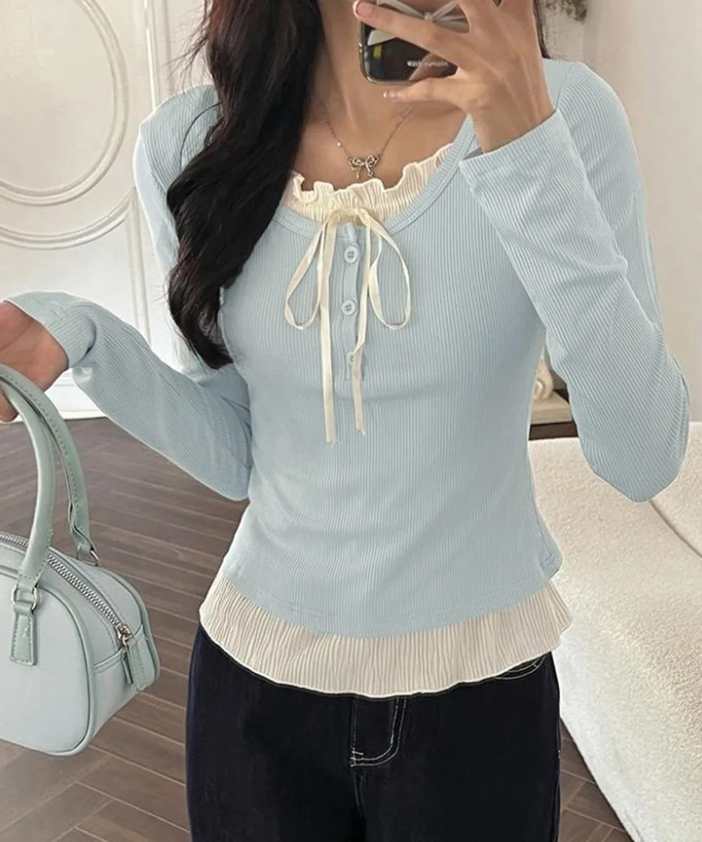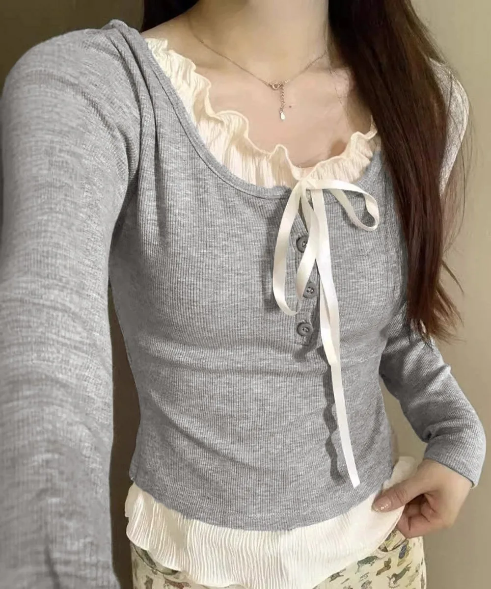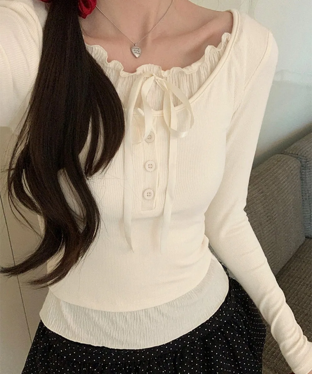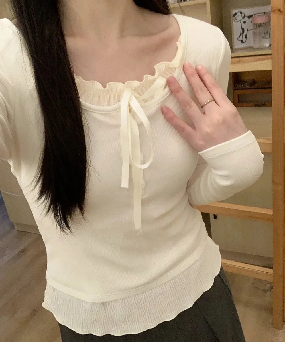 Женский балетный топ, топ с оборками, универсальный и милый повседневный наряд, однотонная женственная футболка с длинными рукавами