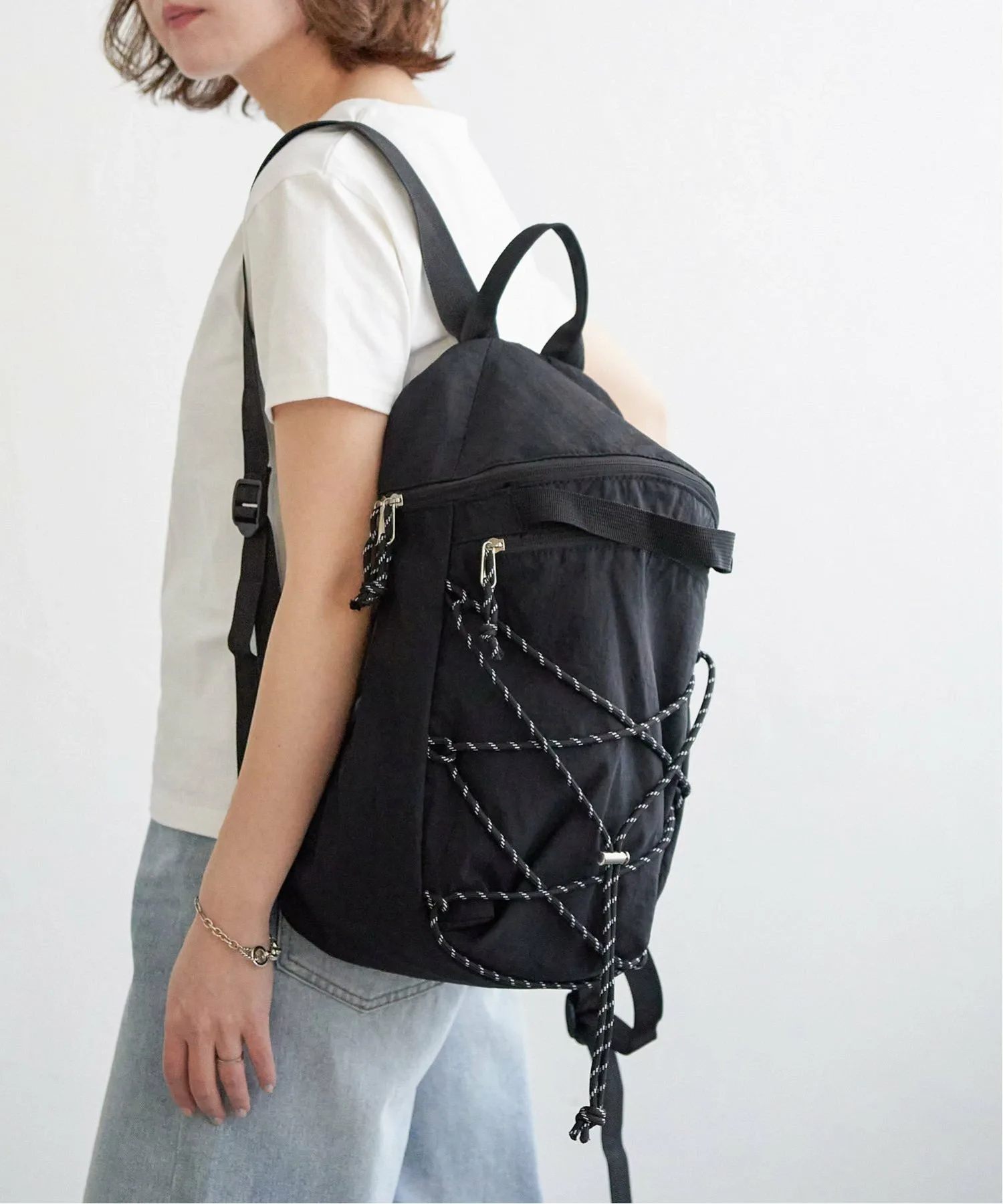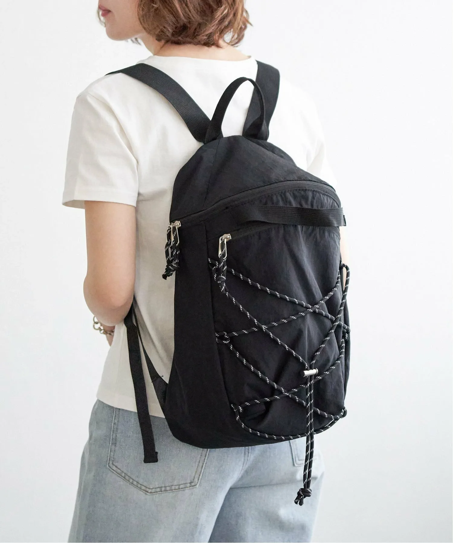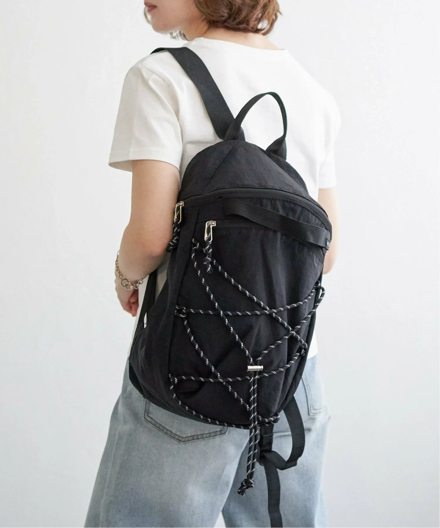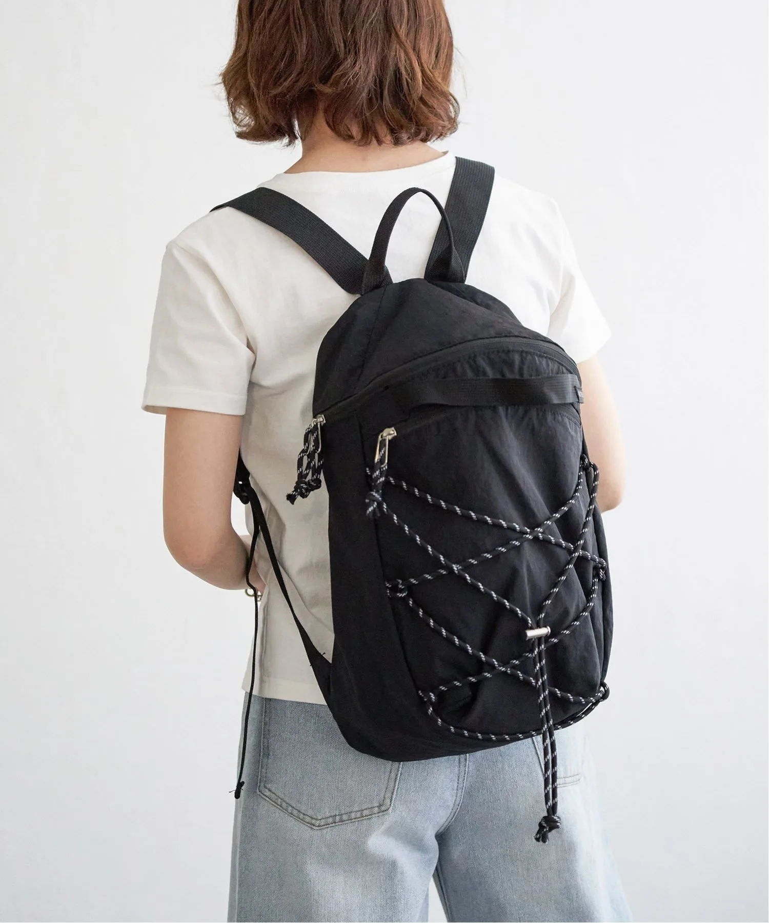 Этот рюкзак украшен веревочными деталями спереди, создавая атмосферу походного стиля.