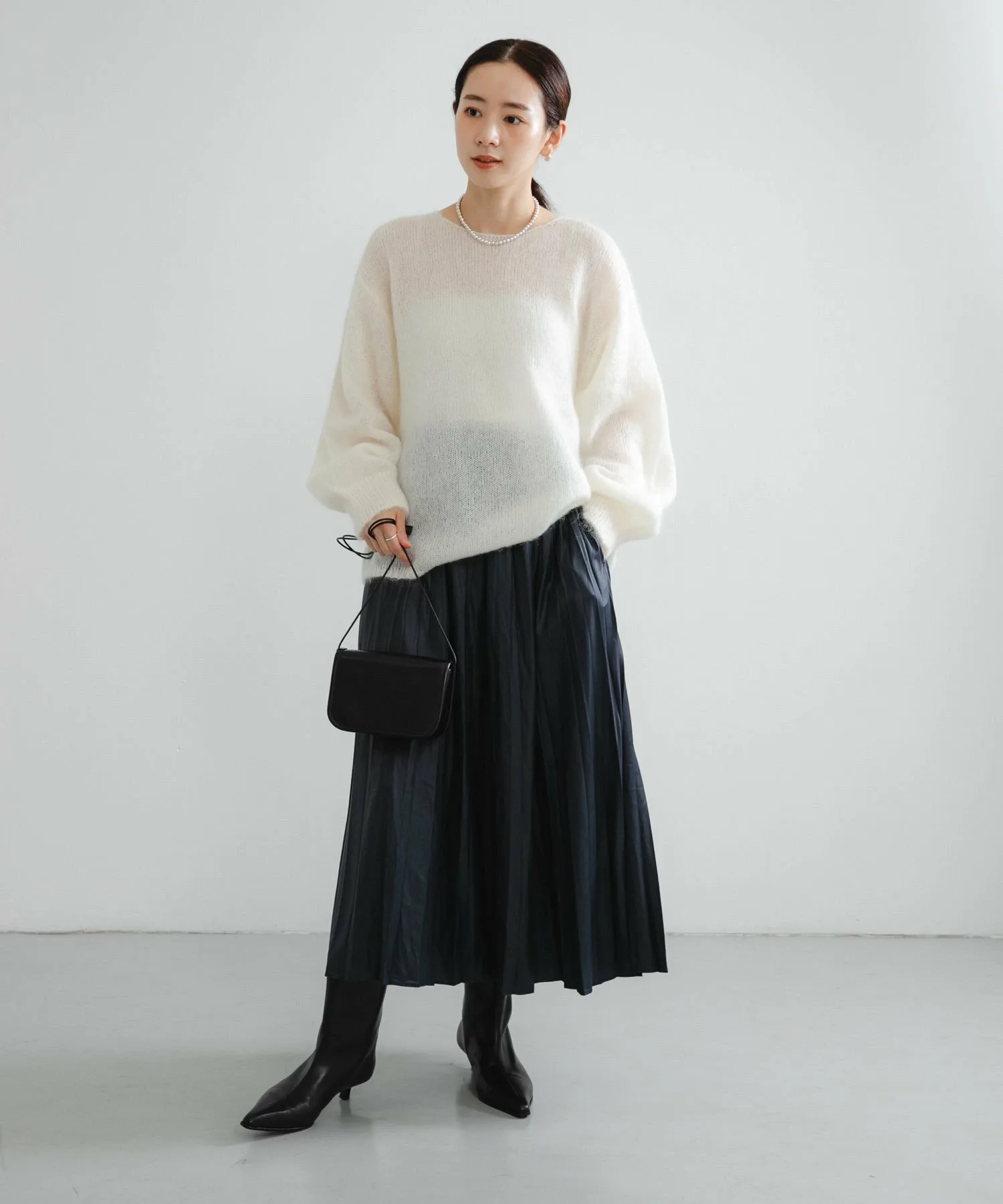 Свободный круглый вырез создает чистый, элегантный силуэт.