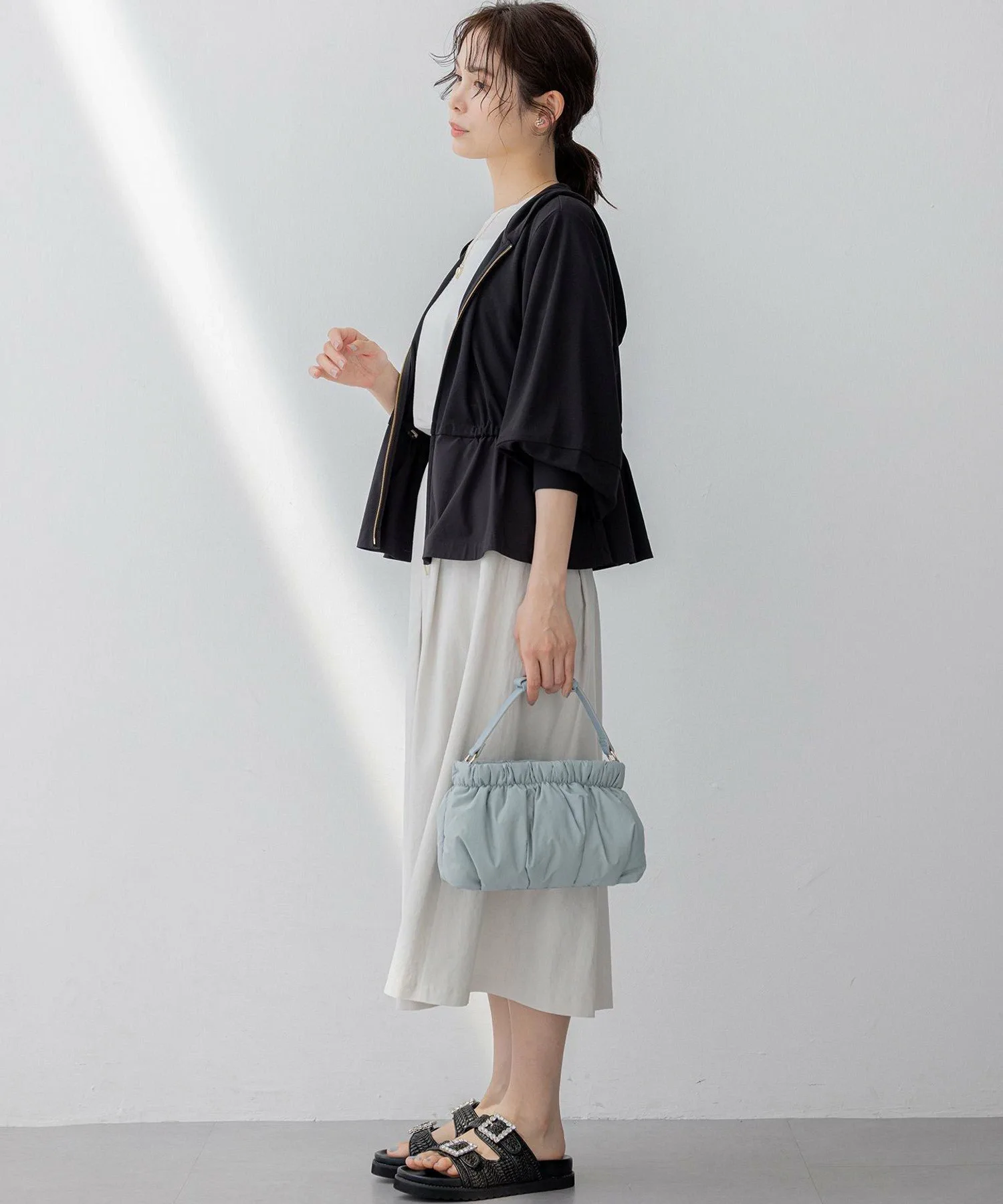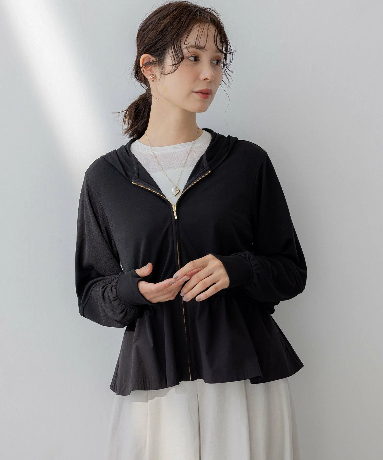 Дизайн・Этот стильный рашгард сочетает в себе трикотажную ткань и легкую тканую баску. ・Эластичная сборка на талии позволяет регулировать посадку. ・Большой капюшон подчеркивает лицо и обеспечивает защиту от УФ-излучения. ・Рукава-фонарики добавляют объем, придавая повседневному образу женственный вид. ・Длинные разрезы на манжетах обеспечивают дополнительную защиту до тыльной стороны ладони.