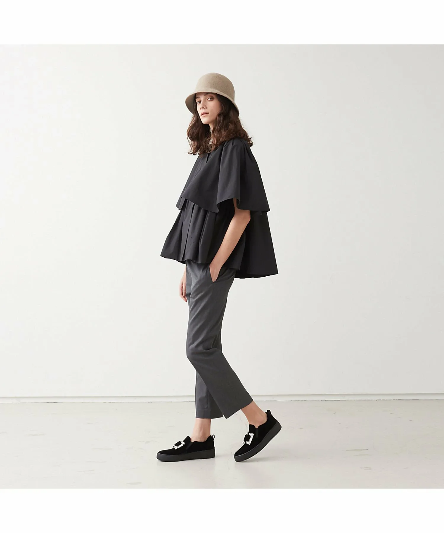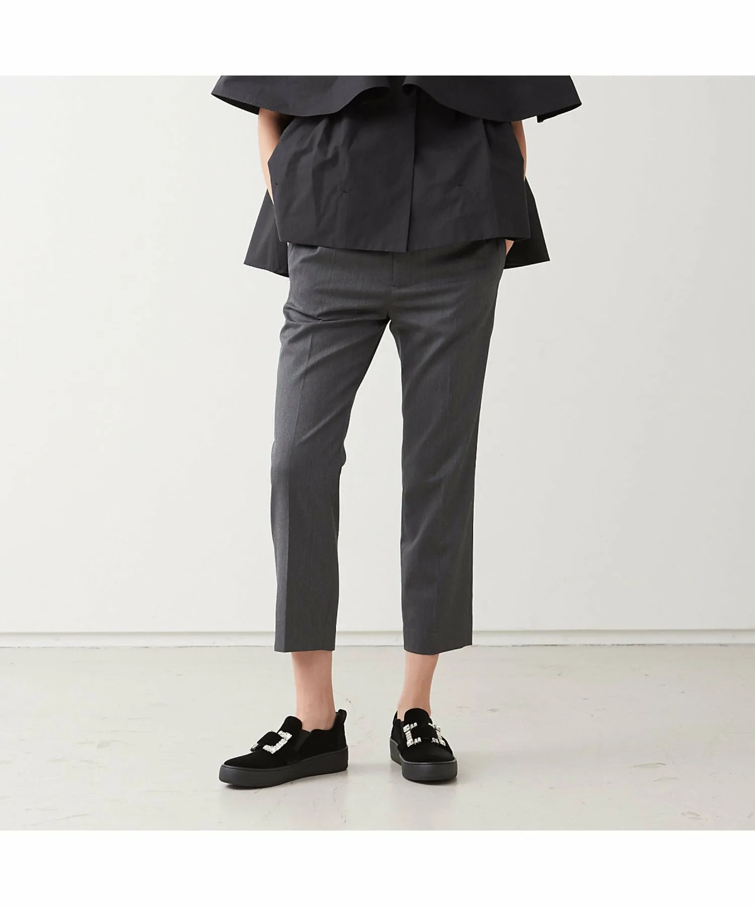 Эти удобные брюки изготовлены из гибридного материала, который придает им изысканный блеск и комфортную эластичность. Они также обладают водоотталкивающими функциональными свойствами. Модель серого цвета: рост 177 см, обхват груди 82 см, талия 58 см, бедра 88 см, размер 38.