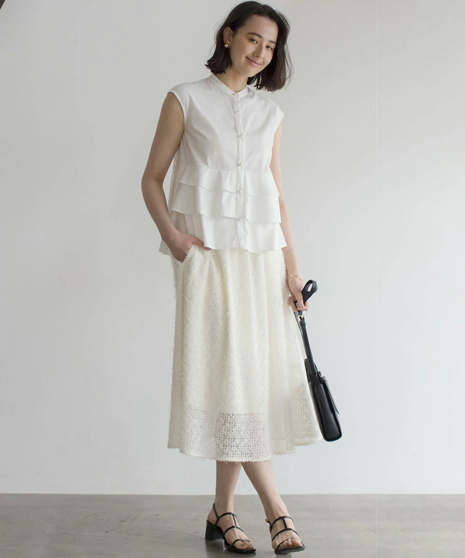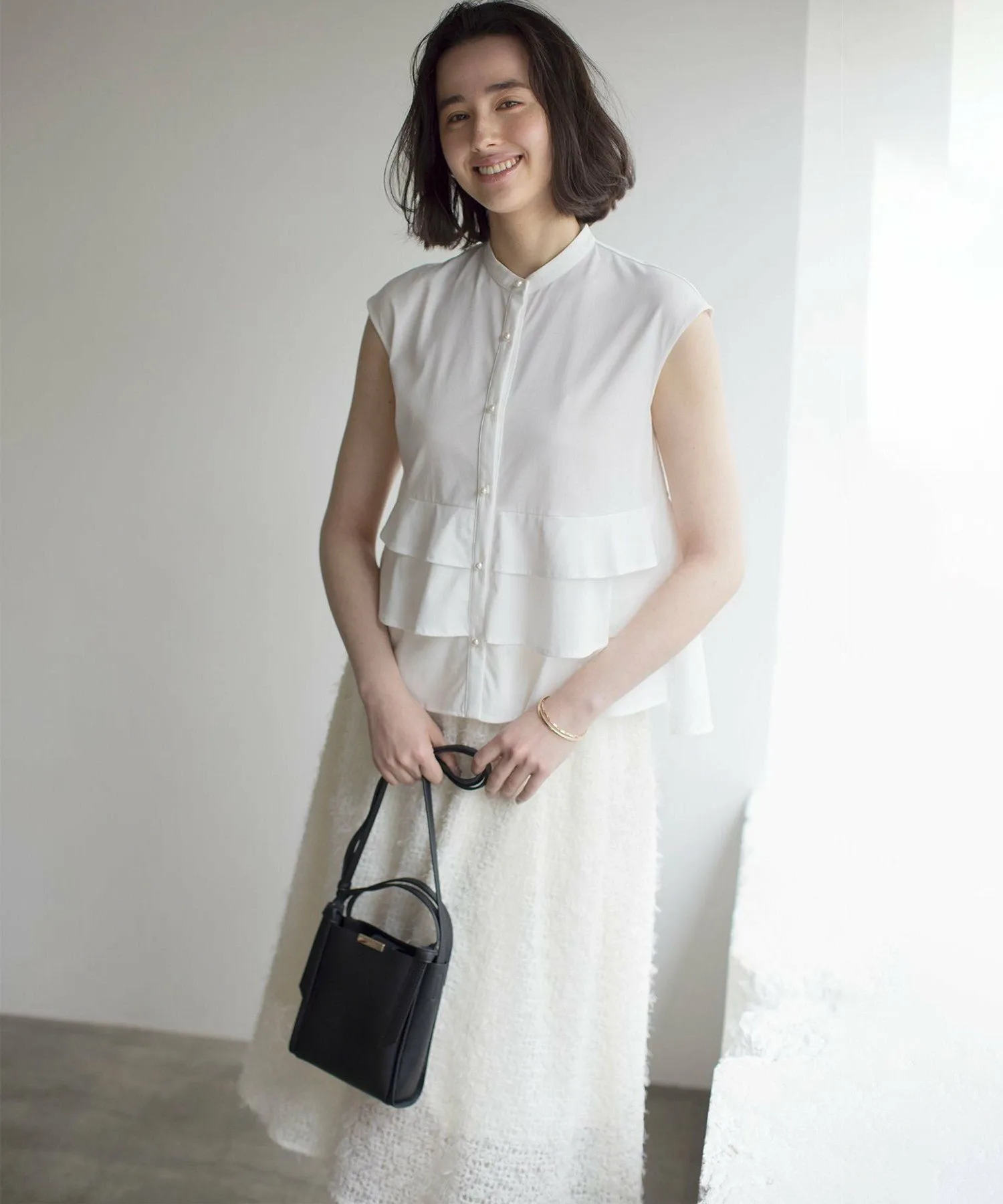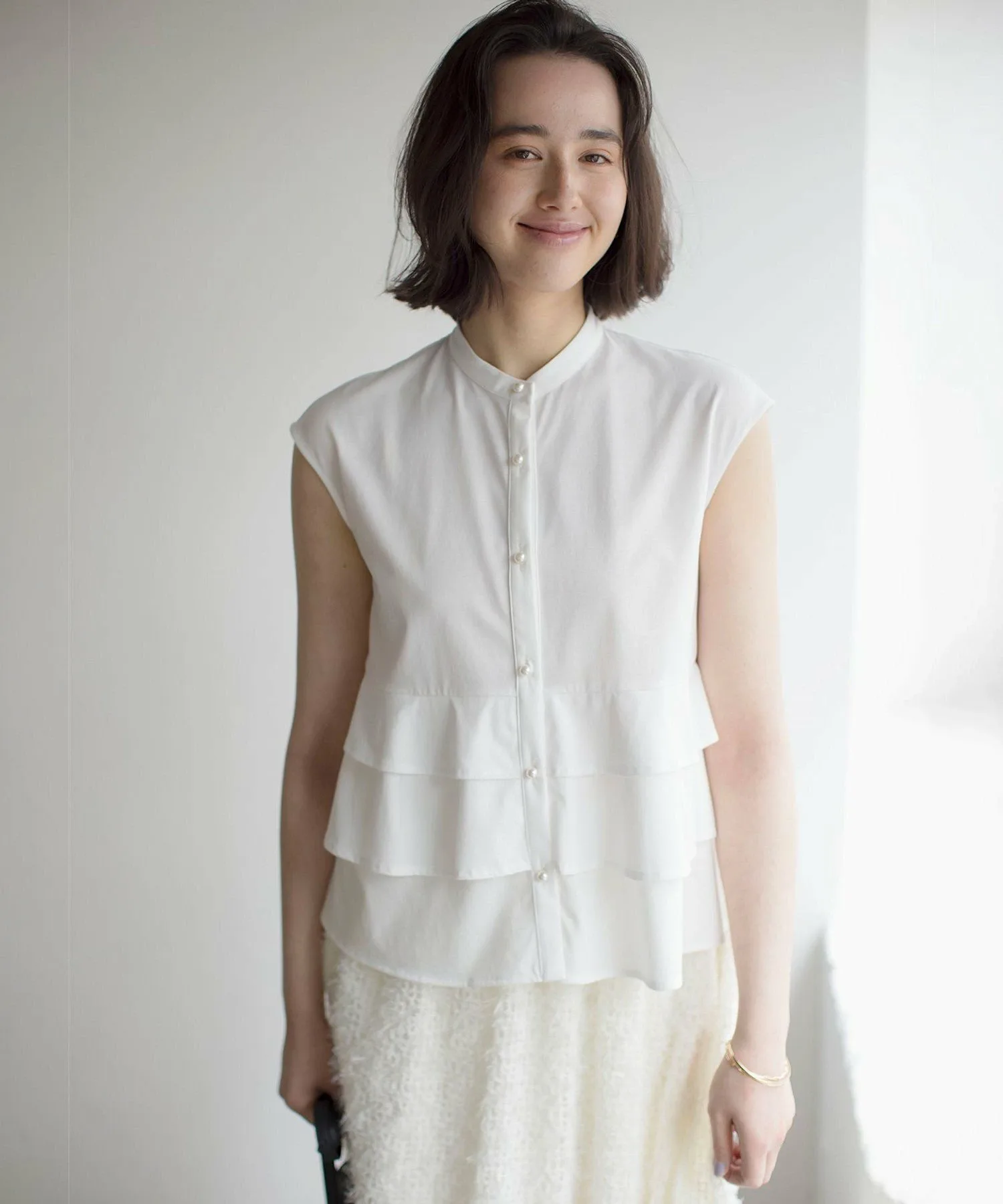 Простота в уходе! Элегантный топ, сшитый по фигуре, с дизайном, напоминающим блузку. Дизайн: Аккуратный топ, украшенный жемчужными пуговицами. ・Французские рукава для ощущения прохлады. ・Сочетайте его с кардиганом с коротким рукавом для создания многослойного образа.