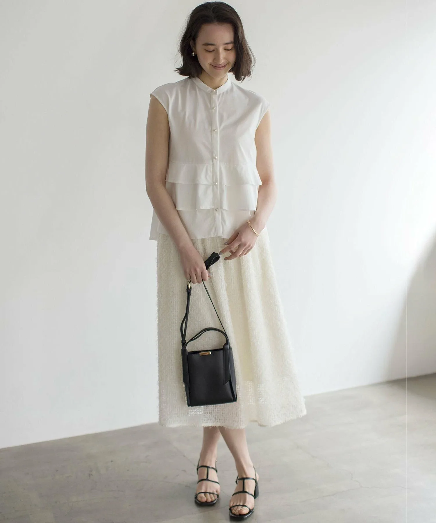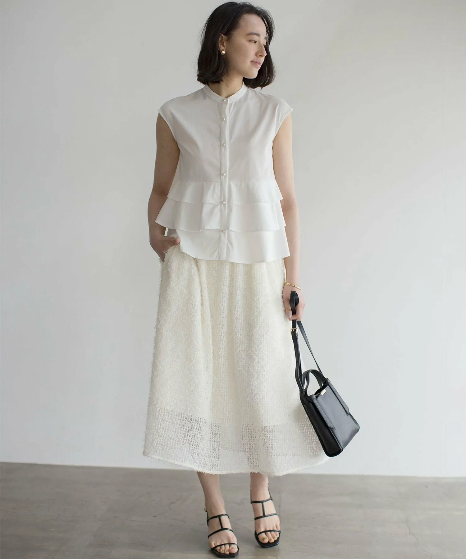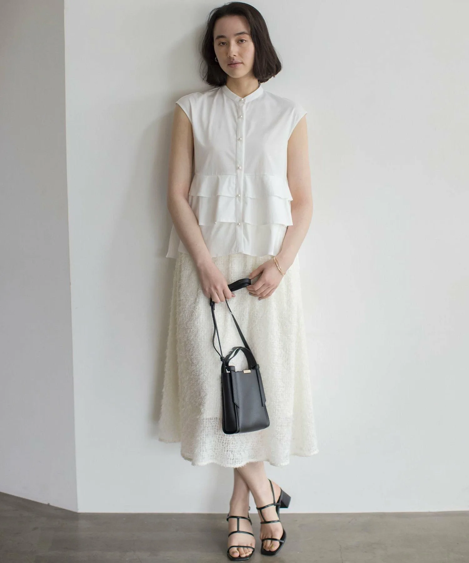 Простота в уходе! Элегантный топ, сшитый по фигуре, с дизайном, напоминающим блузку. Дизайн: Аккуратный топ, украшенный жемчужными пуговицами. ・Французские рукава для ощущения прохлады. ・Сочетайте его с кардиганом с коротким рукавом для создания многослойного образа.