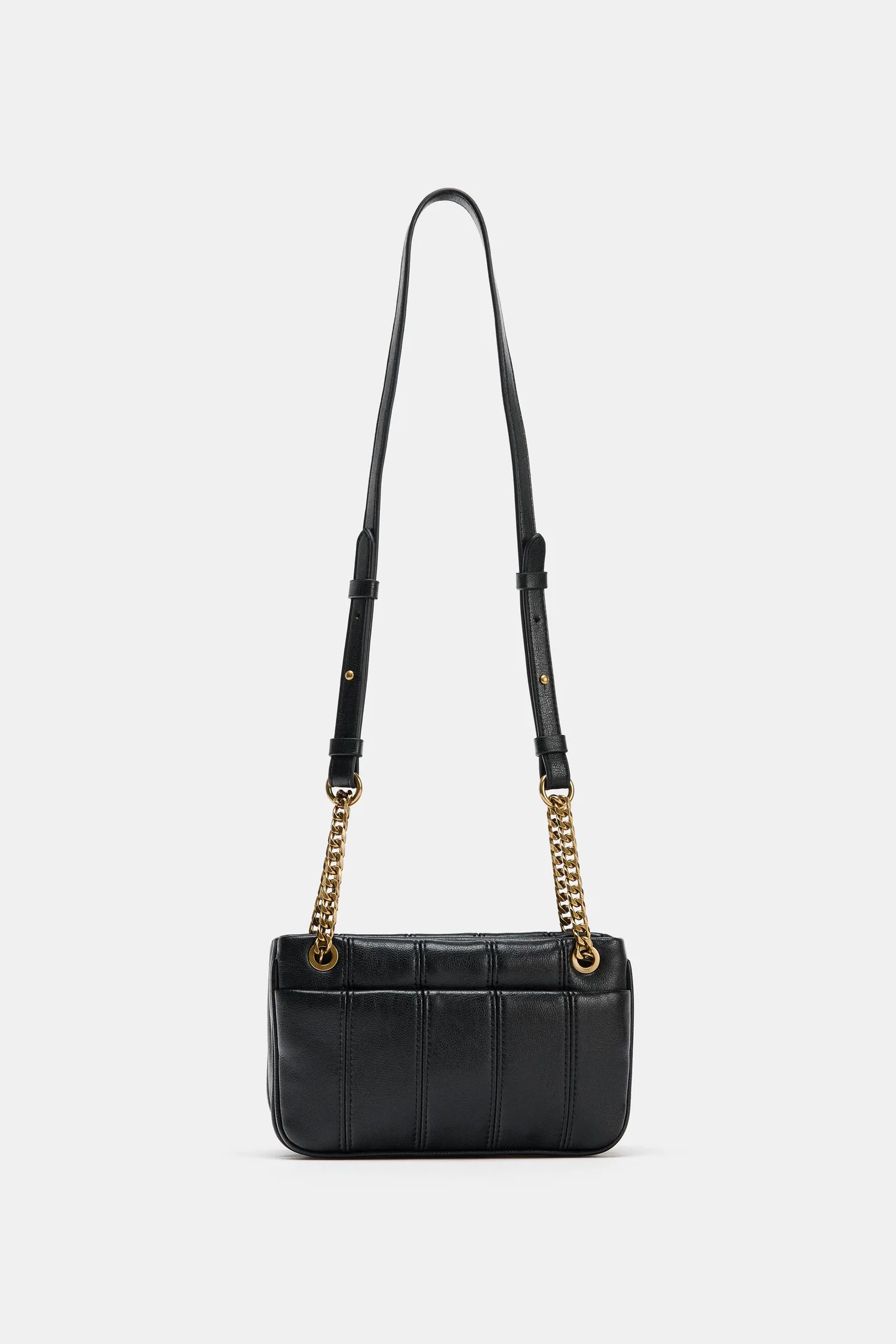 Мини-сумочка. Стеганая поверхность с декоративной строчкой. Передний карман на магнитной застежке. Два отделения: одно на магнитной застежке, другое на молнии. Внутренний карман. Ремешок через плечо с цепочкой.