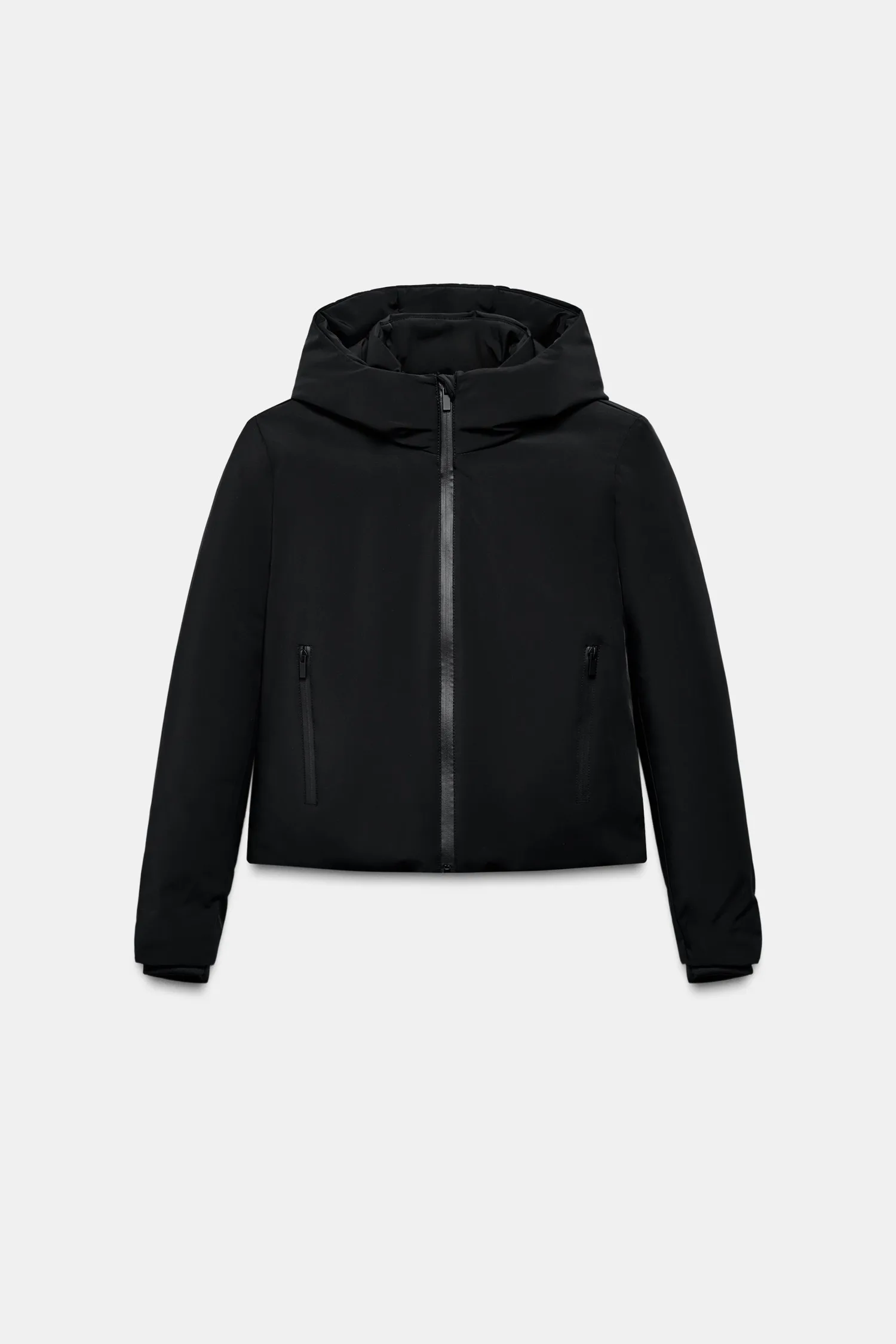 Анорак с внутренней подкладкой. Высокий воротник с капюшоном. Длинные рукава с эластичными манжетами. Передние карманы. Застежка спереди на термосварную молнию.