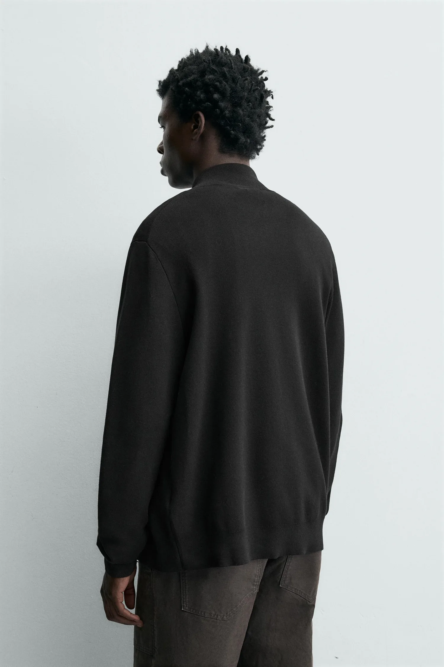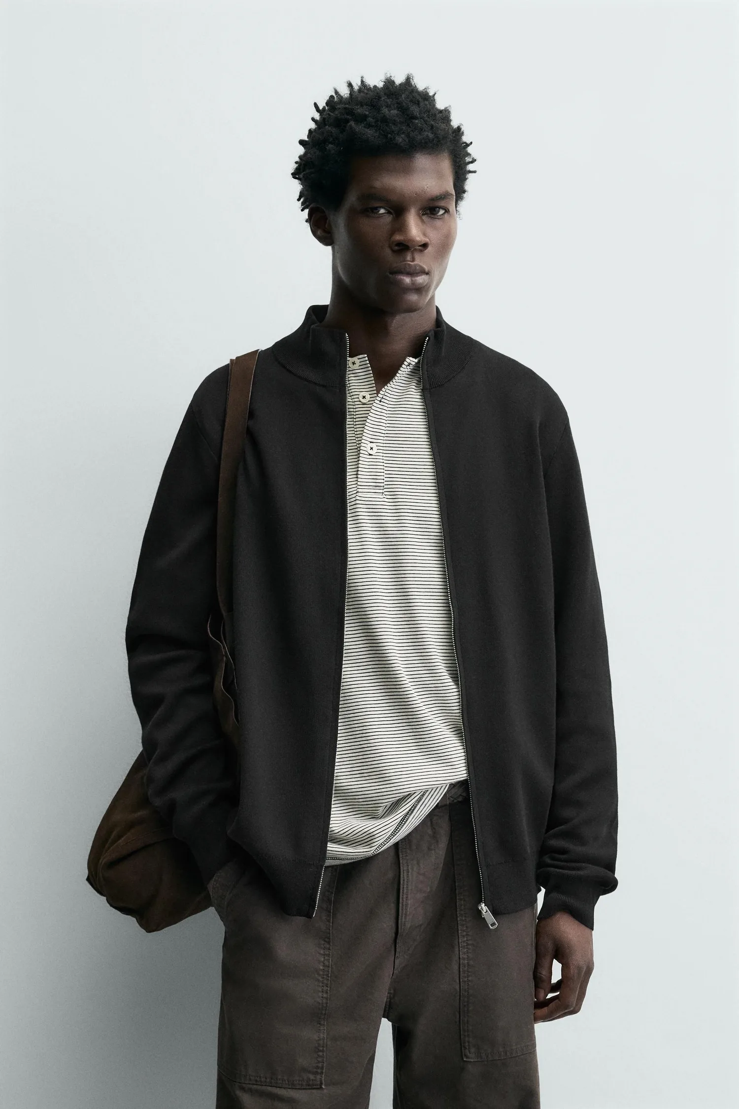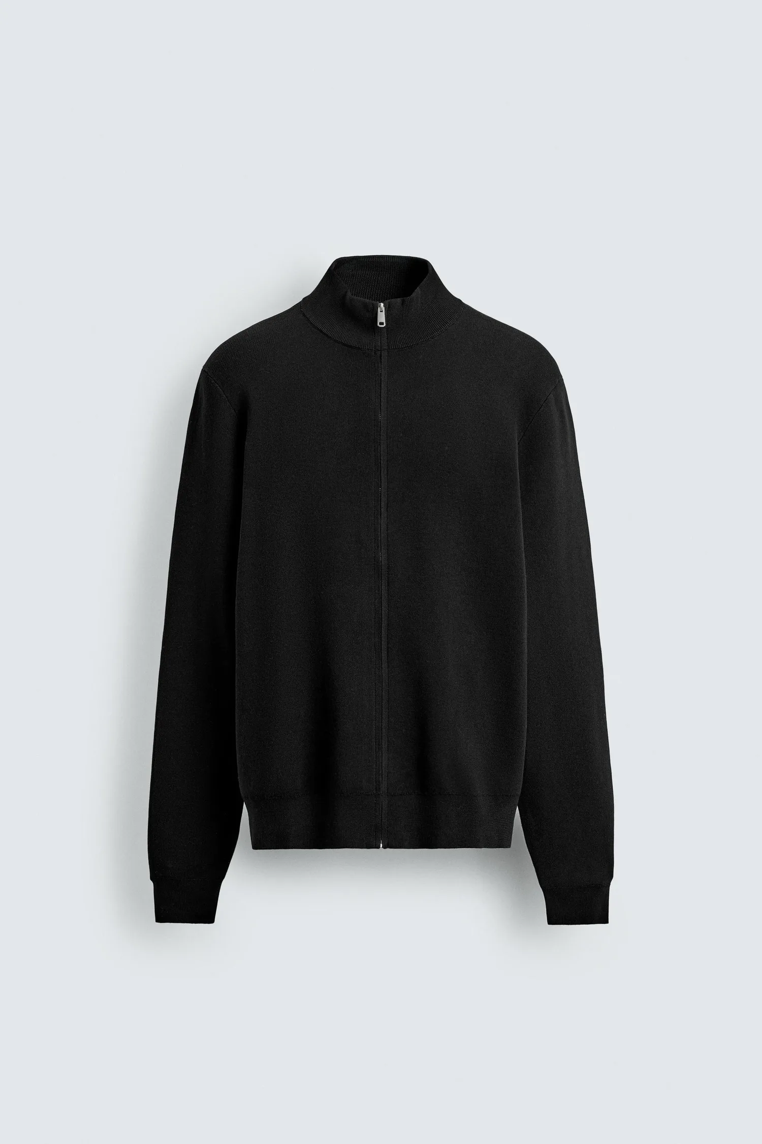 Кардиган прямого кроя из хлопковой пряжи. Высокий воротник, длинные рукава и ребристая отделка. Застежка-молния спереди.