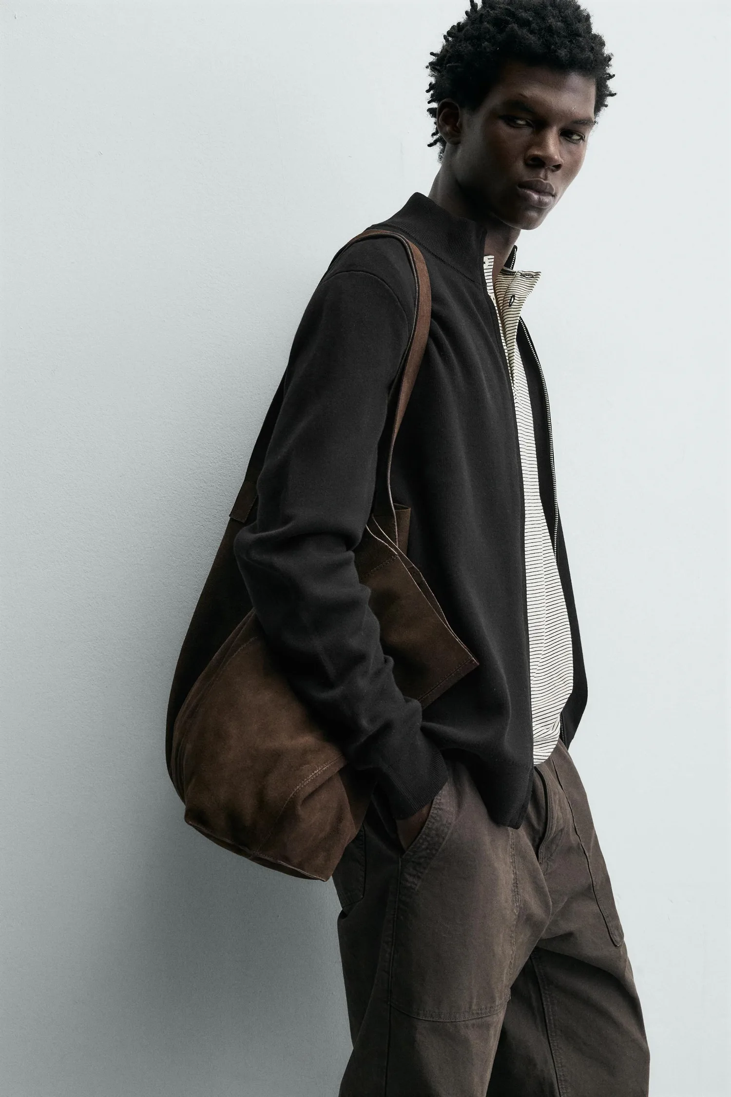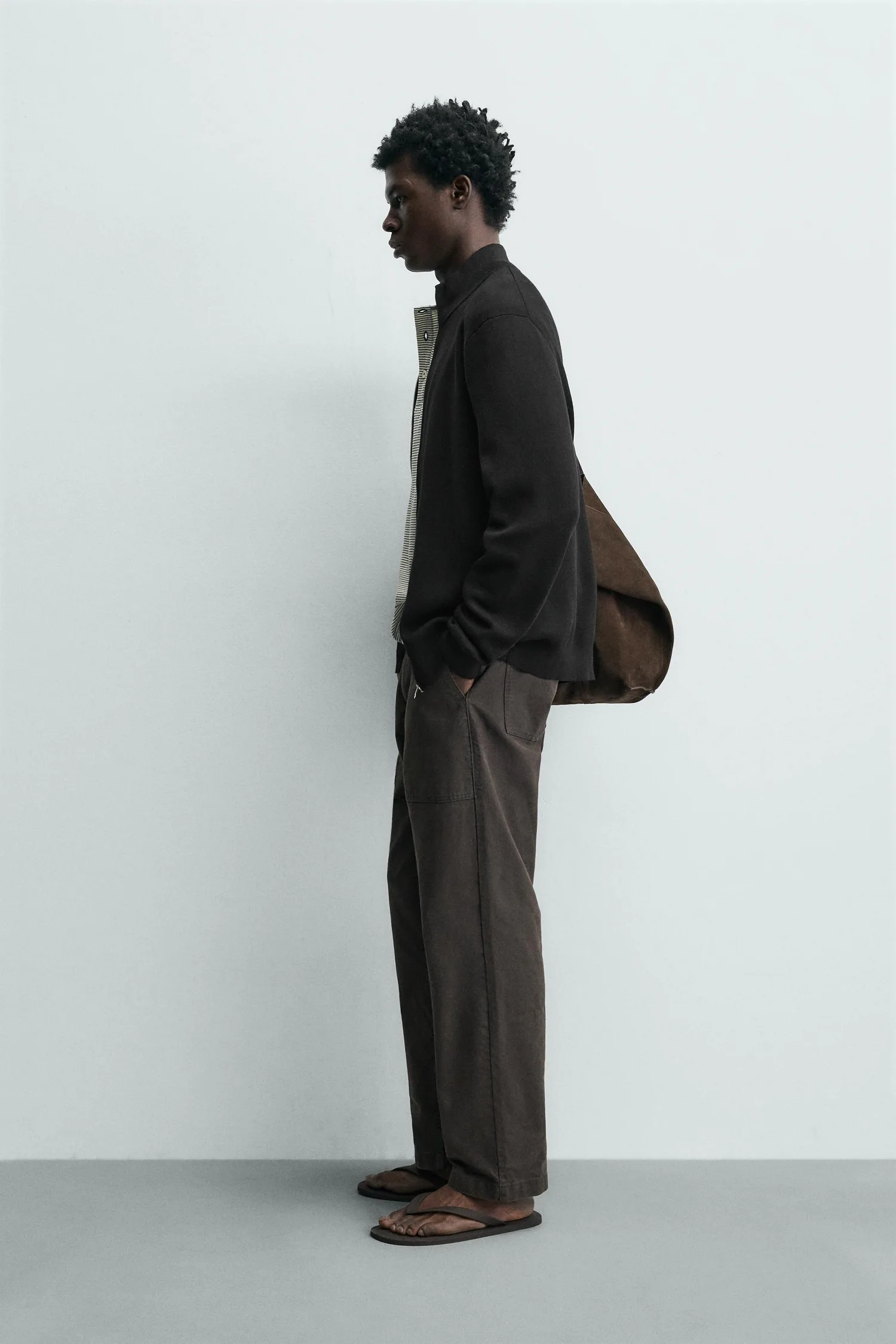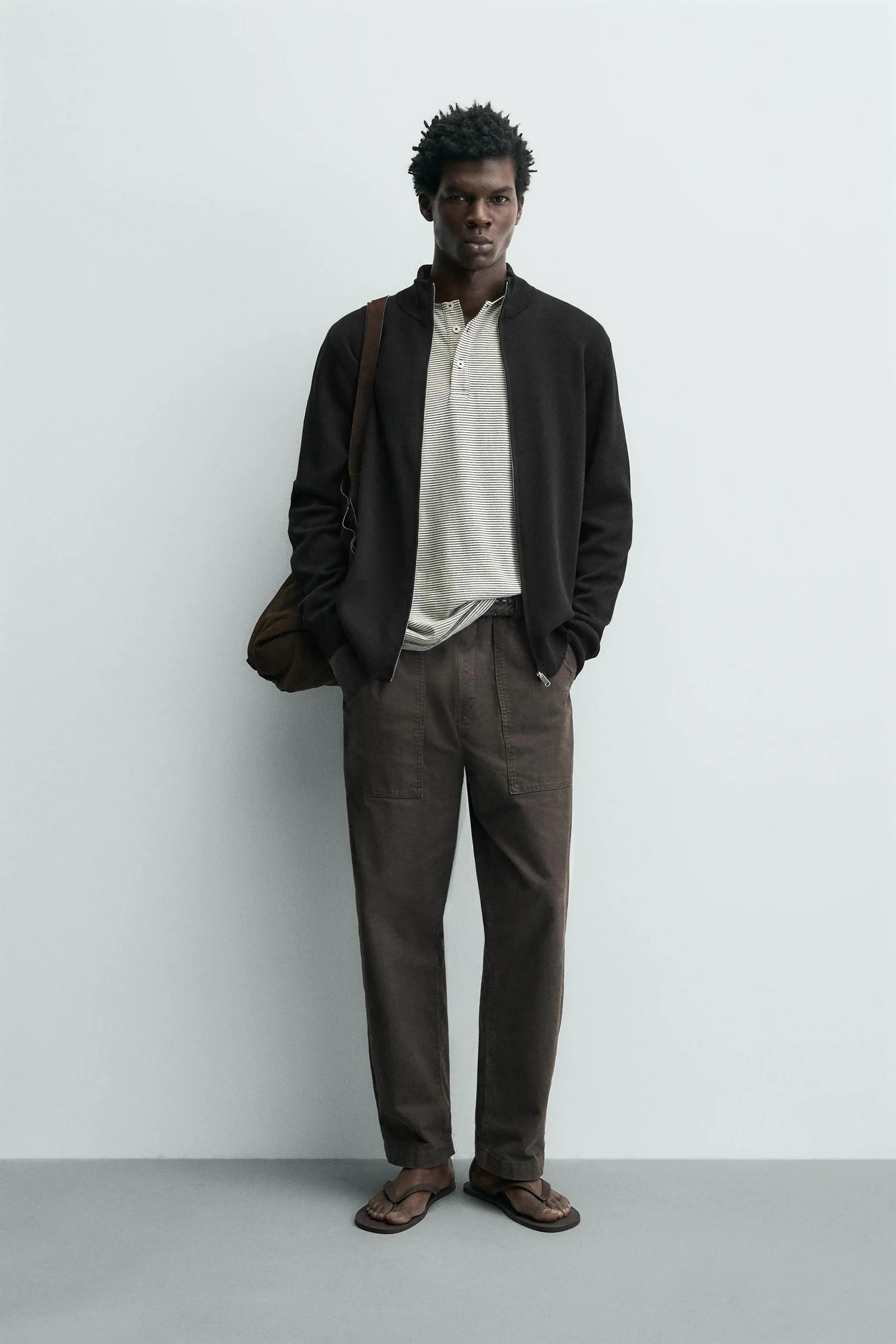 Кардиган прямого кроя из хлопковой пряжи. Высокий воротник, длинные рукава и ребристая отделка. Застежка-молния спереди.