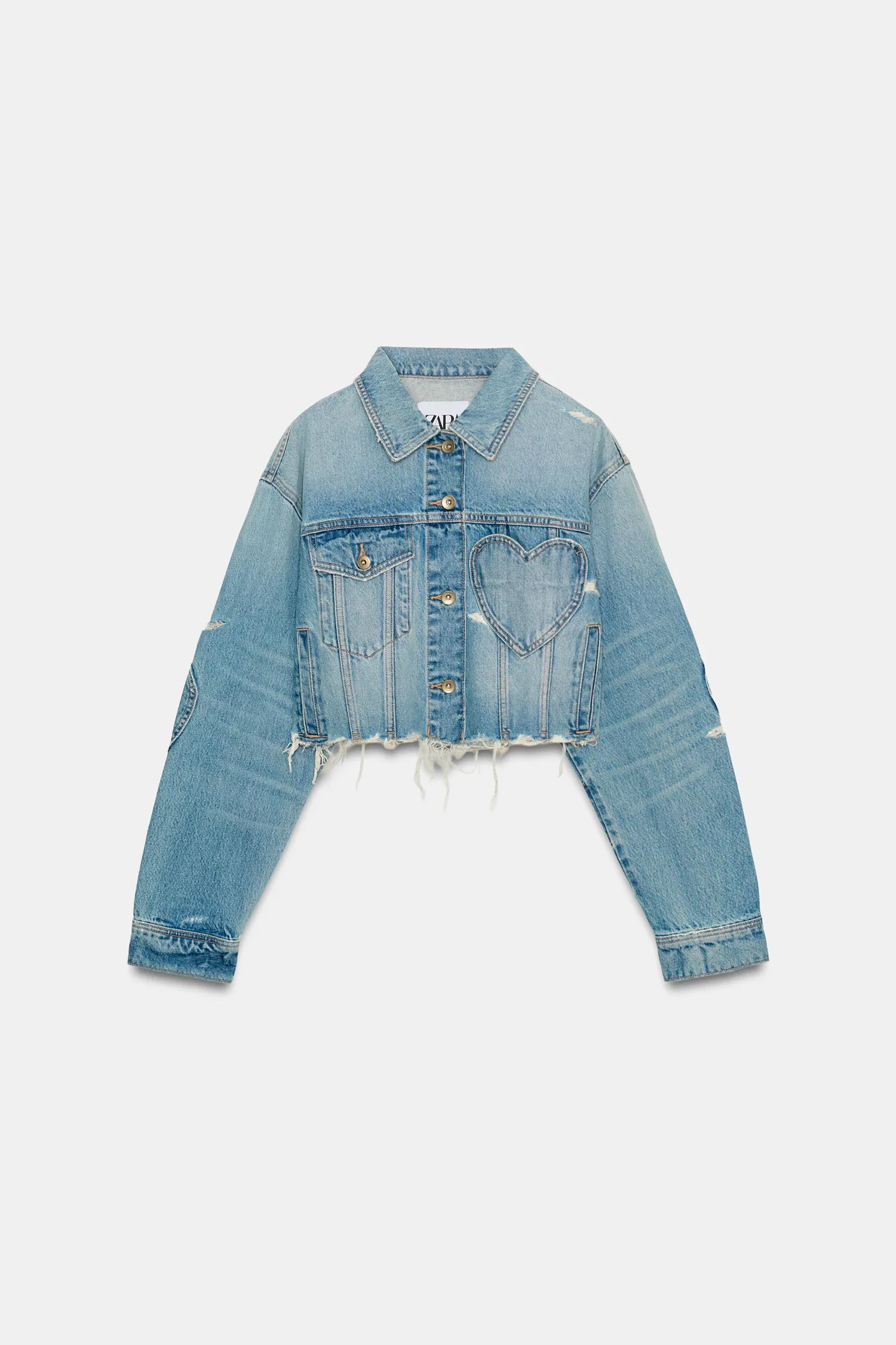 Укороченная куртка с отложным воротником и длинными рукавами с манжетами. Передние карманы. Деталь в виде нашивки в форме сердца. Бахрома по низу. Застежка на металлические пуговицы спереди.