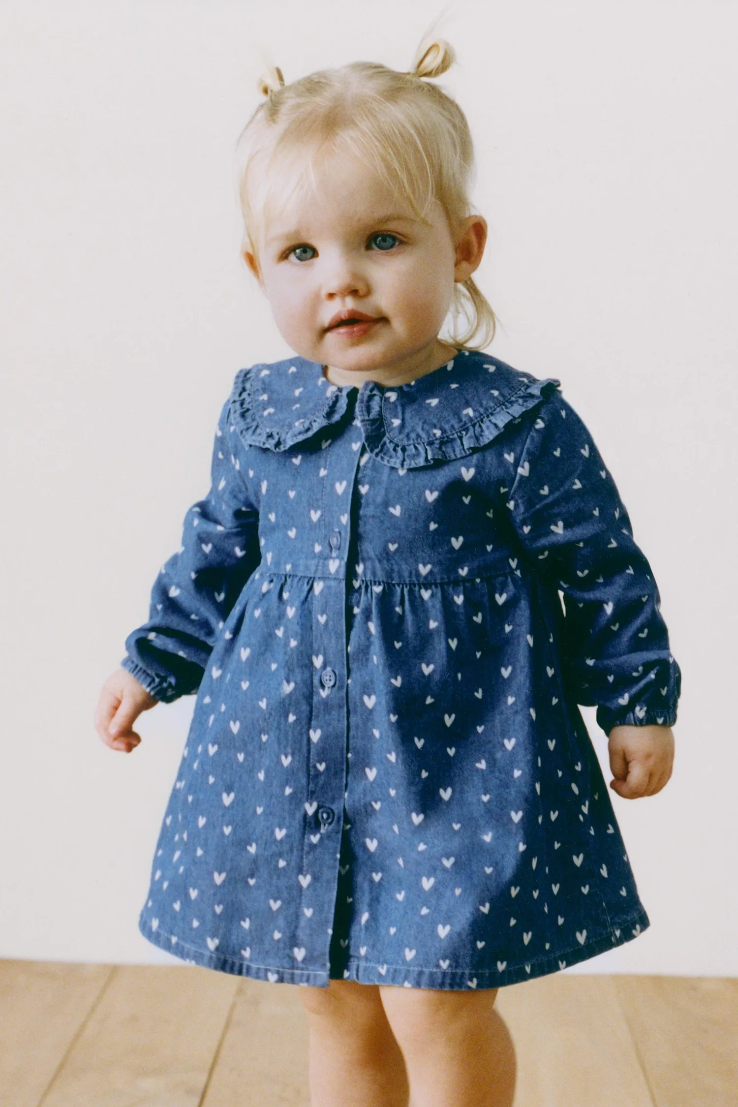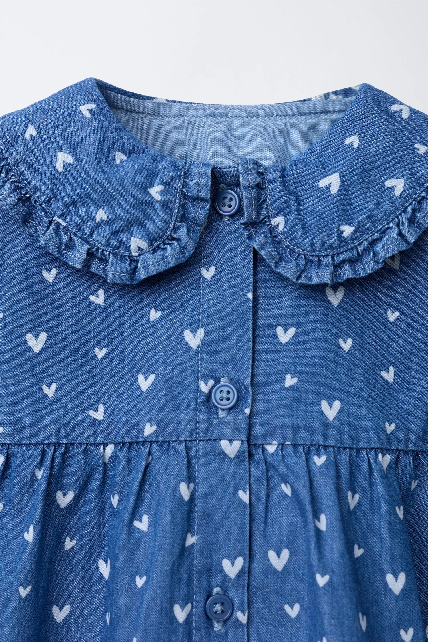 Платье с воротником «Питер Пэн» и длинными рукавами с эластичными манжетами. Застежка на пуговицы спереди. Трусики с эластичным поясом. Принт в виде сердечек.