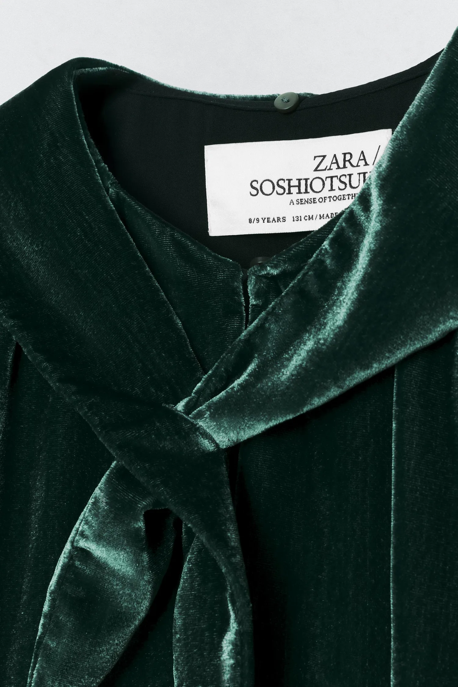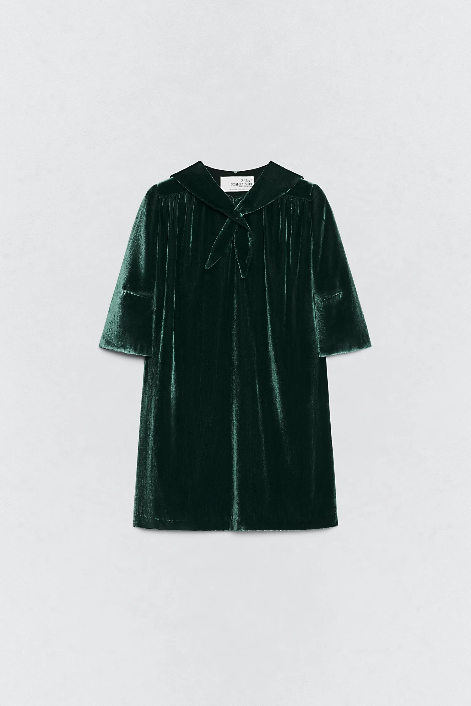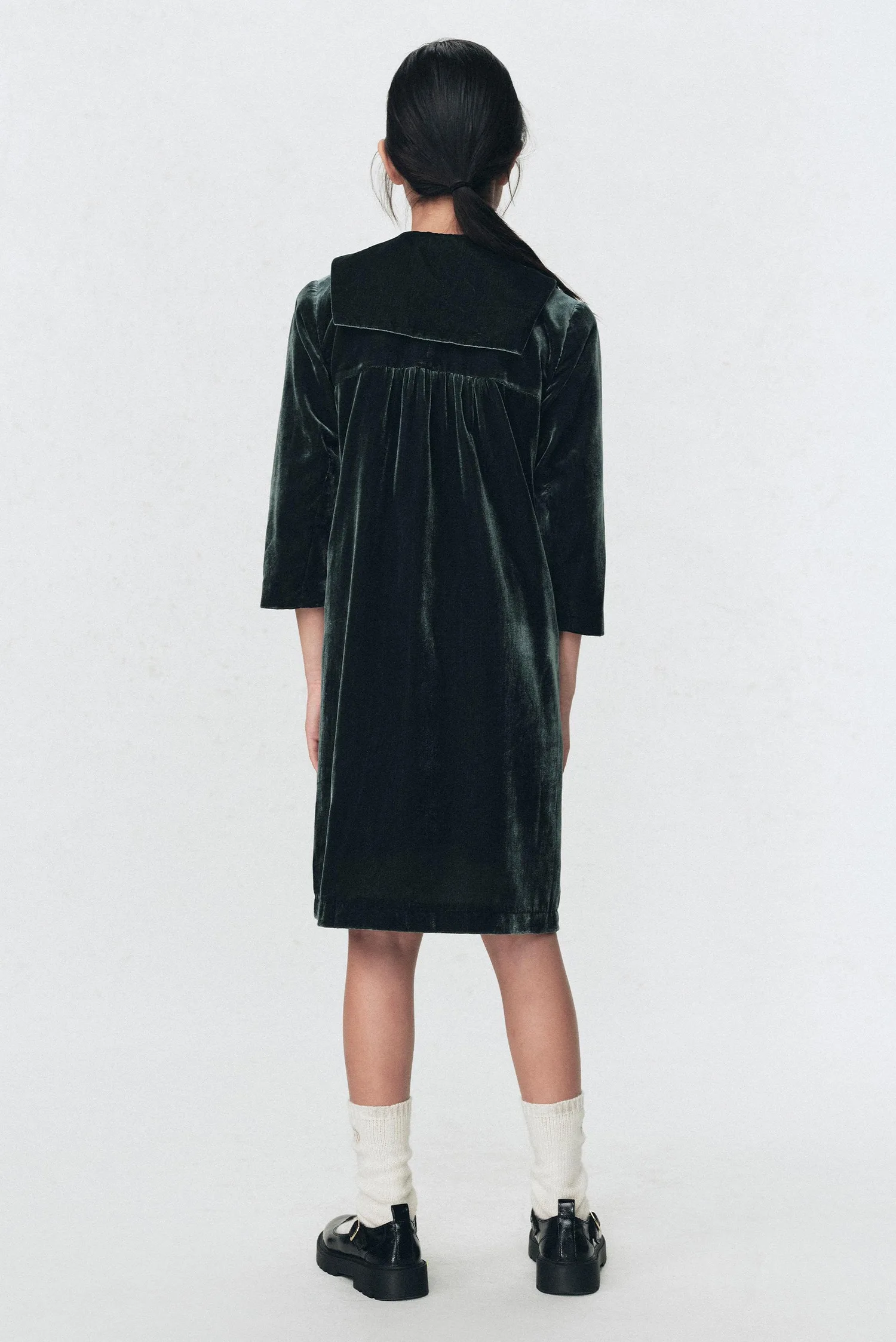 Бархатное платье с круглым вырезом и короткими рукавами. Съемный шарф с пуговицами.