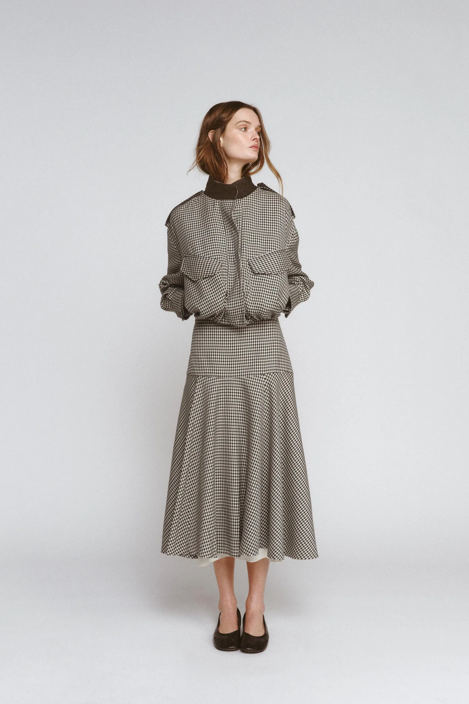 Бомбер из пряжи с добавлением вискозы. Имеет контрастный воротник-стойку и длинные рукава с манжетами. Накладные карманы спереди. Внутренняя подкладка. Застежка-молния спереди и скрытые пуговицы под планкой.
