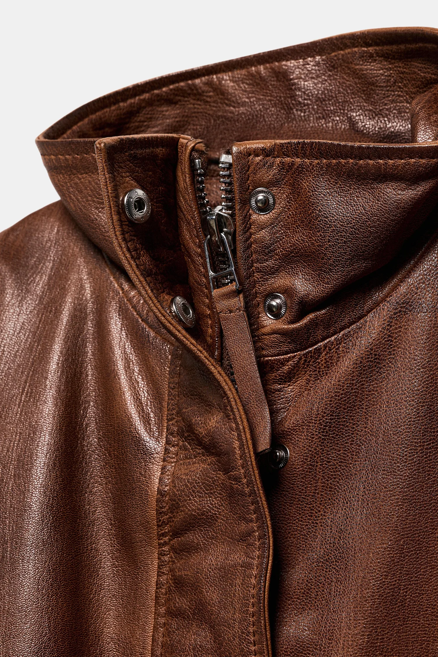 Куртка из 100% натуральной кожи. Высокий воротник и длинные рукава с манжетами на молнии. Передние накладные карманы. Внутренняя подкладка. Застежка-молния спереди и потайные кнопки.
