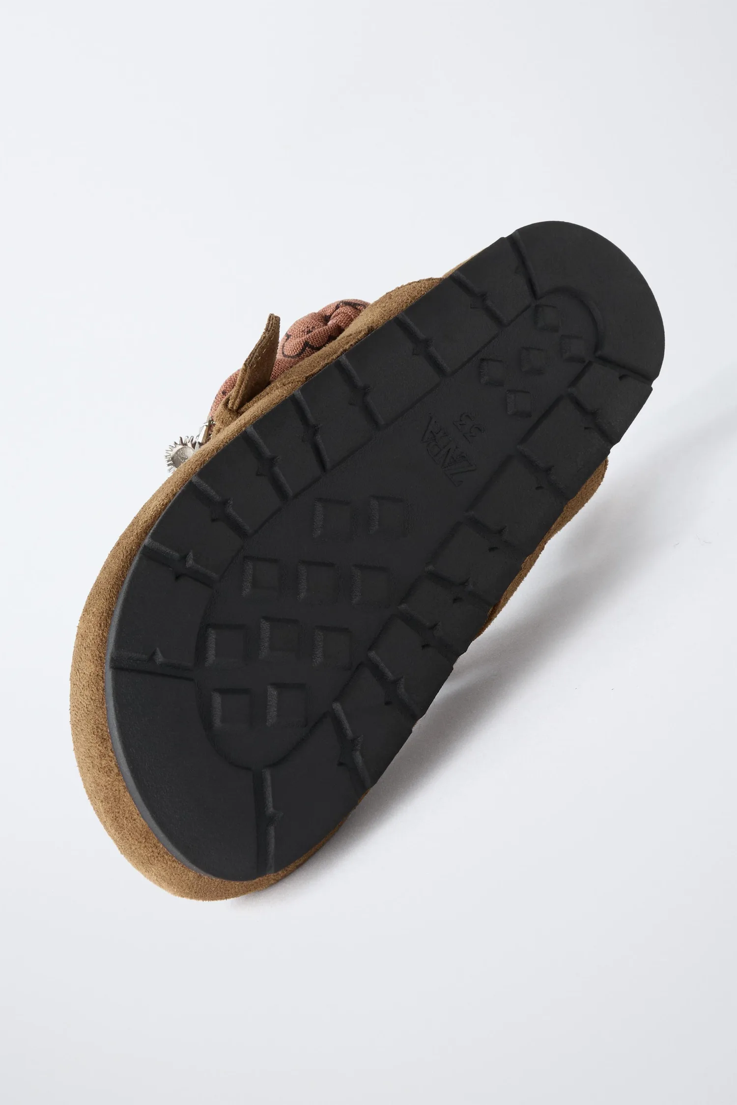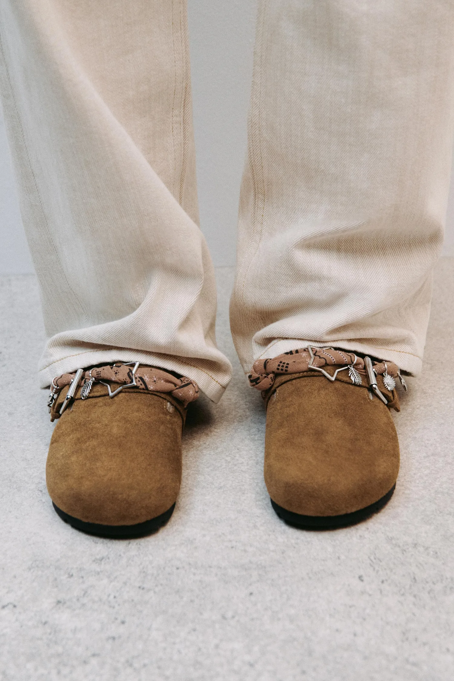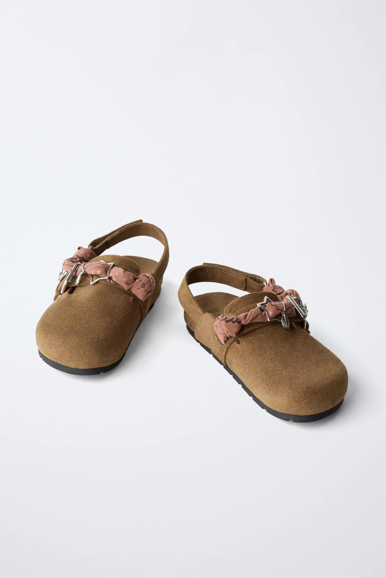 Сабо с пряжкой и отделкой в виде банданы на подъеме. Застегиваются на ремешок с липучкой сзади. Контрастная резиновая подошва.