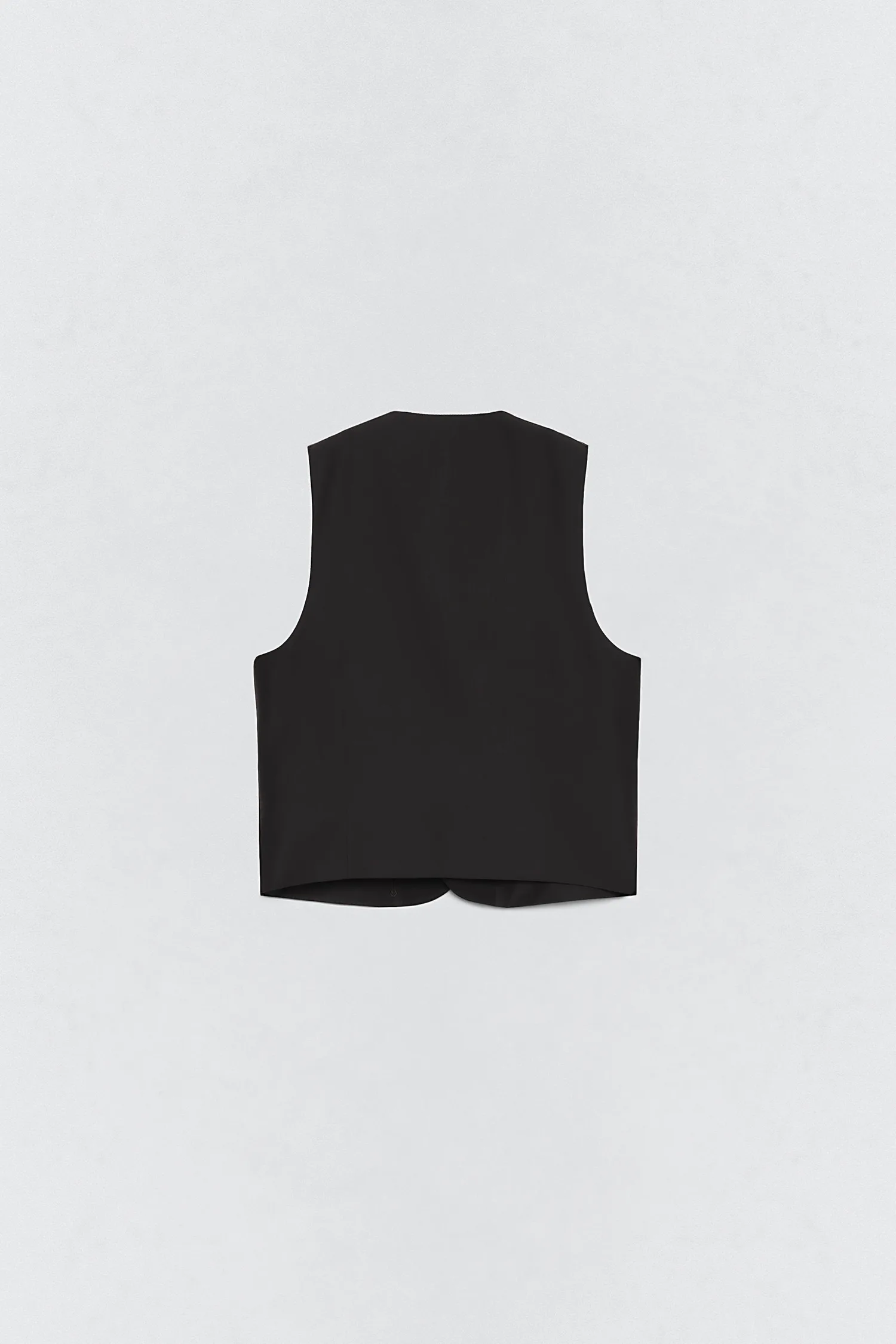 Жилет с V-образным вырезом и без рукавов. Застежка на пуговицы спереди. Прорезные карманы спереди.