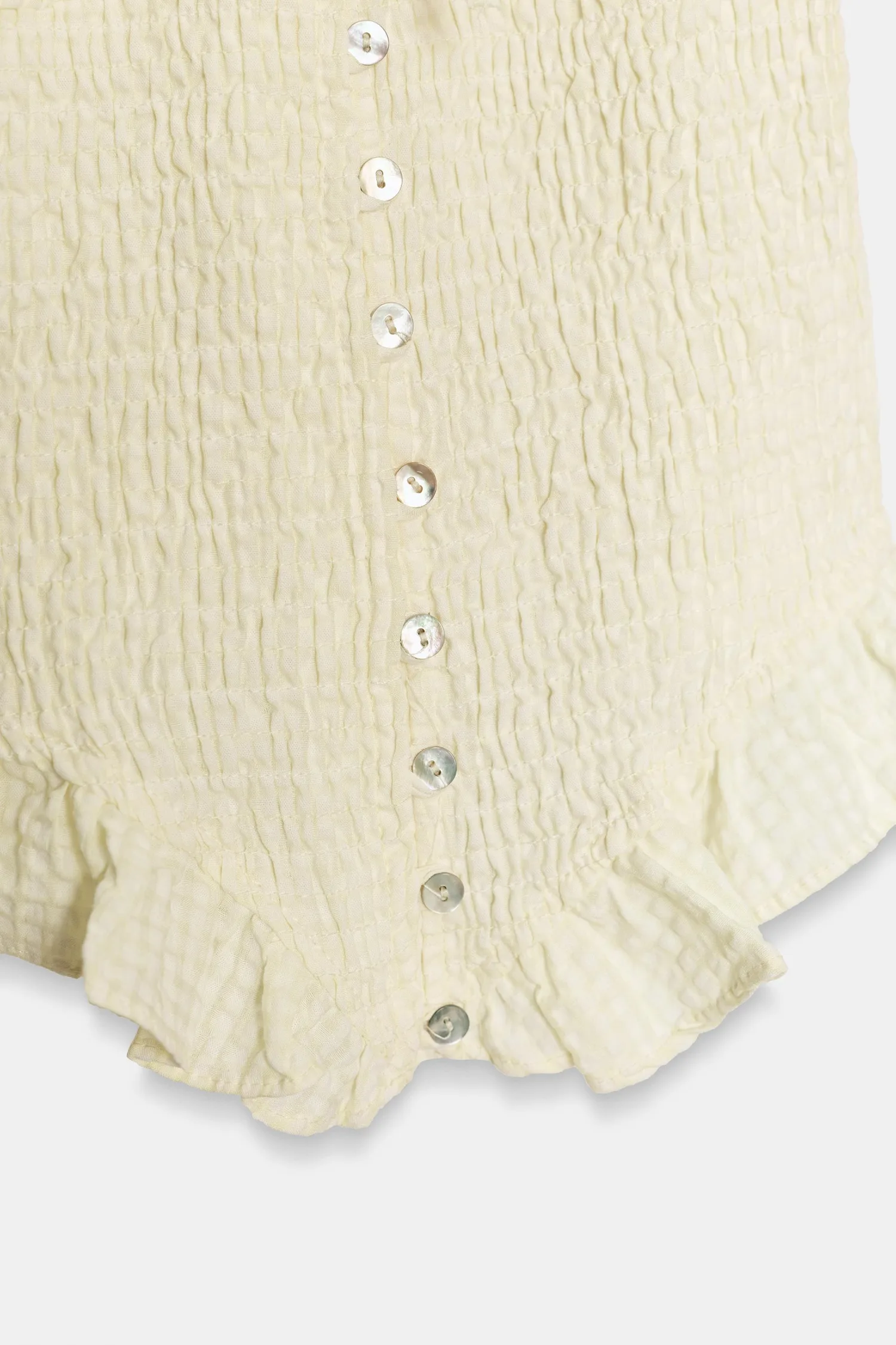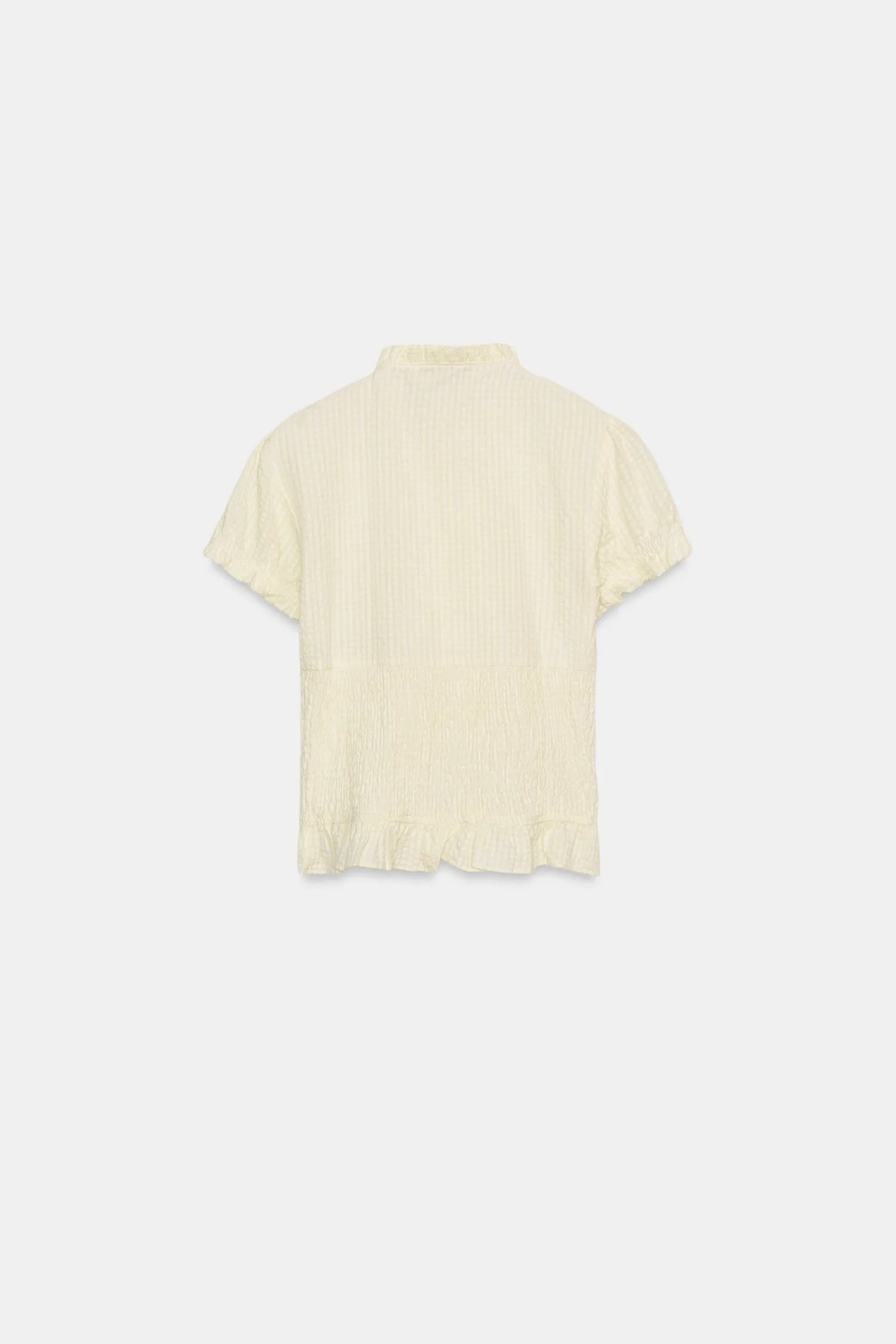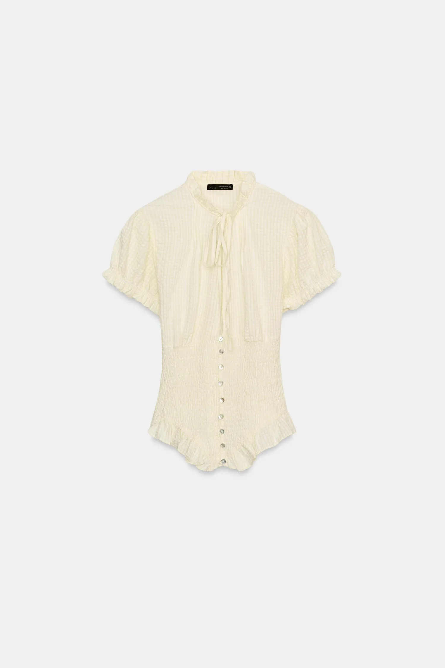 Топ с круглым вырезом, бантом и V-образным вырезом. Короткие рукава-фонарики с эластичными манжетами. Эластичная ткань с сотовой структурой. Застежка на пуговицы спереди.