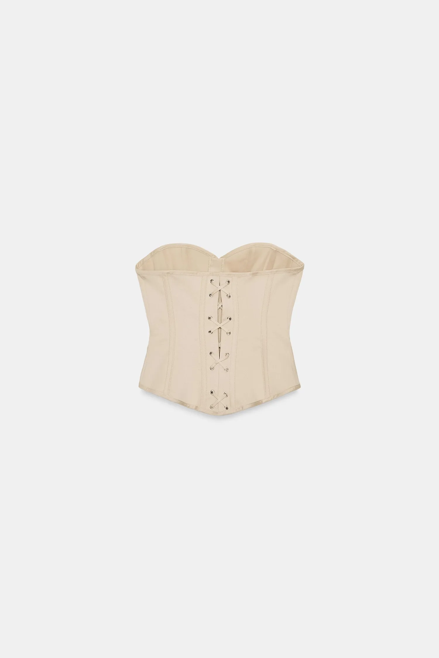 Вырез в форме сердца и открытые плечи. Встроенные косточки. Подкладка в тон. Застежка на металлические крючки спереди и перекрестная шнуровка сзади с завязкой.