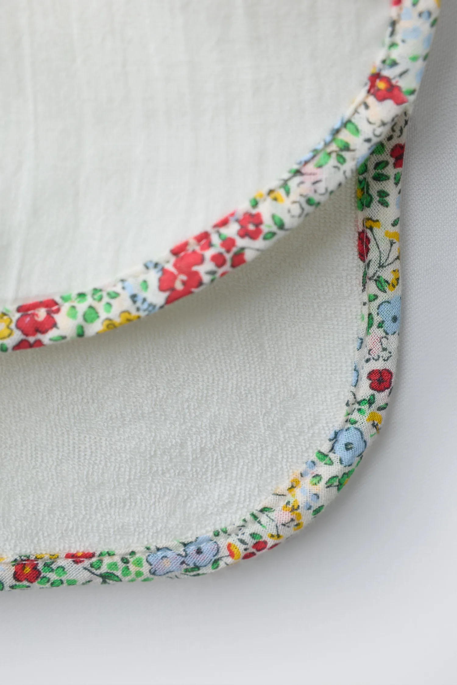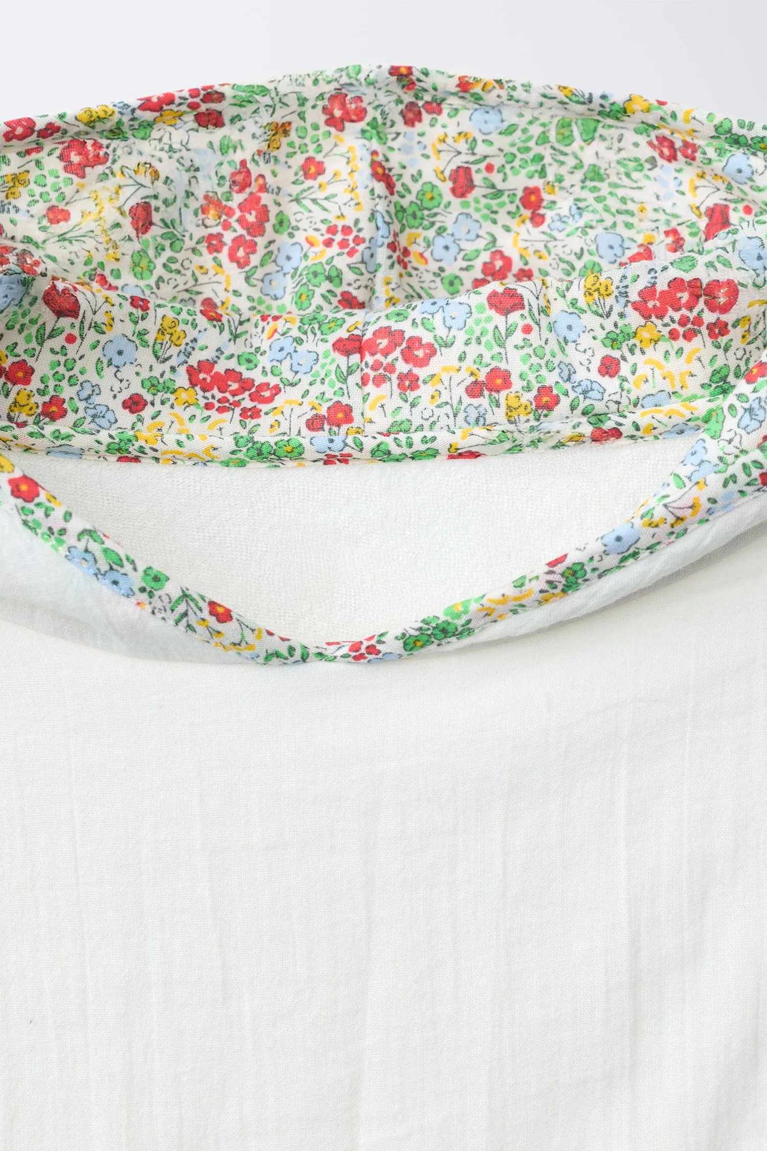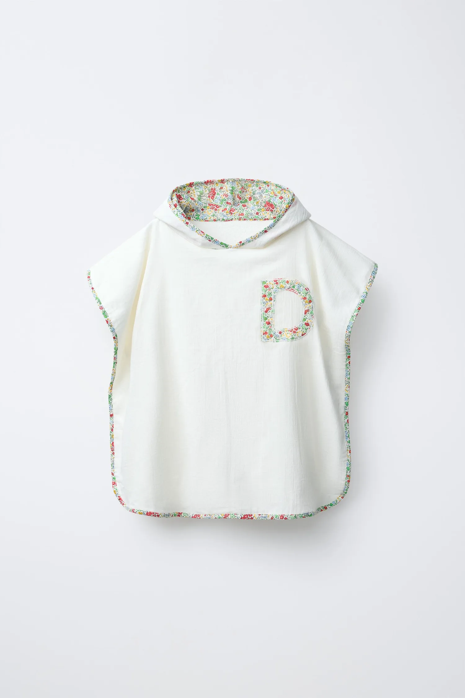 Полотенце в стиле пончо с капюшоном. Украшено вышитой инициалом на груди и цветочной отделкой.