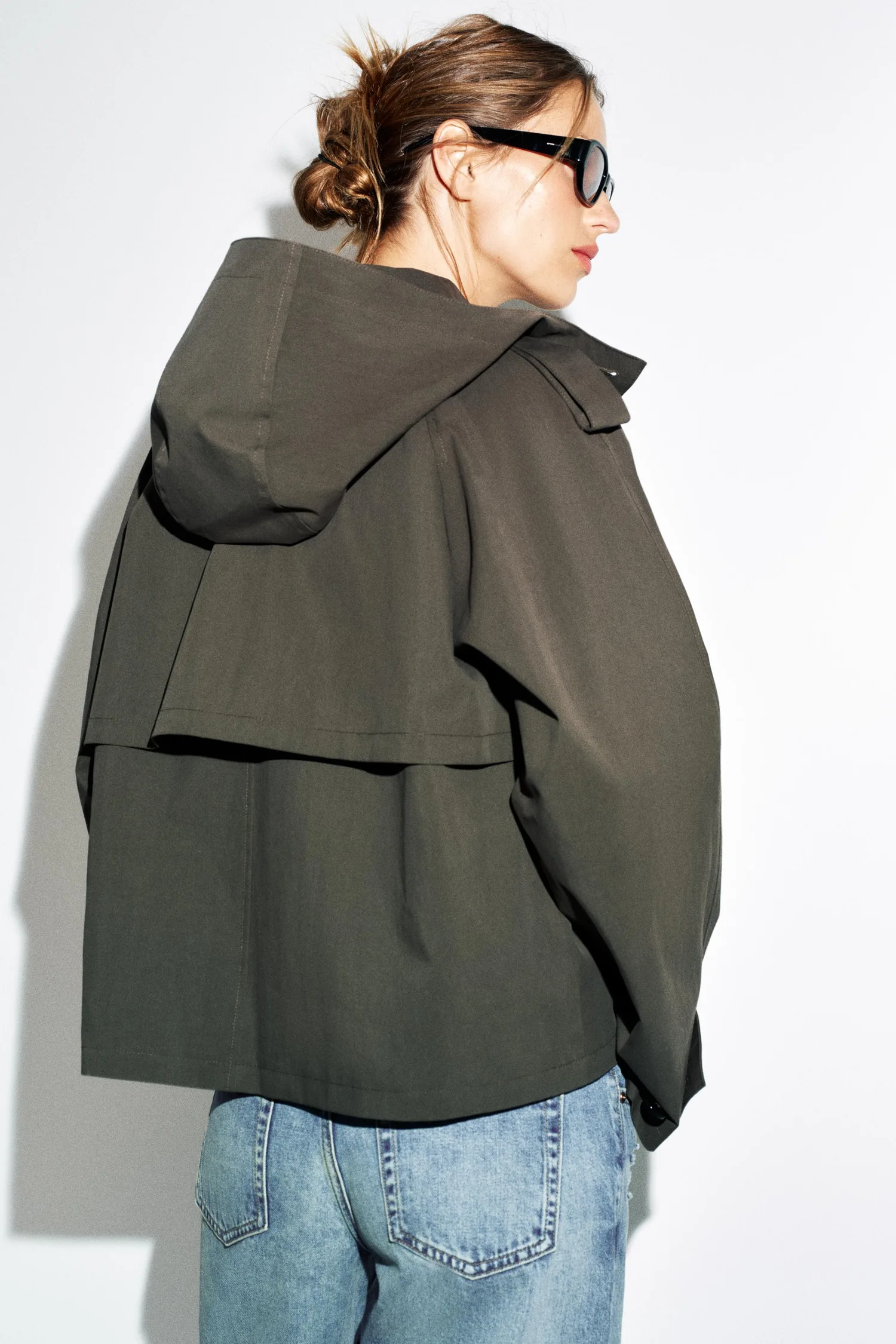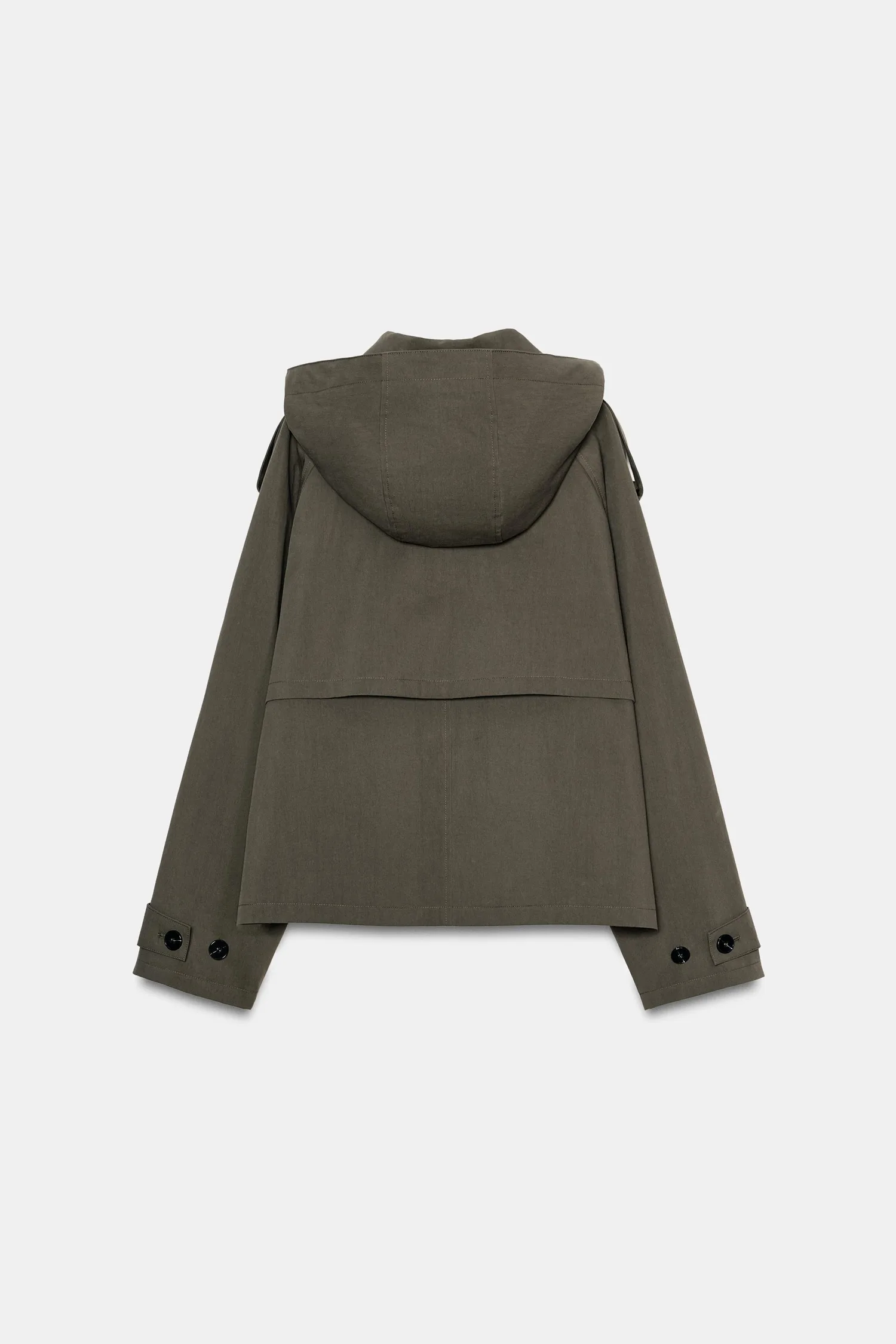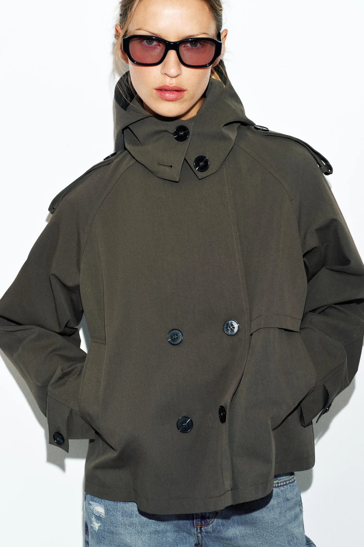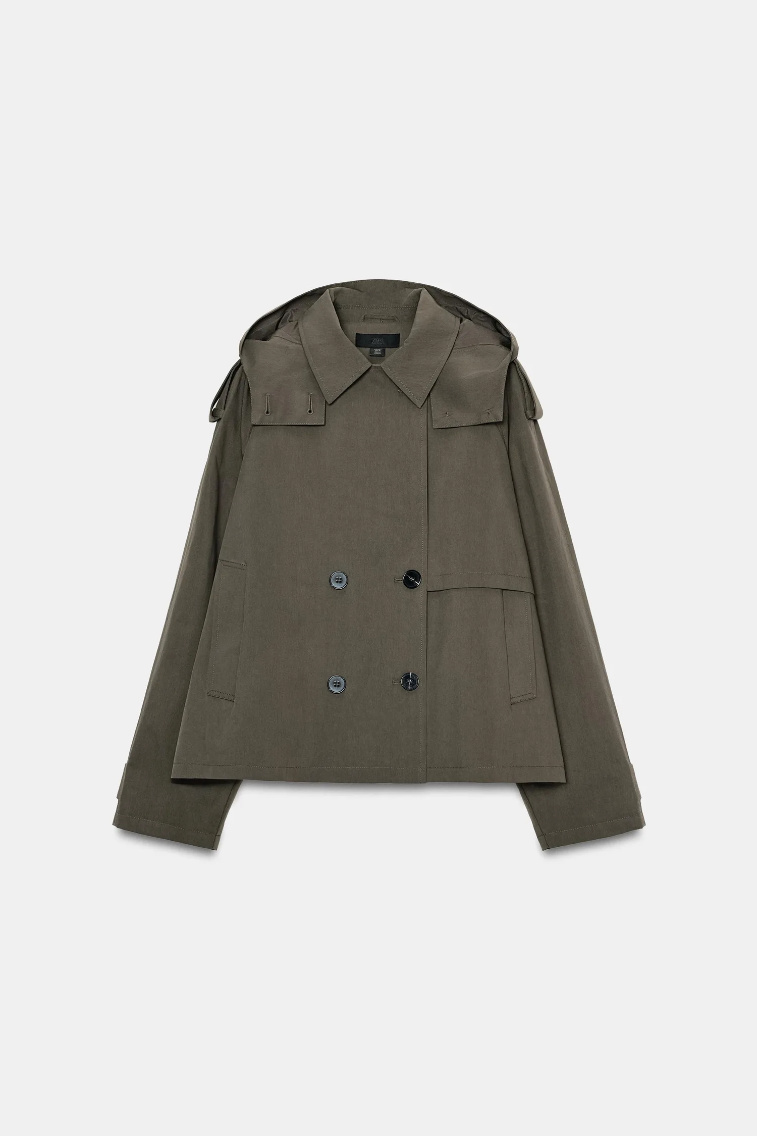 Короткий тренч с воротником, капюшоном и длинными рукавами с застежками-хомутками. Имеет прорезные карманы спереди и двубортную застежку на пуговицы.