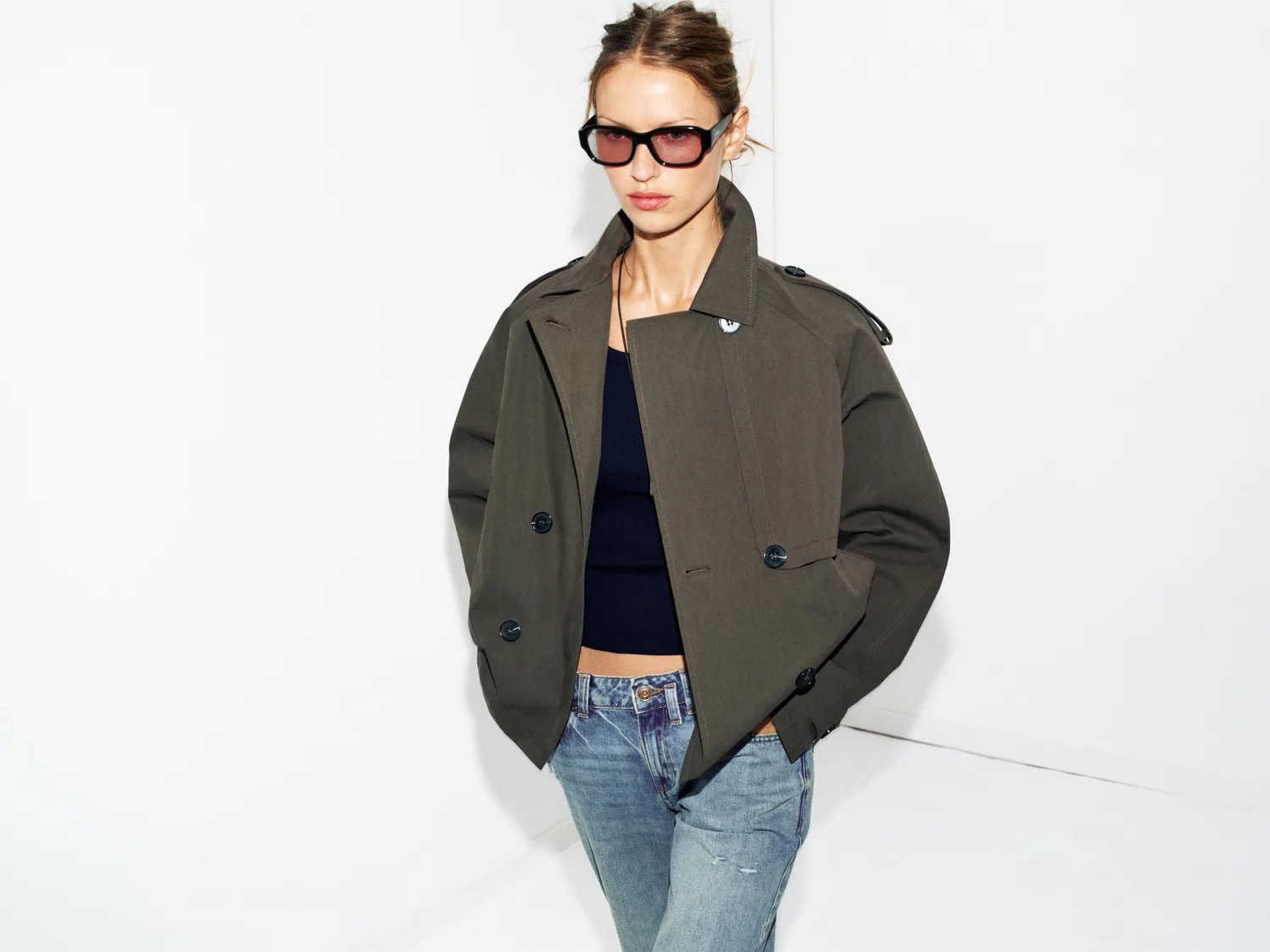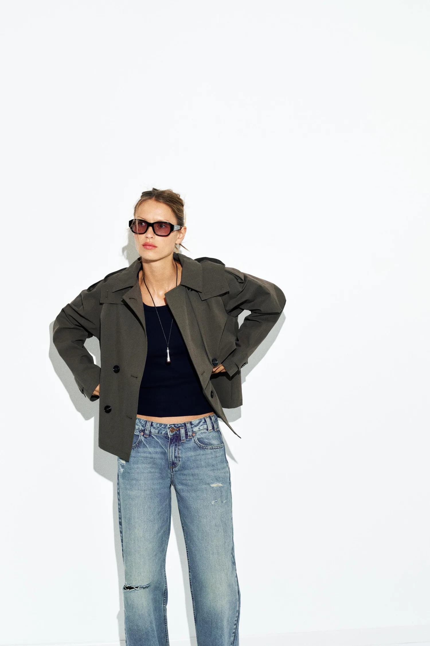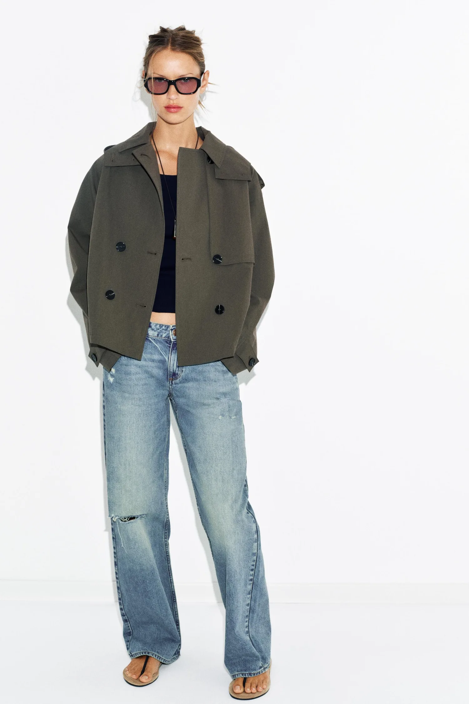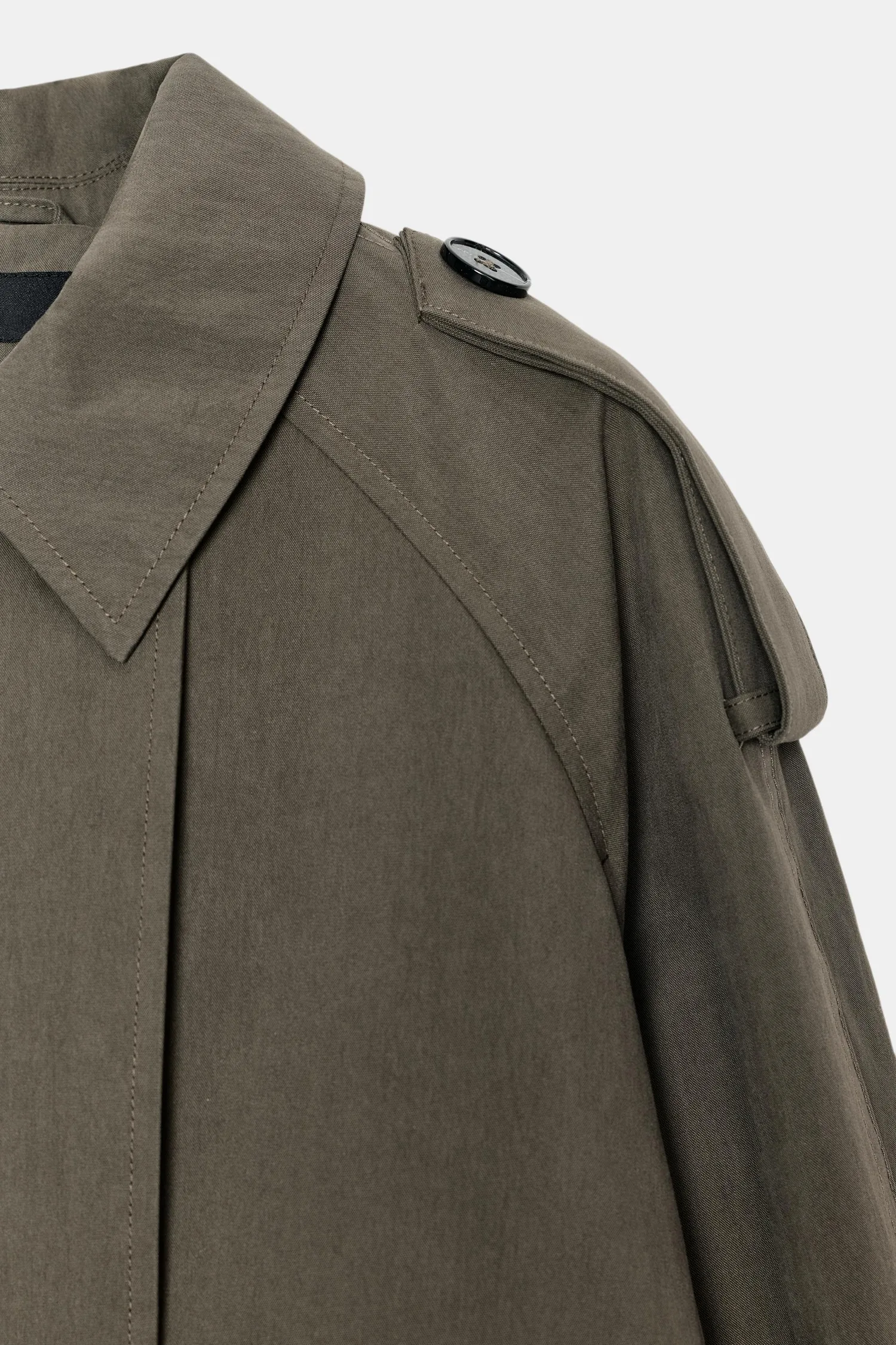 Короткий тренч с воротником, капюшоном и длинными рукавами с застежками-хомутками. Имеет прорезные карманы спереди и двубортную застежку на пуговицы.