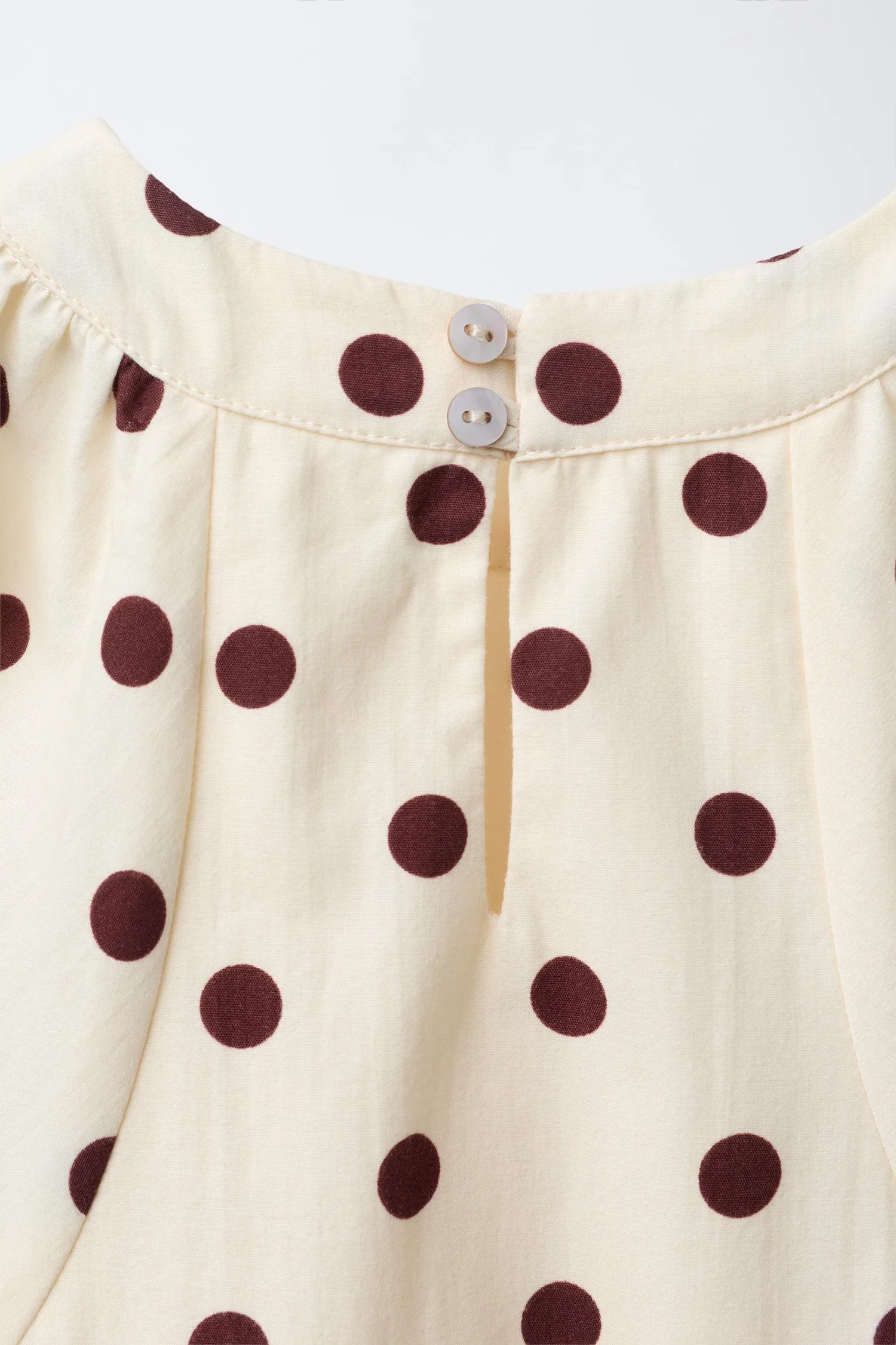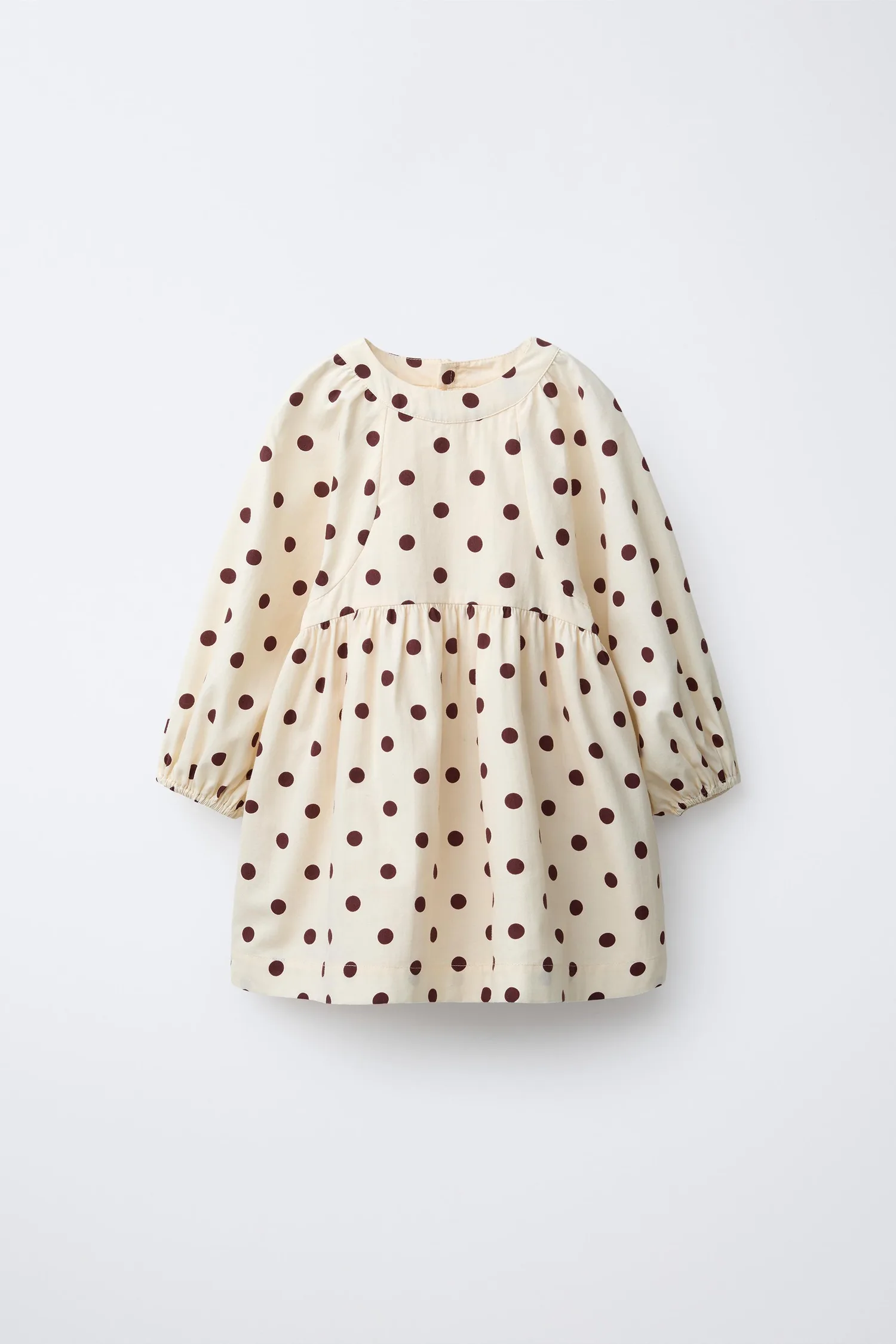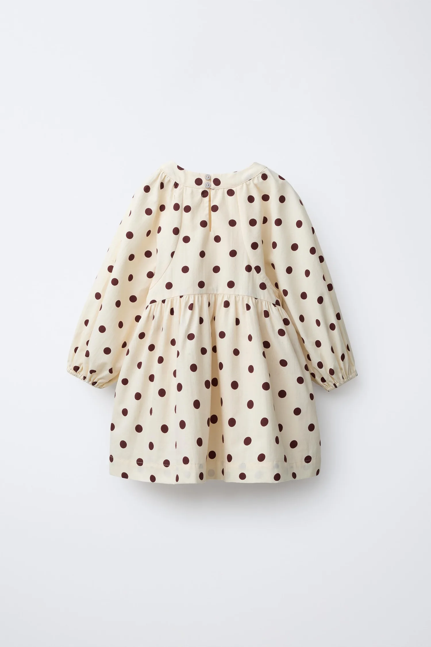 Платье с круглым вырезом и длинными рукавами на резинке. Застежка на пуговицы сзади. Принт в горошек.