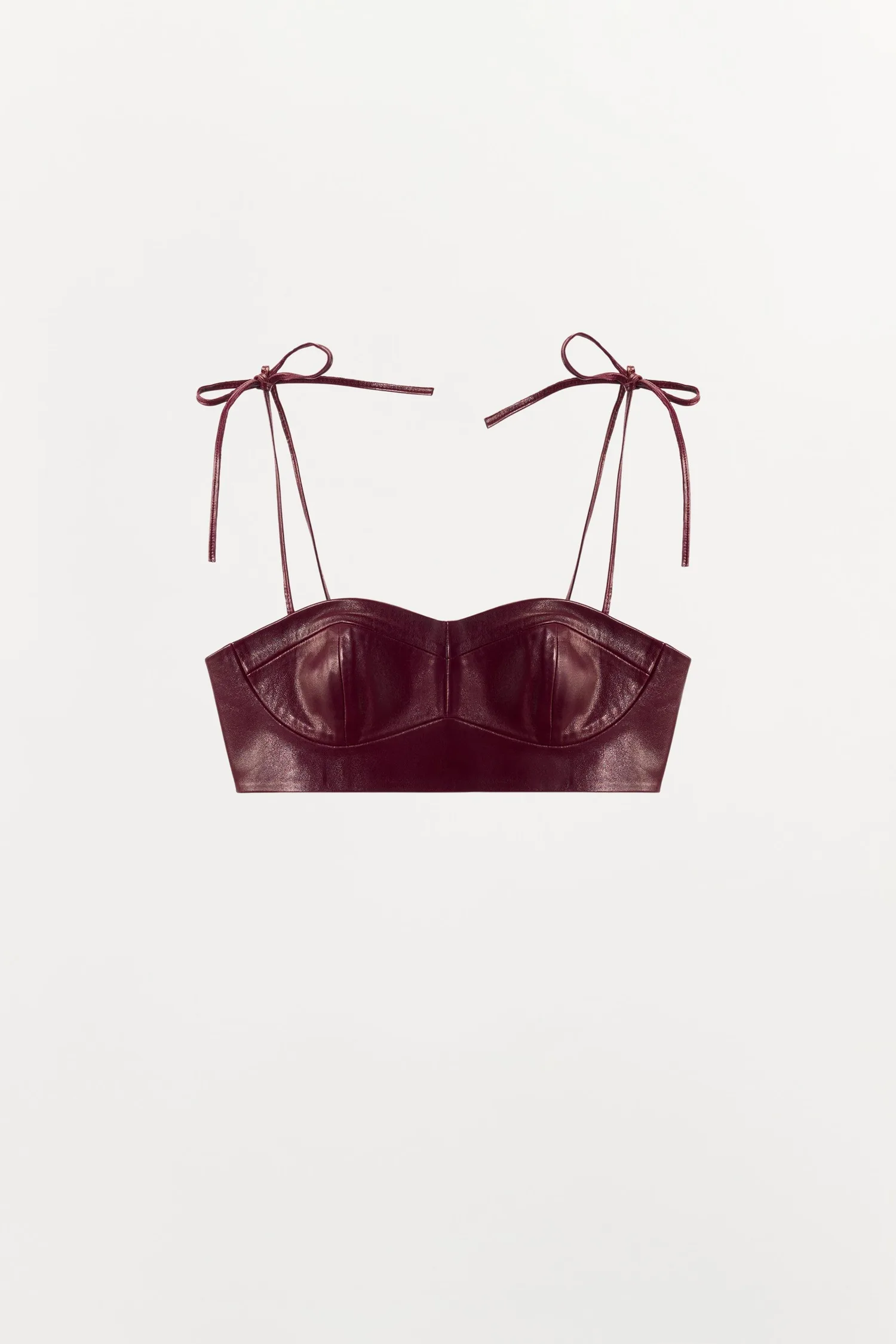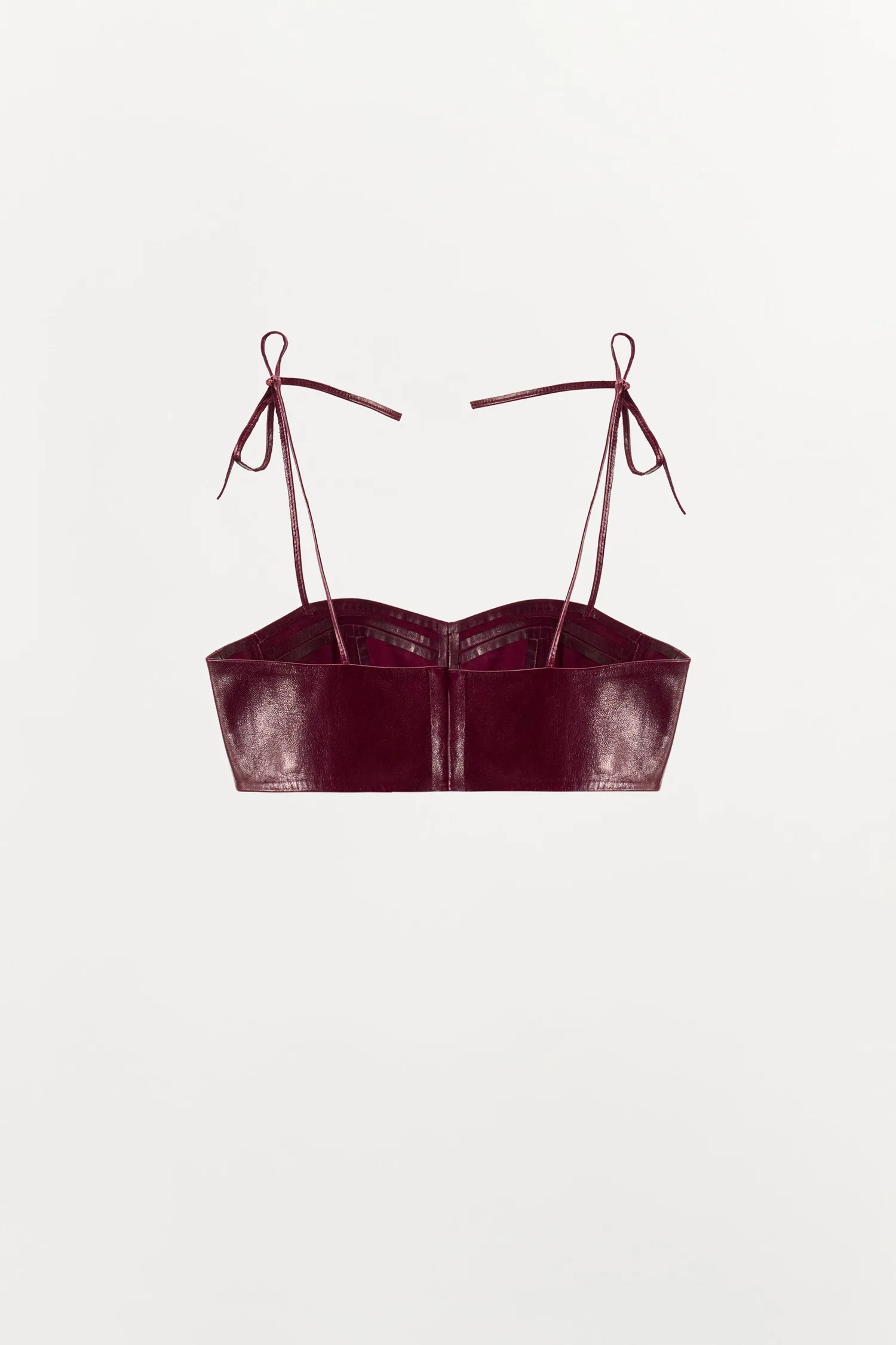 Мини-топ из ткани, изготовленной из 100% натуральной кожи. Имеет вырез в форме сердца и регулируемые тонкие бретельки с завязками. Выразительные швы. Застегивается сзади на потайные металлические крючки.