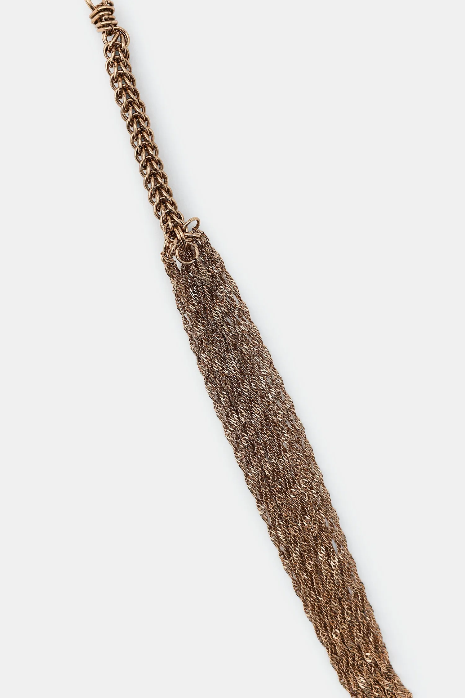 Длинное двойное ожерелье с множеством металлических звеньев разной формы и размера.