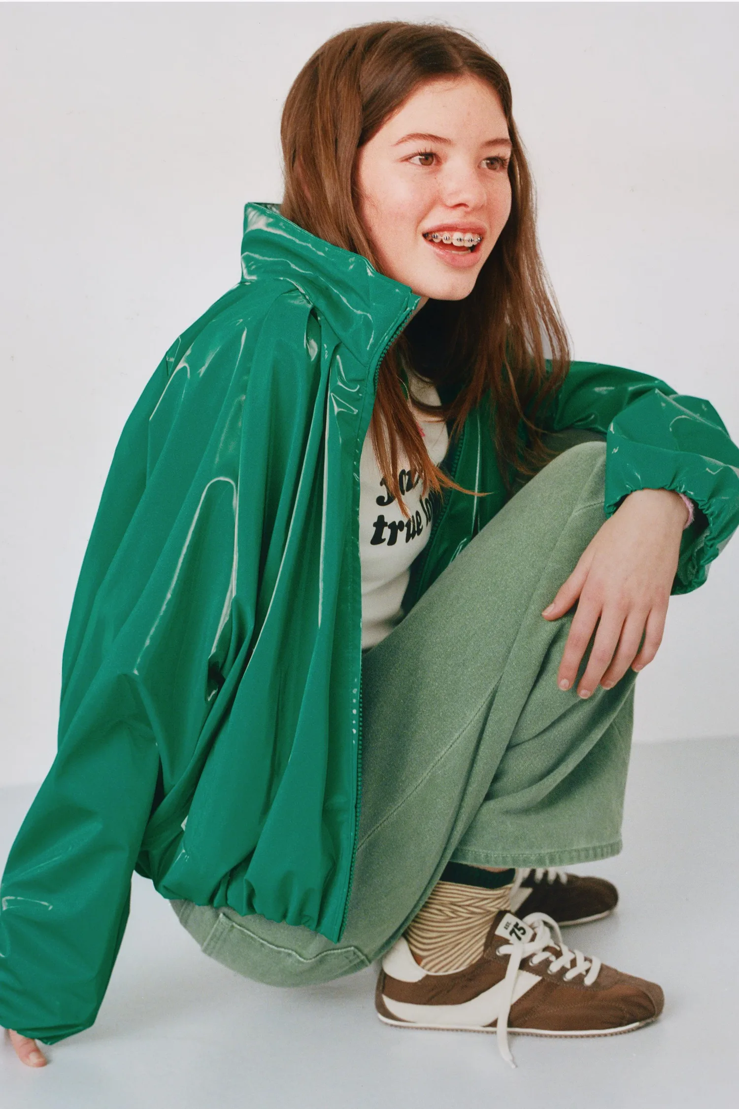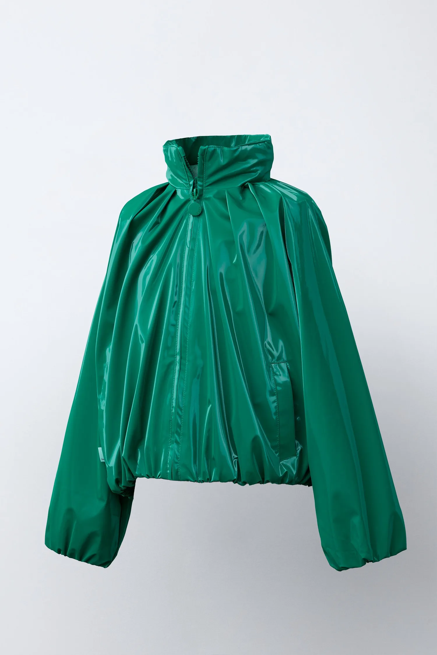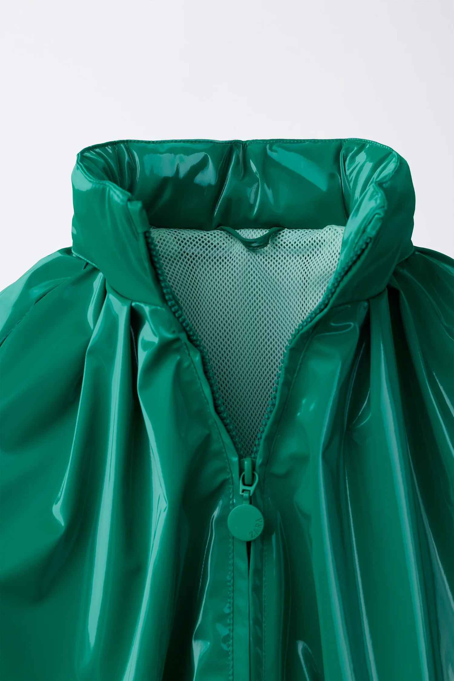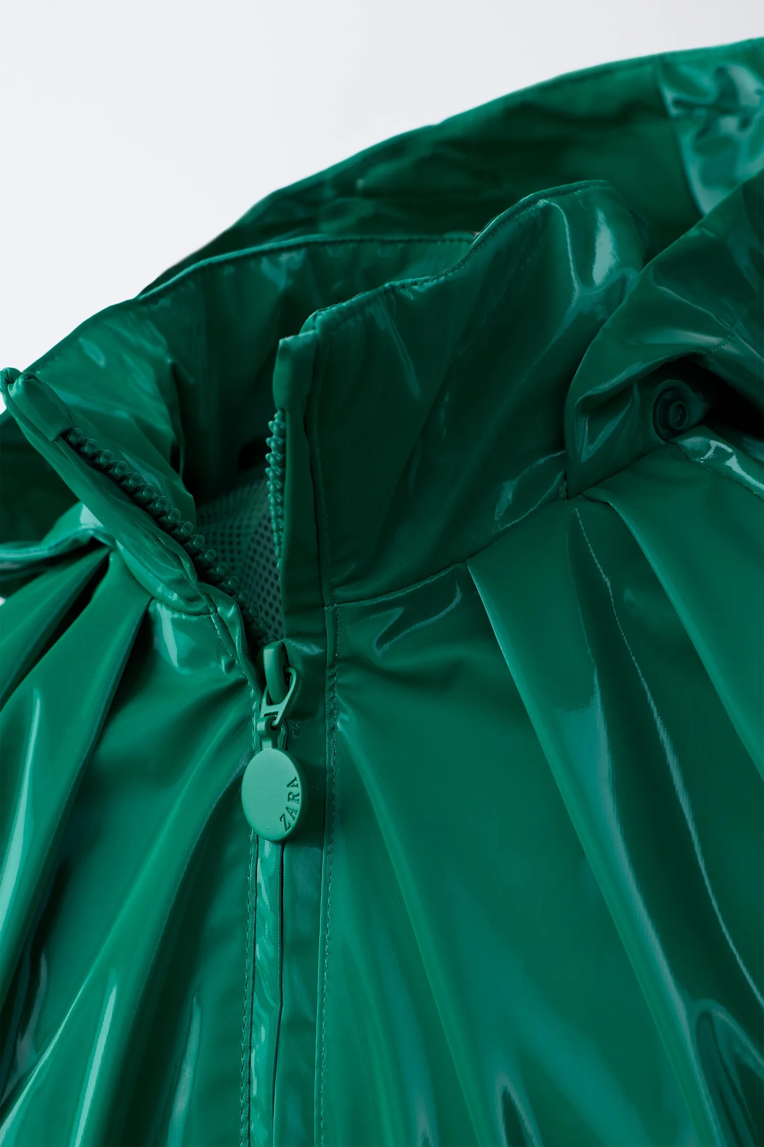 Дождевик из специальной водоотталкивающей ткани, с капюшоном, скрытым пуговицами, и длинными рукавами с эластичными манжетами. Эластичный низ. Застежка на молнию и передние карманы с кантом.