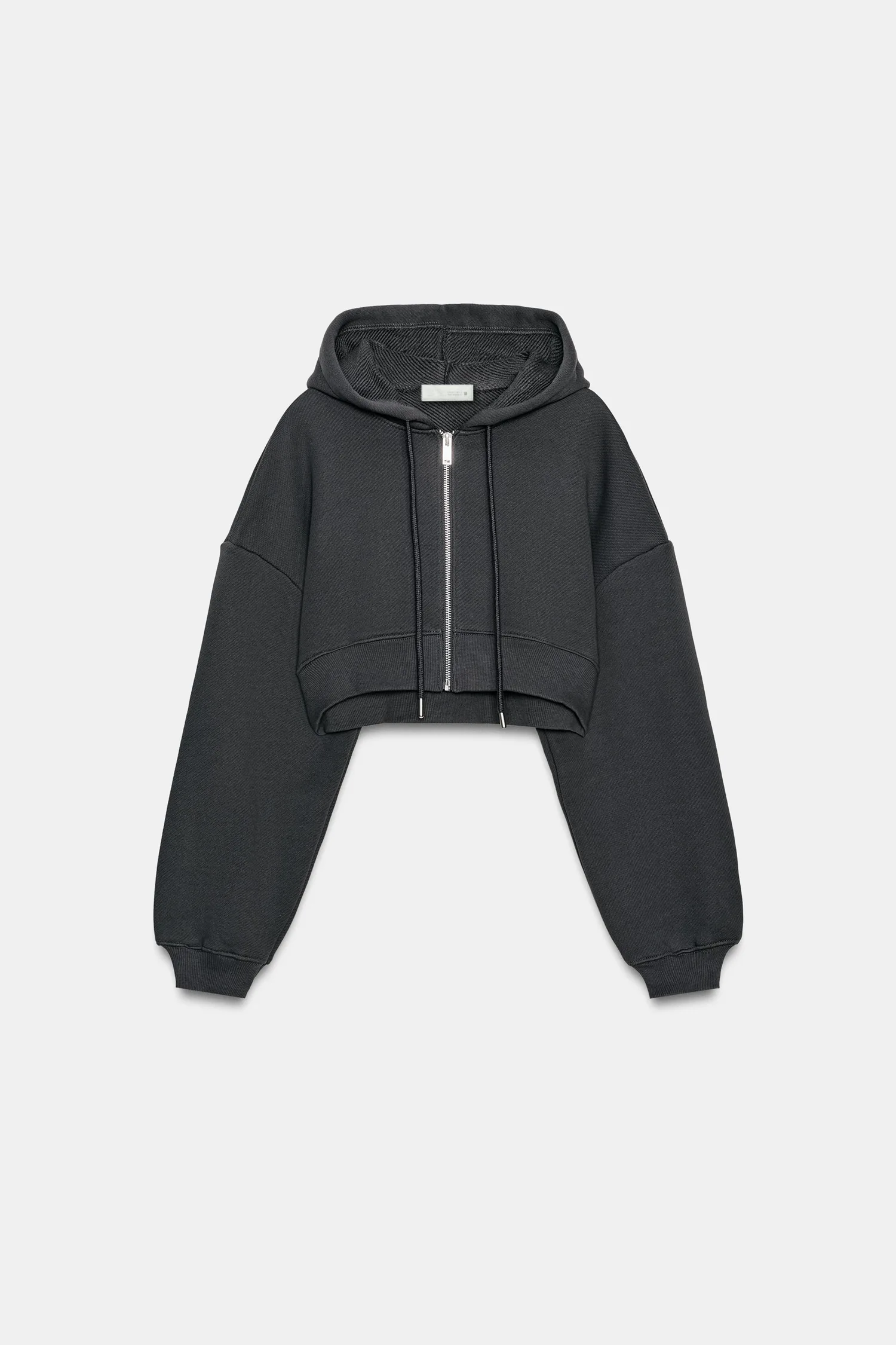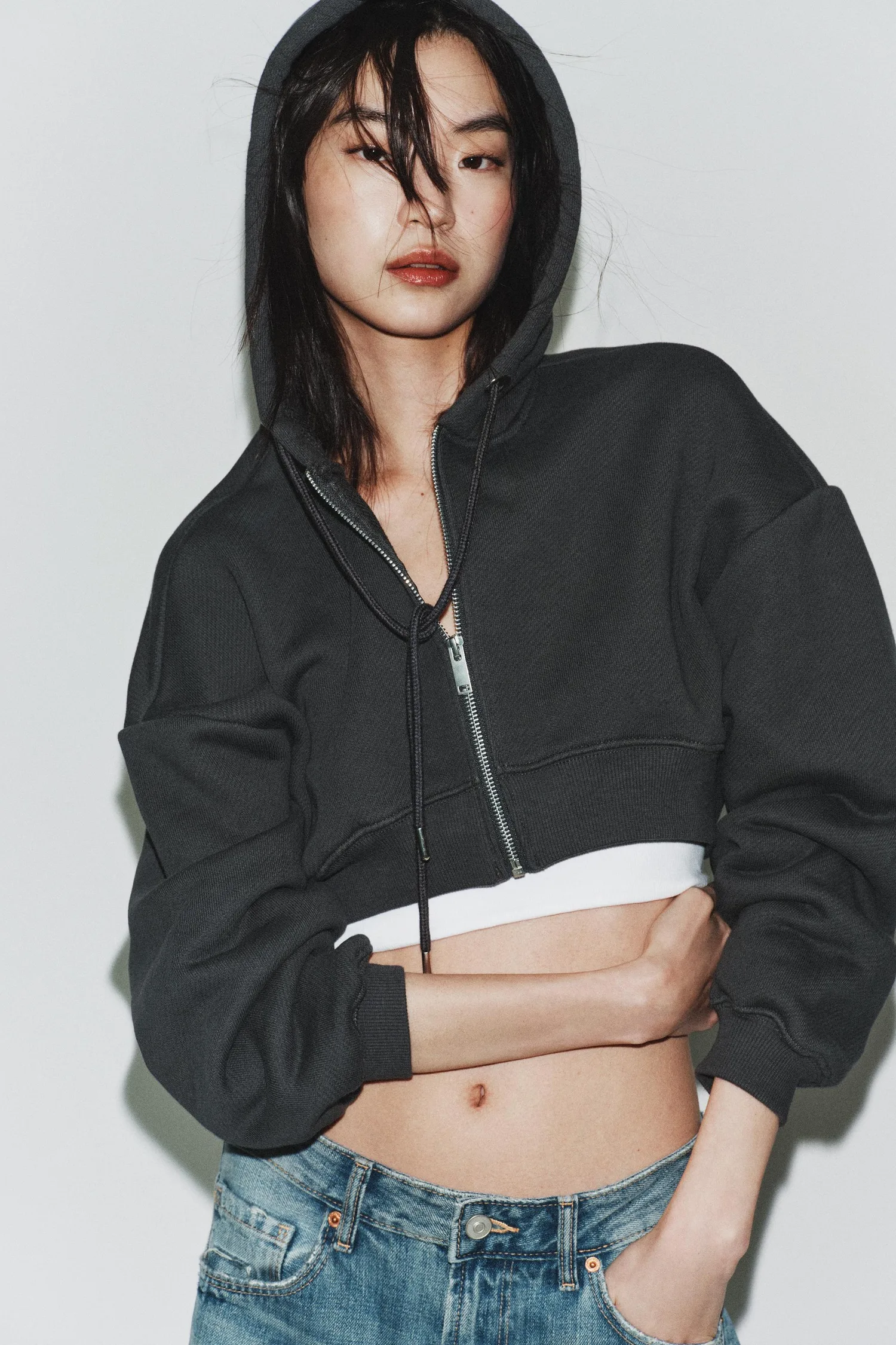 Короткая толстовка из хлопковой пряжи. Круглый вырез и регулируемый шнурок на капюшоне. Ребристые манжеты в тон. Металлическая молния спереди.